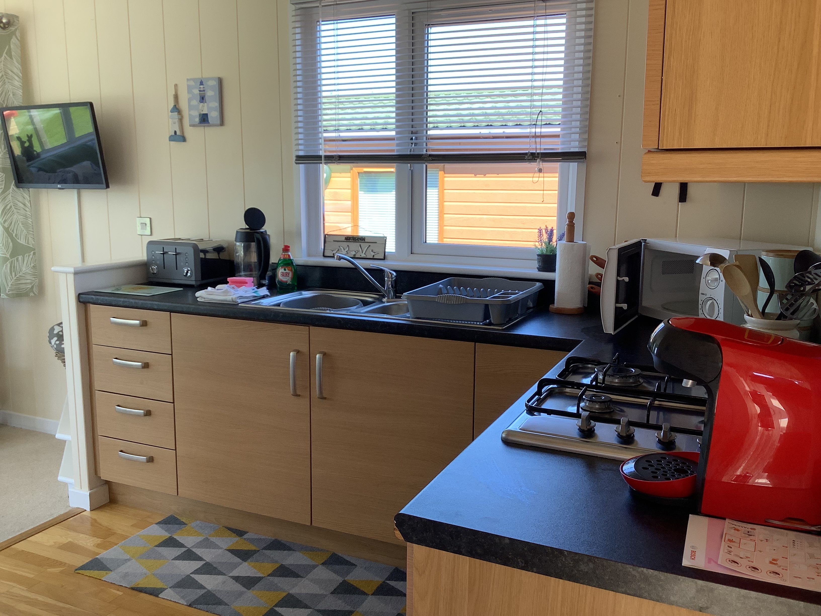 Gas central heating. Electric oven, gas hob, microwave, fridge/freezer, kettle, toaster. Smart TV, WiFi. Fuel and power inc. in rent. Bed linen and towels inc. in rent. Highchair and travel cot available on request. Off road parking for one car next to lodge, further parking near reception. Decking area with ramp for easy access and furniture. One well-behaved dog welcome. Sorry, no smoking. Property accepts a minimum of 3 nights Shop 2.4 miles, pub 0.1 miles, beach 2.7 miles. Convenience store opening on the park at Easter