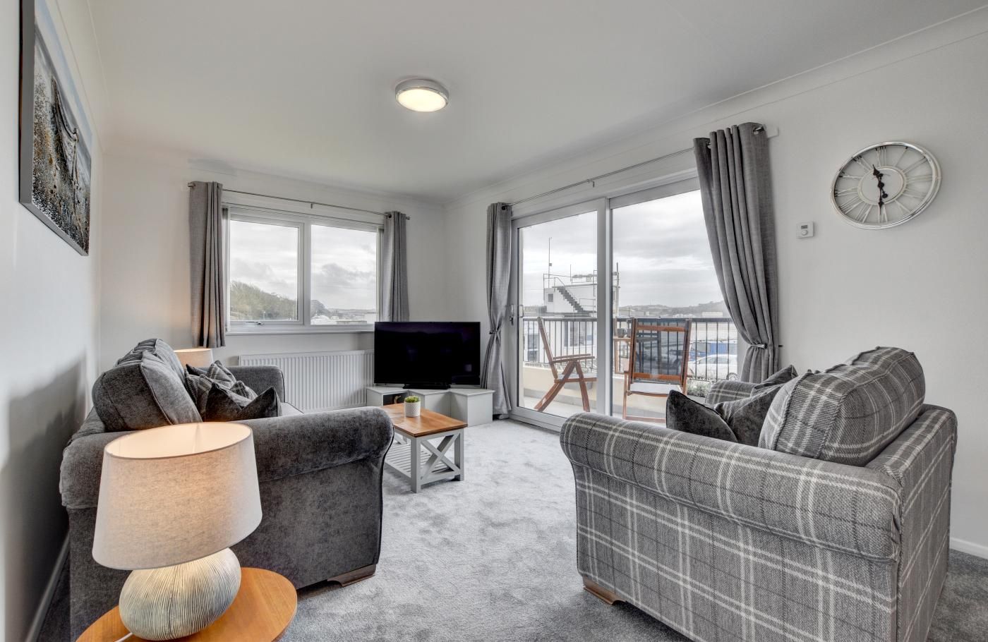 The interior of the apartment has been decorated tastefully, with comfortable furnishings and coastal hues of blue to complement the waterside location.