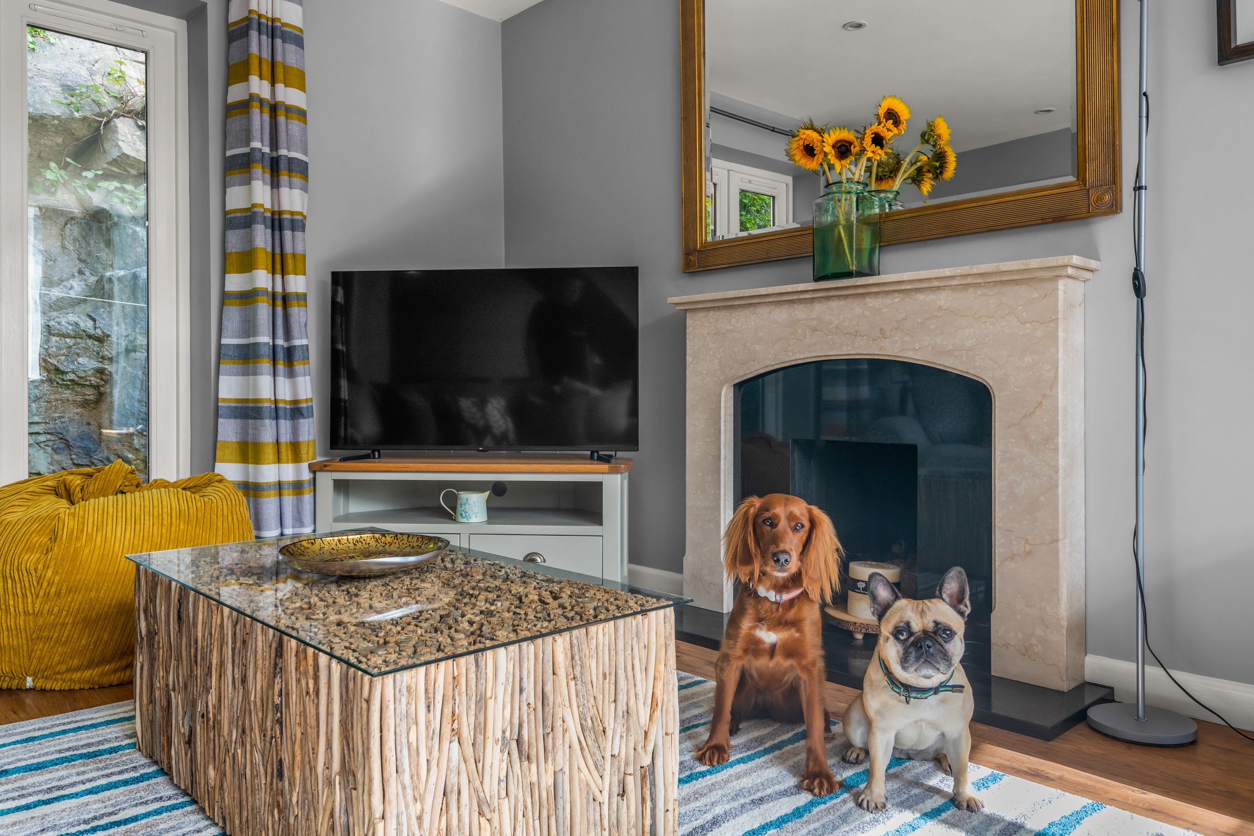 Two bedrooms: 1 x king-size, 1 x double with Smart TV. Upstairs bathroom with bath, shower over, basin, heated towel rail, WC. Downstairs bathroom with freestanding double shower sink and WC. Open-plan living space with kitchen, dining area and sitting area