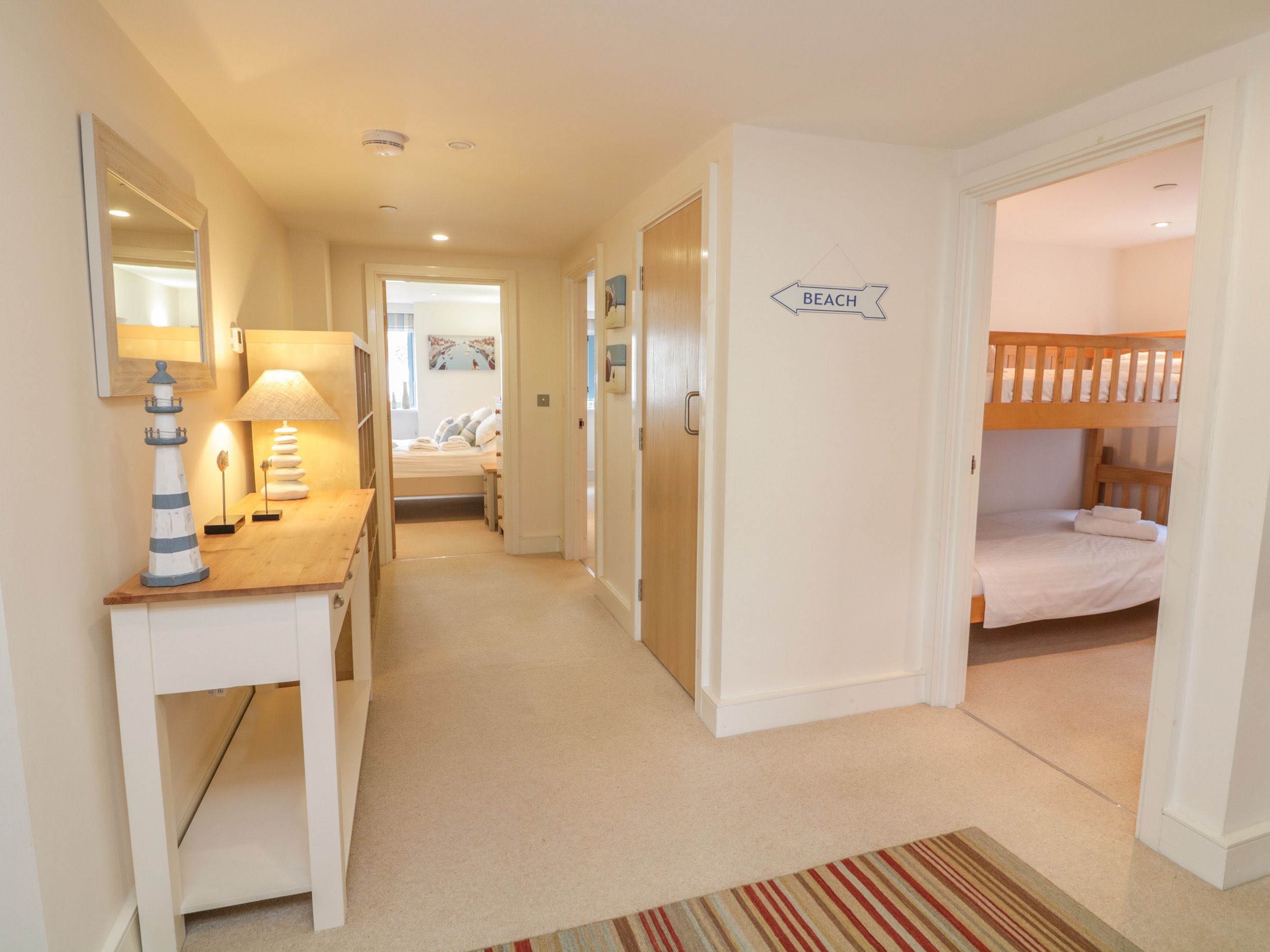 Accomodation Details Three bedrooms; 1 x king-size with an en-suite with walk-in shower, basin and WC, 1 x king-size, 1 x bunk room (children only). Bathroom with shower over bath, basin and WC. Open-plan living room with kitchen, dining area and sitting area. One well behaved dog permitted at £25 per week.