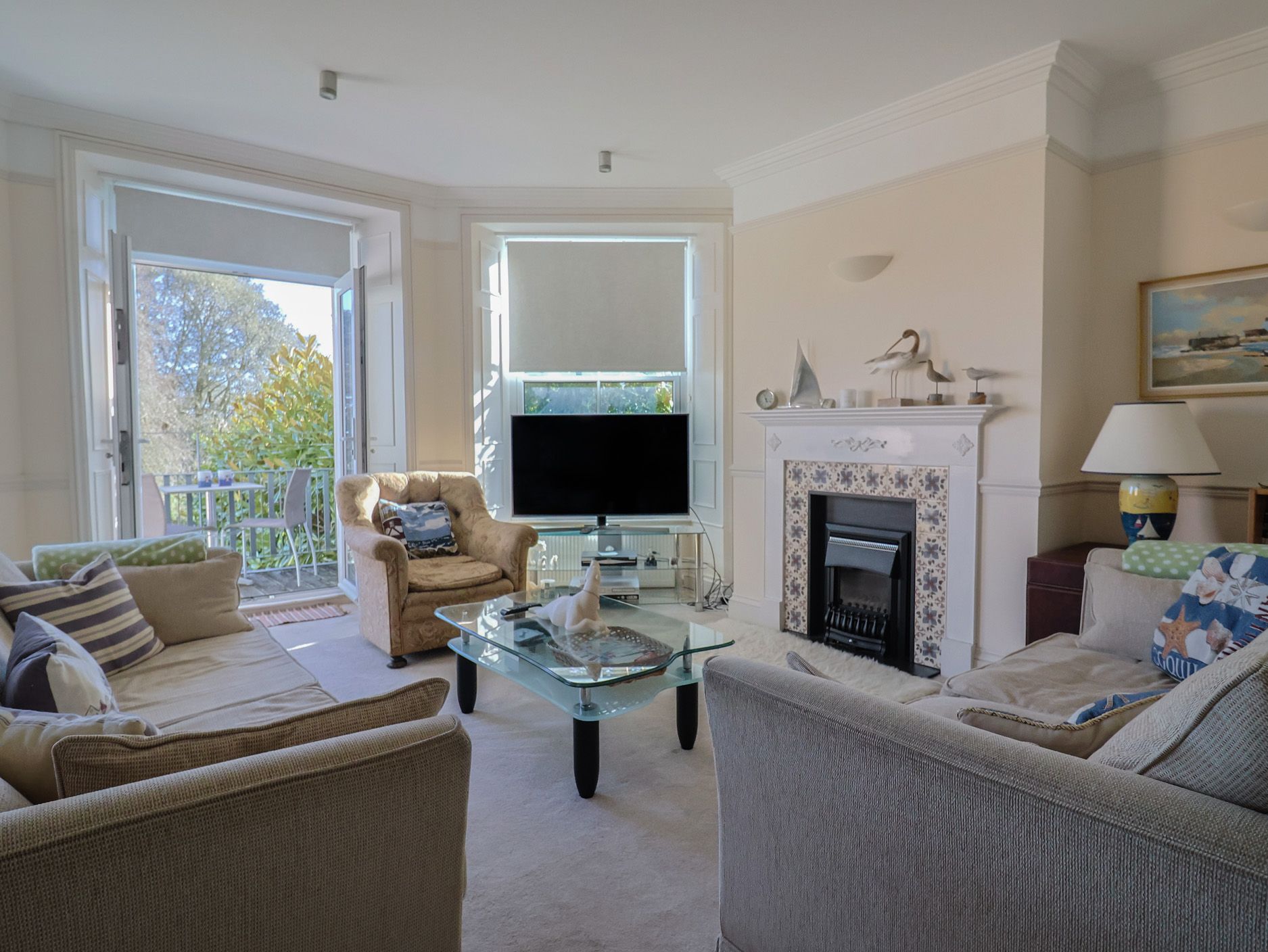 Accomodation Details First-floor apartment. Two bedrooms: 1 x king-size with Juliette balcony and en-suite walk-in shower, basin, and WC, 1 x twin. Bathroom with bath, shower over, basin, and WC. Open-plan living space with kitchen, dining area, and sitting area with balcony