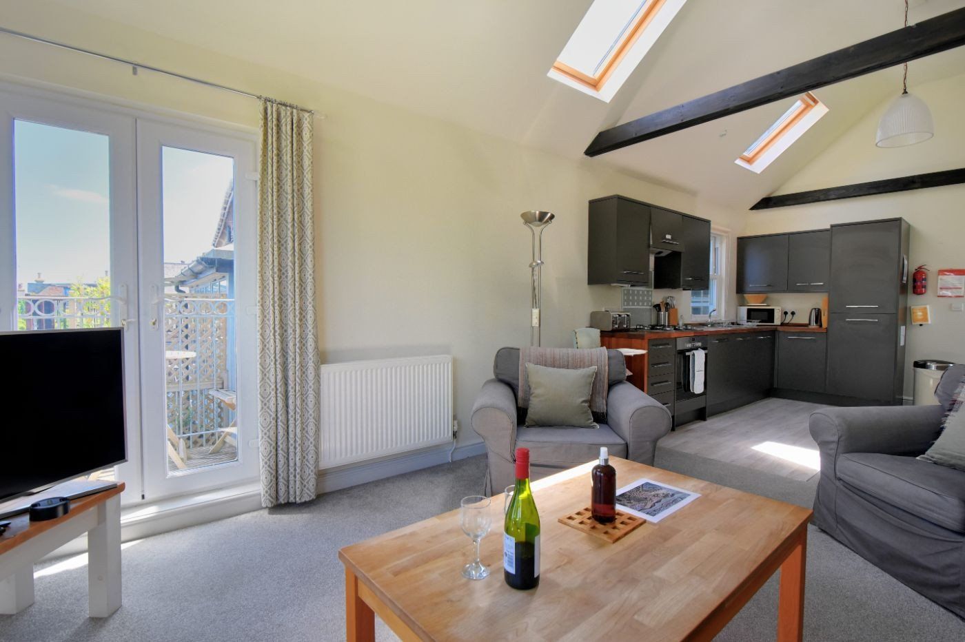 Accomodation Details Duplex apartment set over first and second floor. Two bedrooms: 1 x second-floor king-size with en-suite shower-room with walk-in shower, basin and WC, 1 x first-floor twin. First-floor bathroom with bath, walk-in shower, basin and WC. Open-plan living area with kitchen, dining area and sitting area