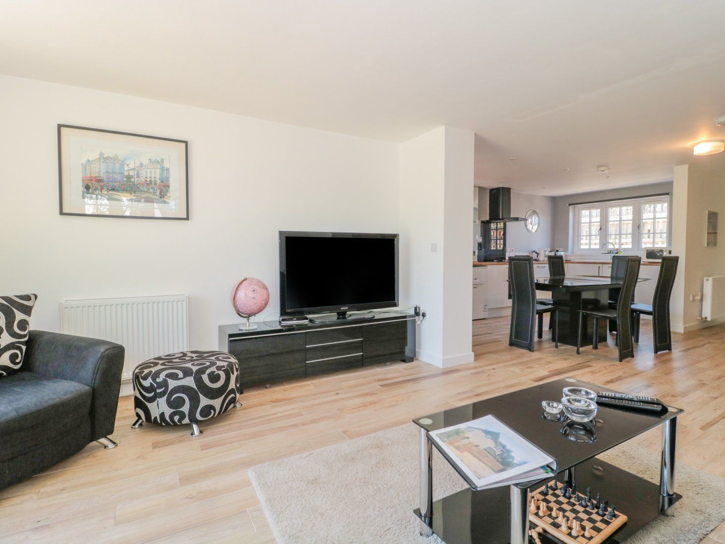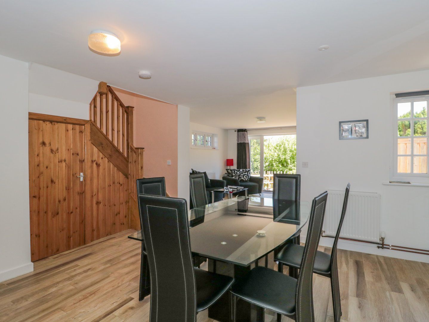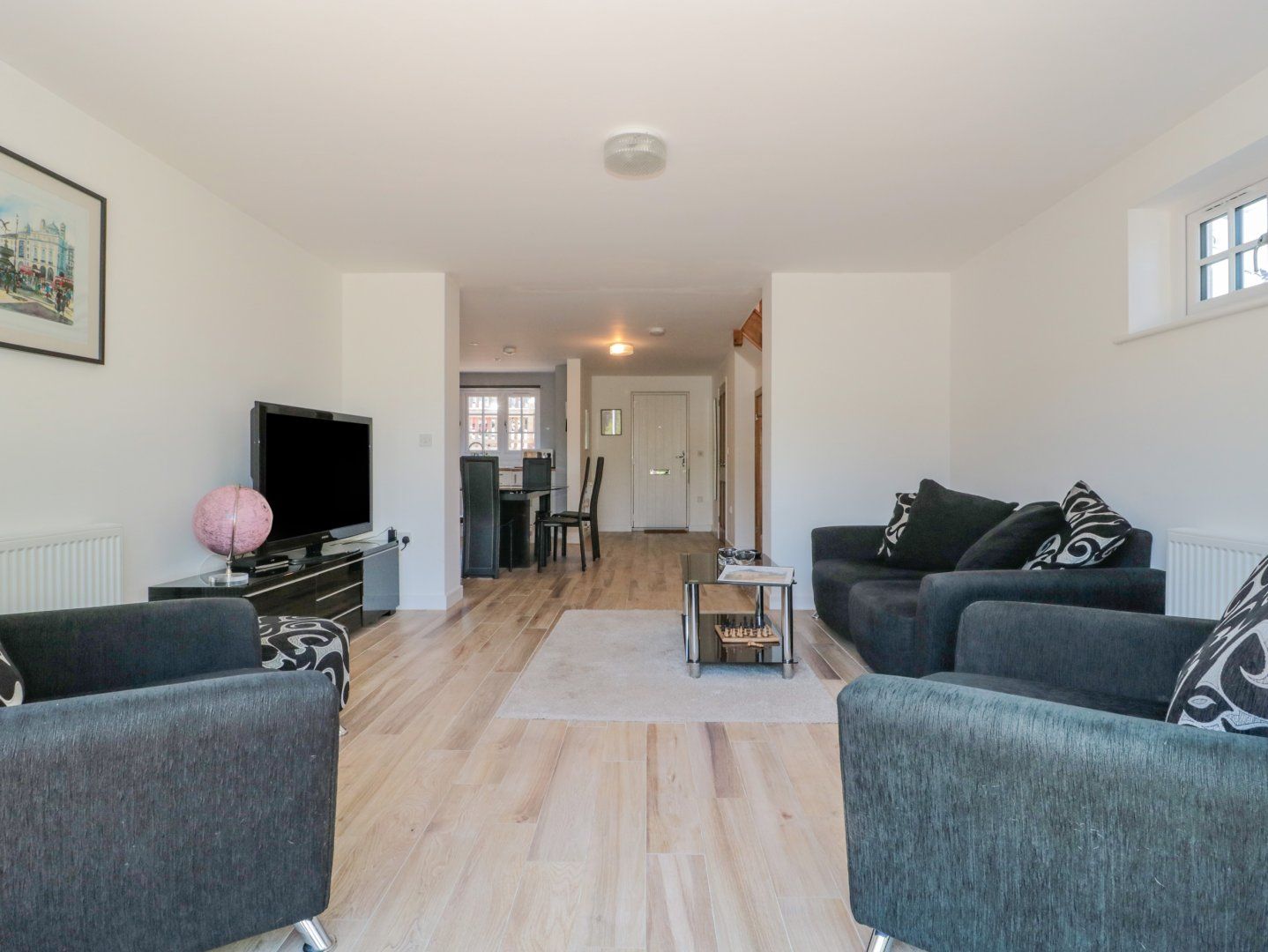 Two family bedrooms with double and single. Bathroom with bath, walk-in shower, basin, heated towel rail and WC. Cloakroom with basin and WC. Open-plan living space with kitchen, dining area and sitting area