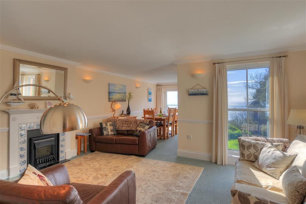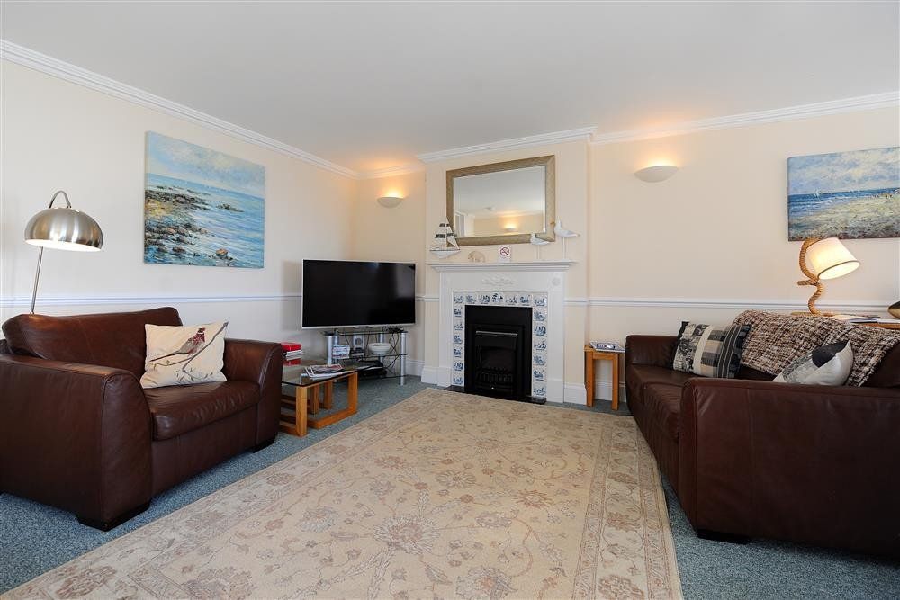 First-floor apartment. Two bedrooms: 1 x double, 1 x family room with king-size and 3’ day bed. Bathroom with bath with shower over, basin and WC. Kitchen. Open-plan living space with dining area and sitting area