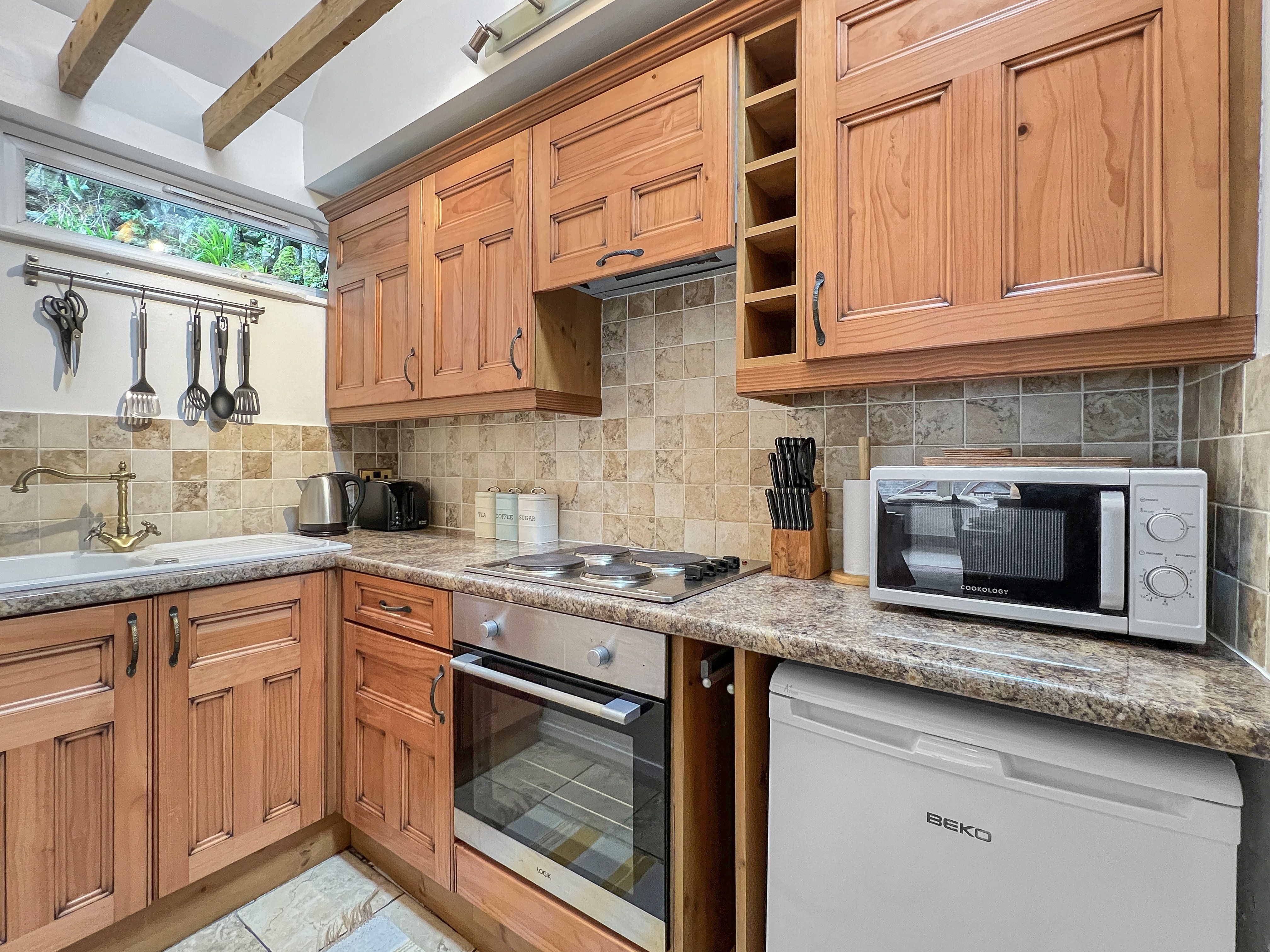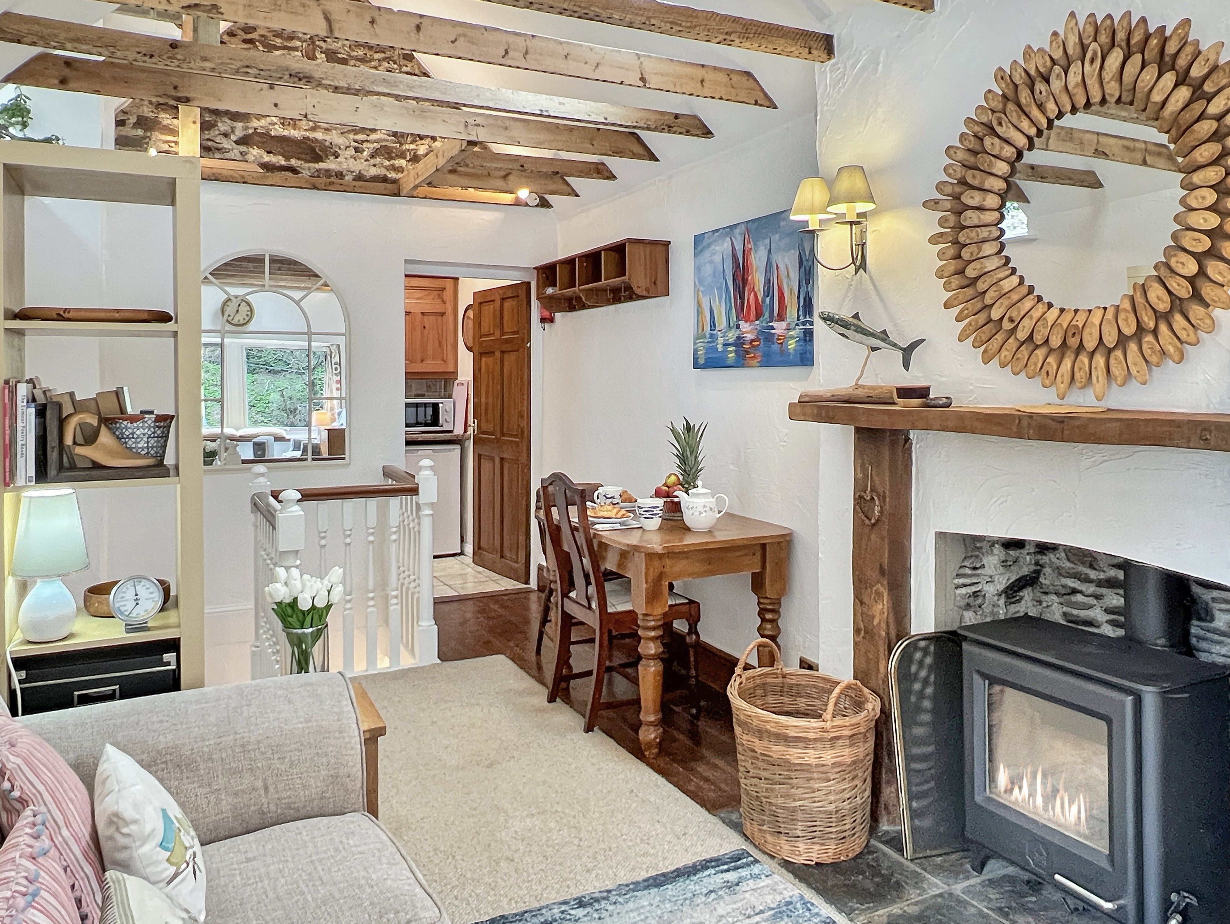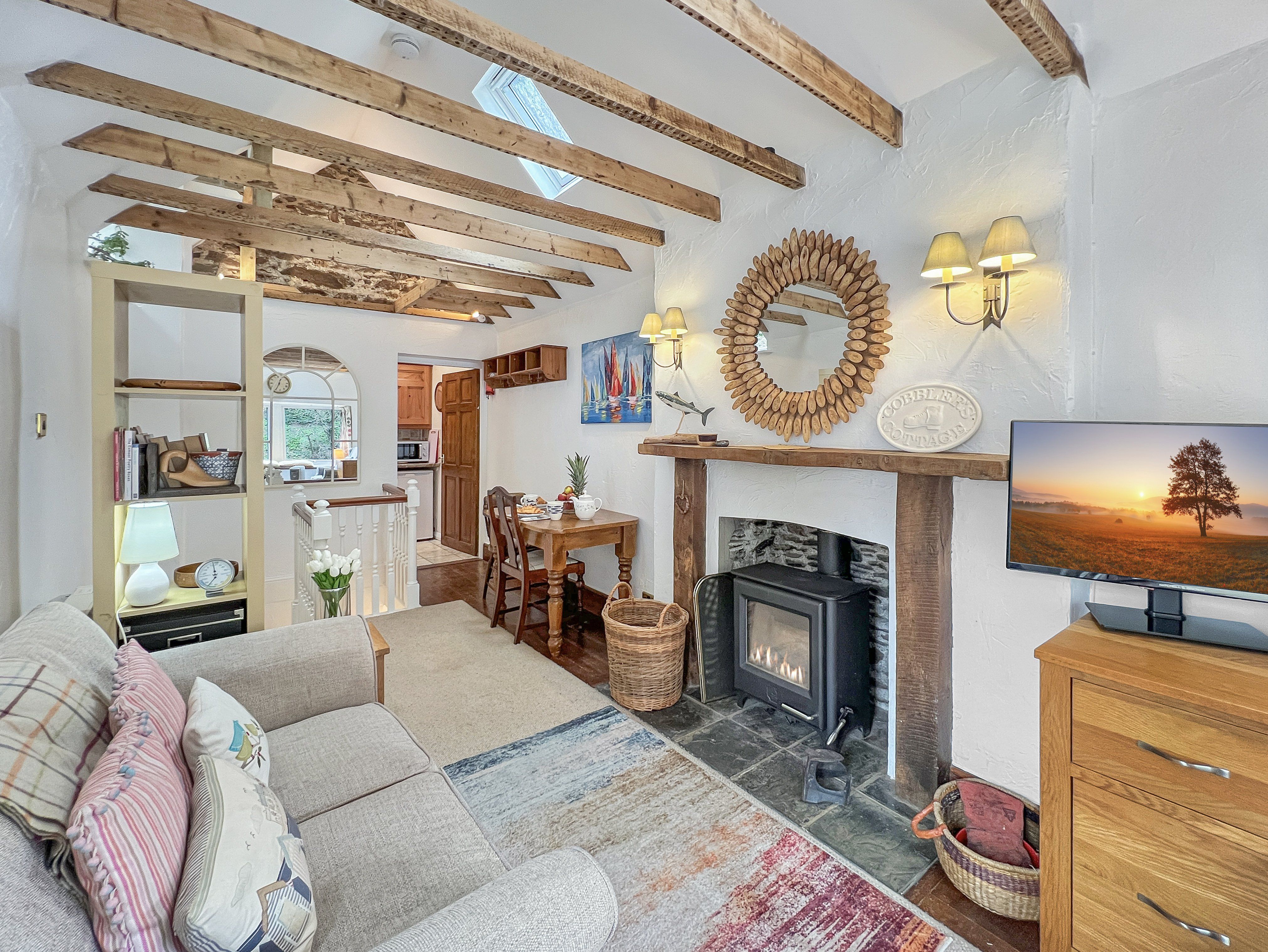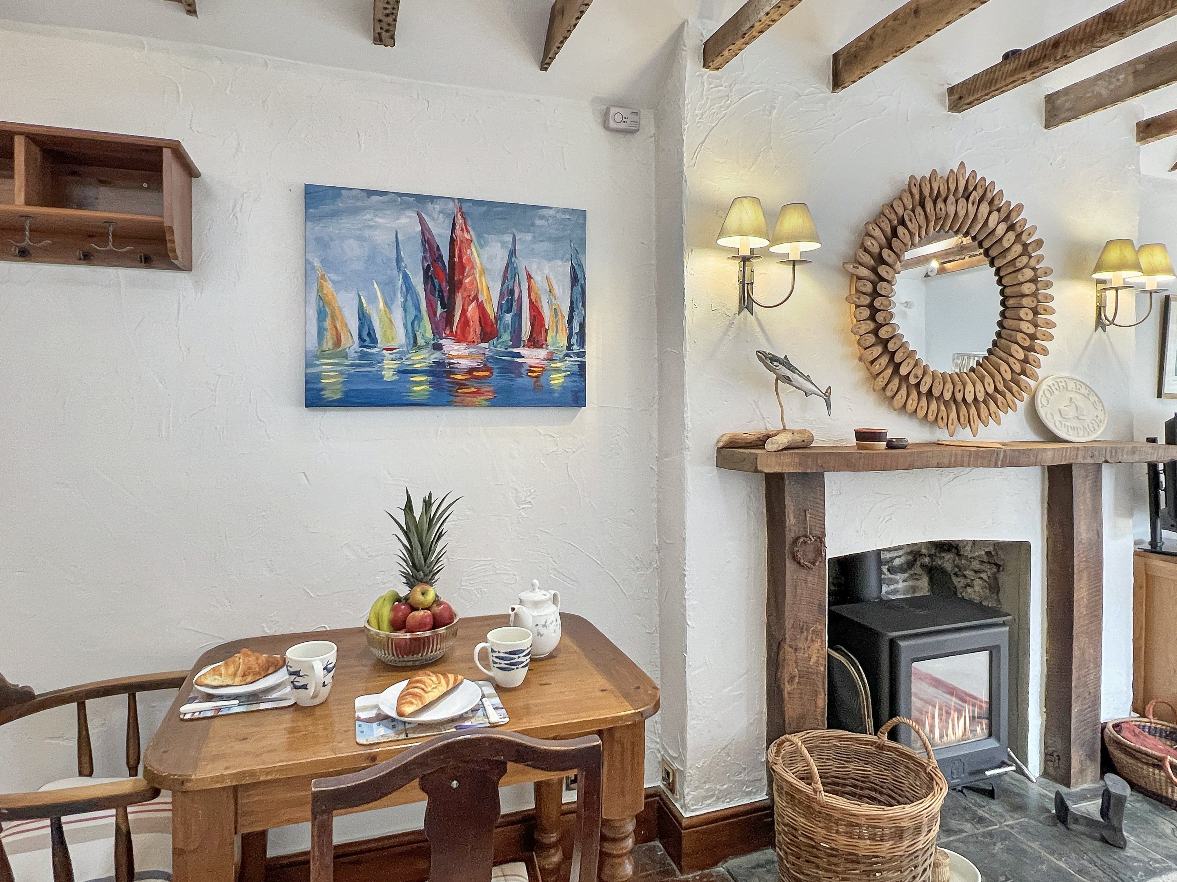 Facilities The kitchen at Cobblers Cottage is fitted with an electric hob, electric oven and microwave, and a fridge. Additional equipment includes a kettle, toaster and a selection of cookware, utensils, crockery, cutlery and glasses. There is a Freeview TV in the living room, and Wi-Fi is available throughout the property. The property has electric heating throughout and there is a wood-burner in the living room. Electricity and heating costs are included in the price of your stay. Please note that kindling and logs for the wood burner are not included and will need to be sourced locally. Bed linen and towels are provided. Please bring your own beach towels if you plan to take them away from the property. A welcome pack will be waiting for you on arrival, comprising of fresh milk, tea, coffee and newly baked cake.