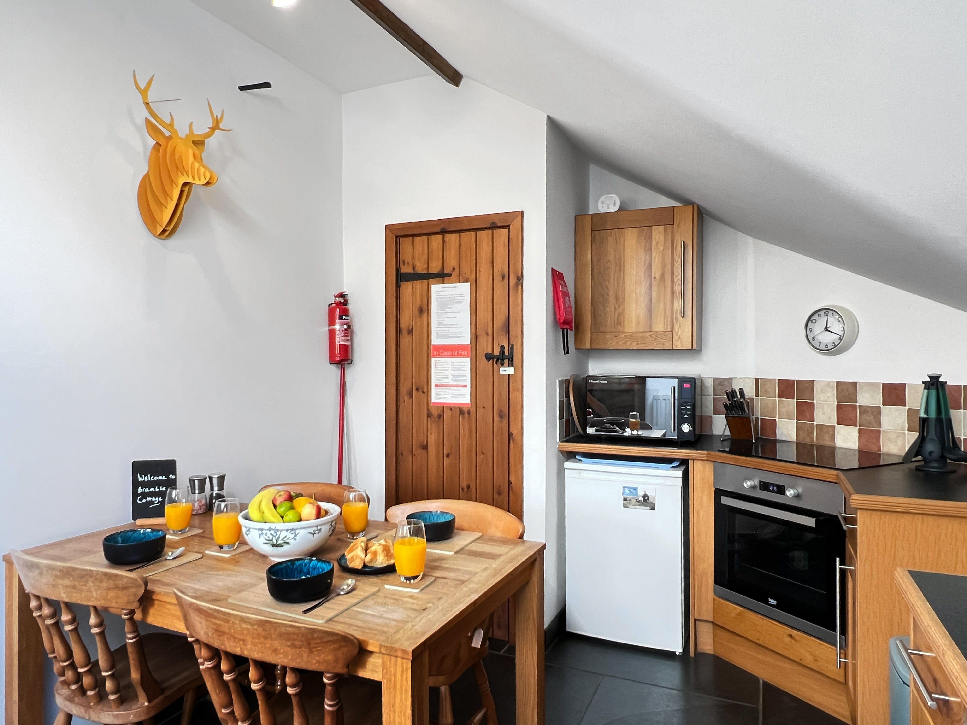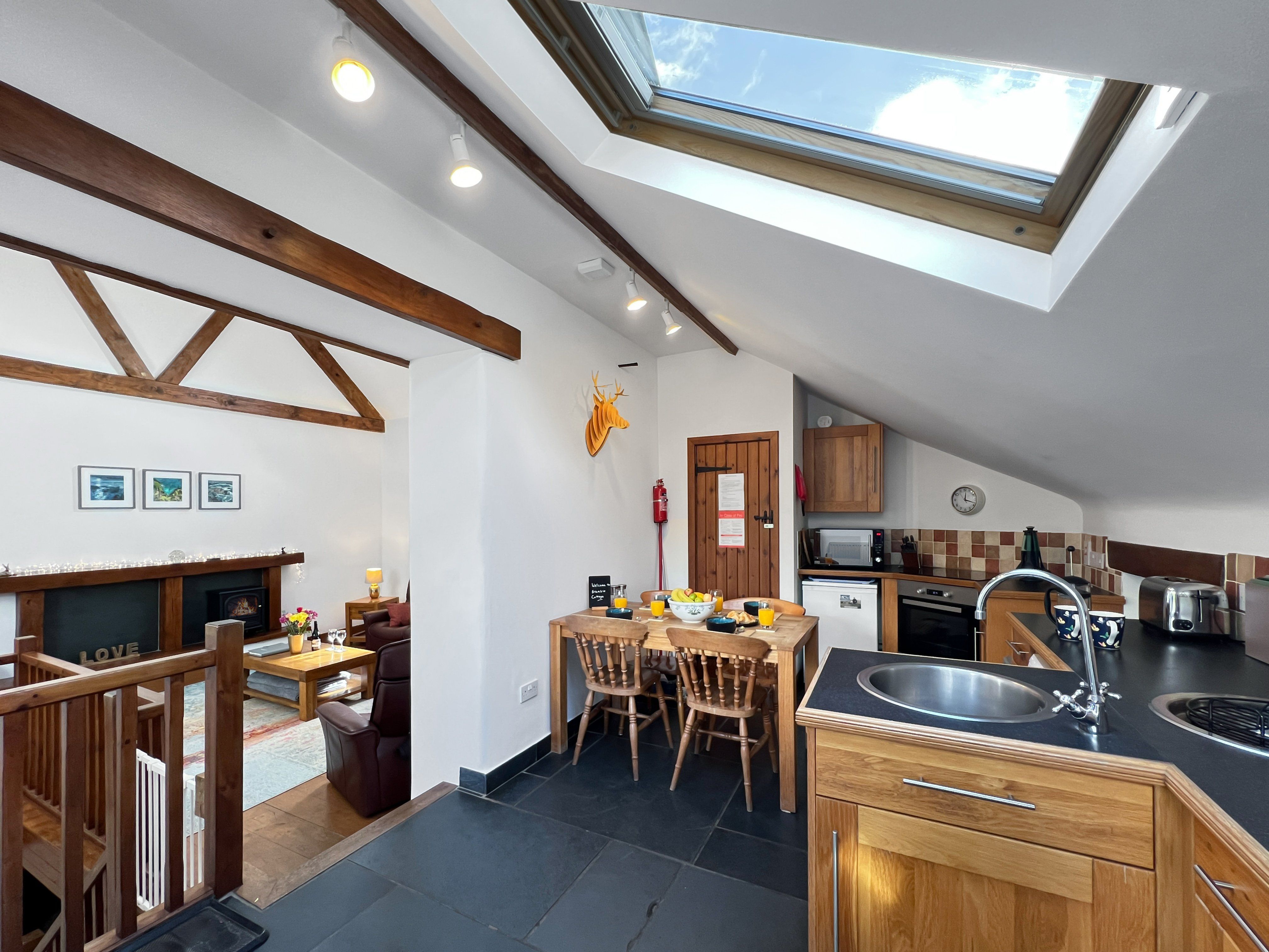 Facilities The well-equipped kitchen includes an under-counter fridge (with freezer compartment?), dishwasher, washing machine, microwave and electric oven plus hob. Other equipment includes toaster, kettle, a variety of cookware, kitchen utensils, cutlery, crockery and glasses. The dining table is located in the kitchen with 4 chairs The living area has three comfortable sofas set around the Smart TV and an electric flame-effect fire.