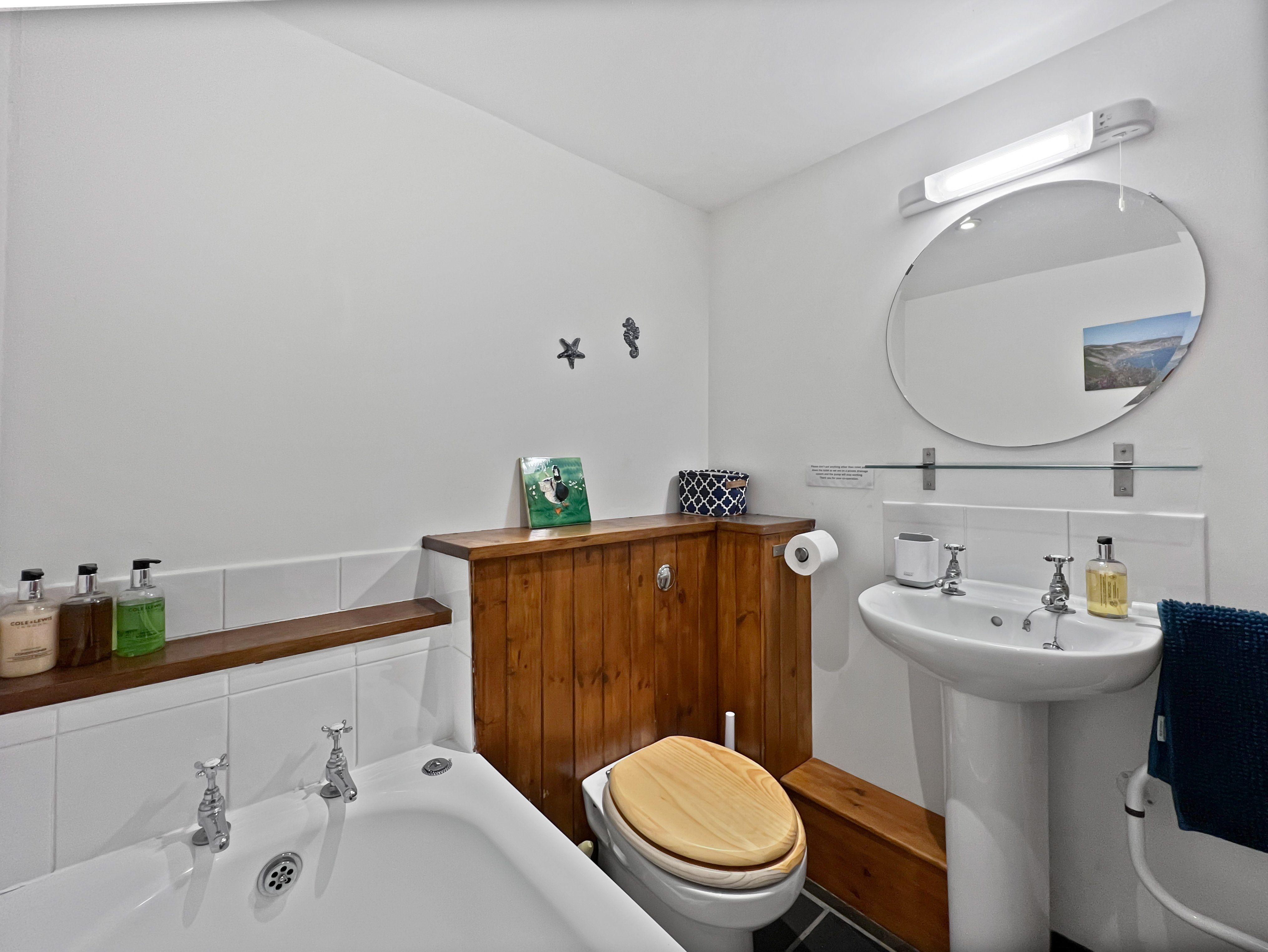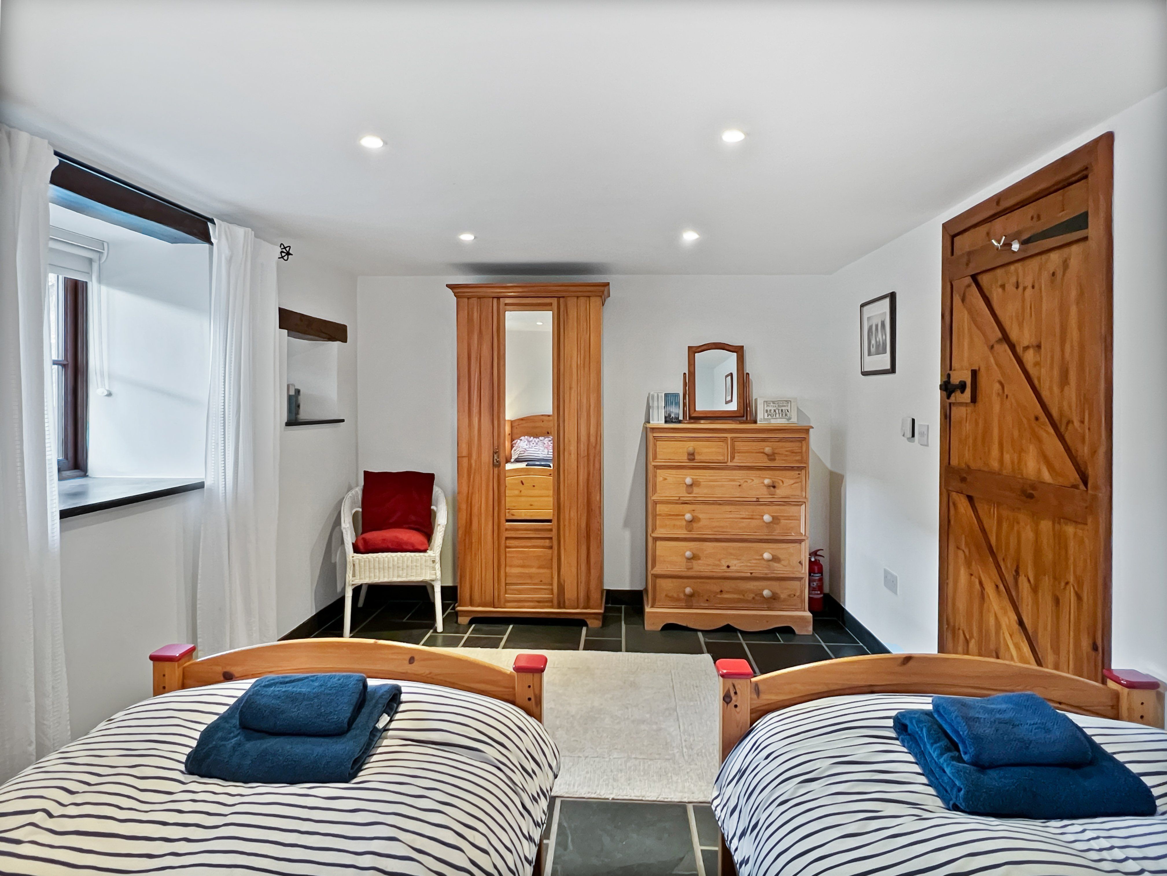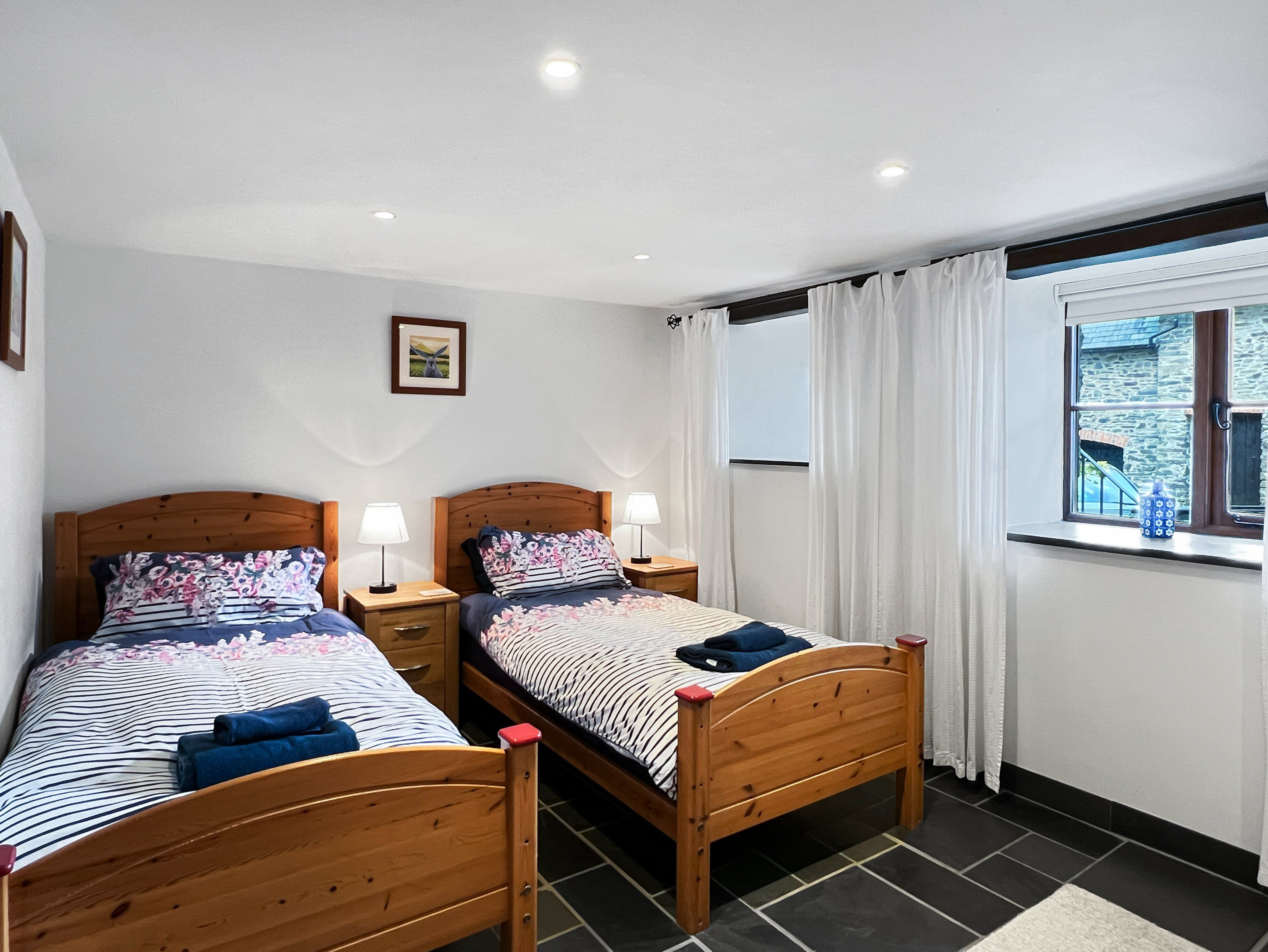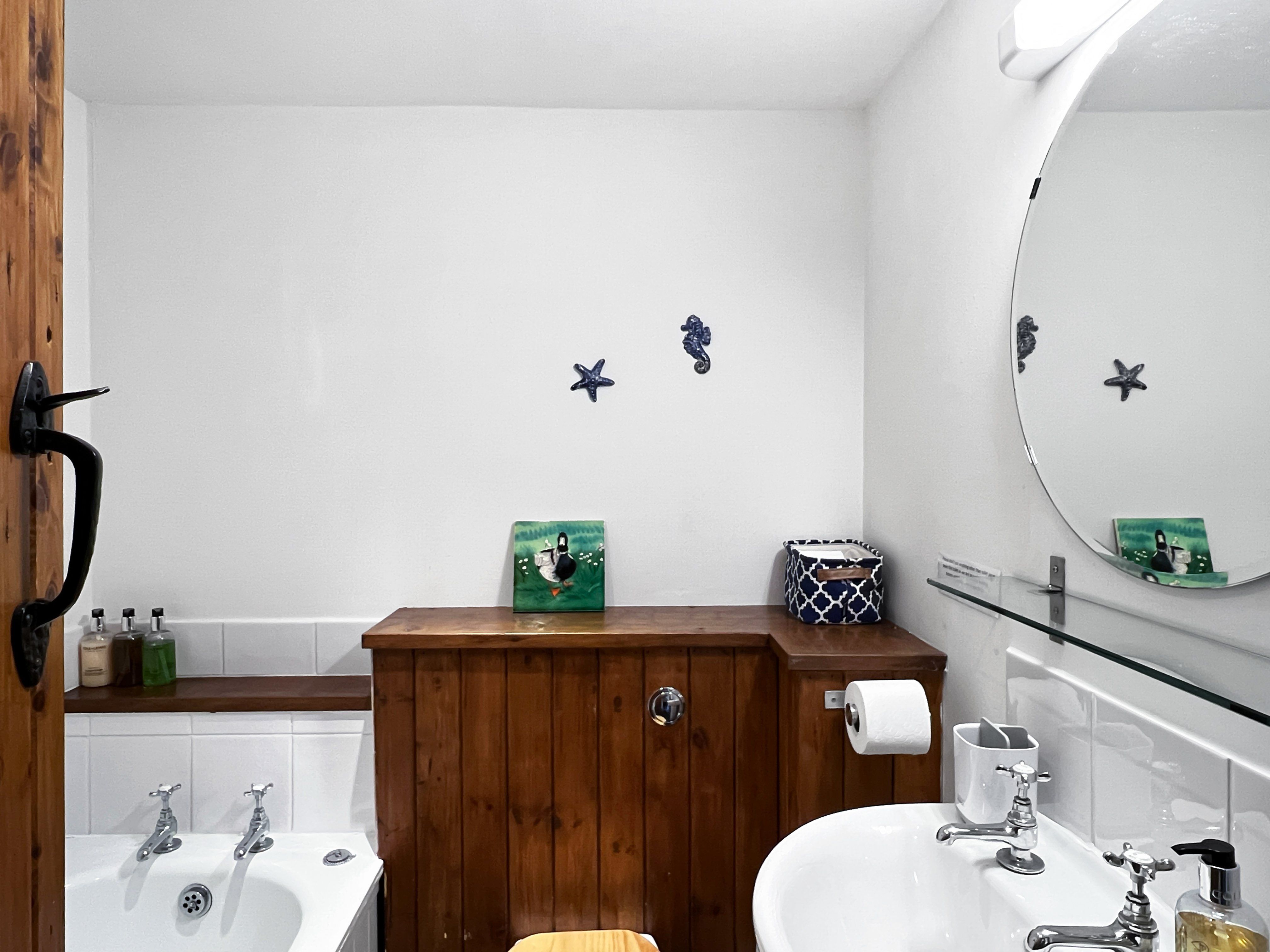 Stairs from the living area downstairs (there's a stair-gate fitted at the top of the stairs) to the bedrooms and bathrooms. There is a twin bedroom and family bathroom with bath, toilet and hand basin off the hall. The second bedroom is at the far end of the hall (up another 3 steps) it has a king size bed and en-suite shower room, also with toilet and hand basin.
