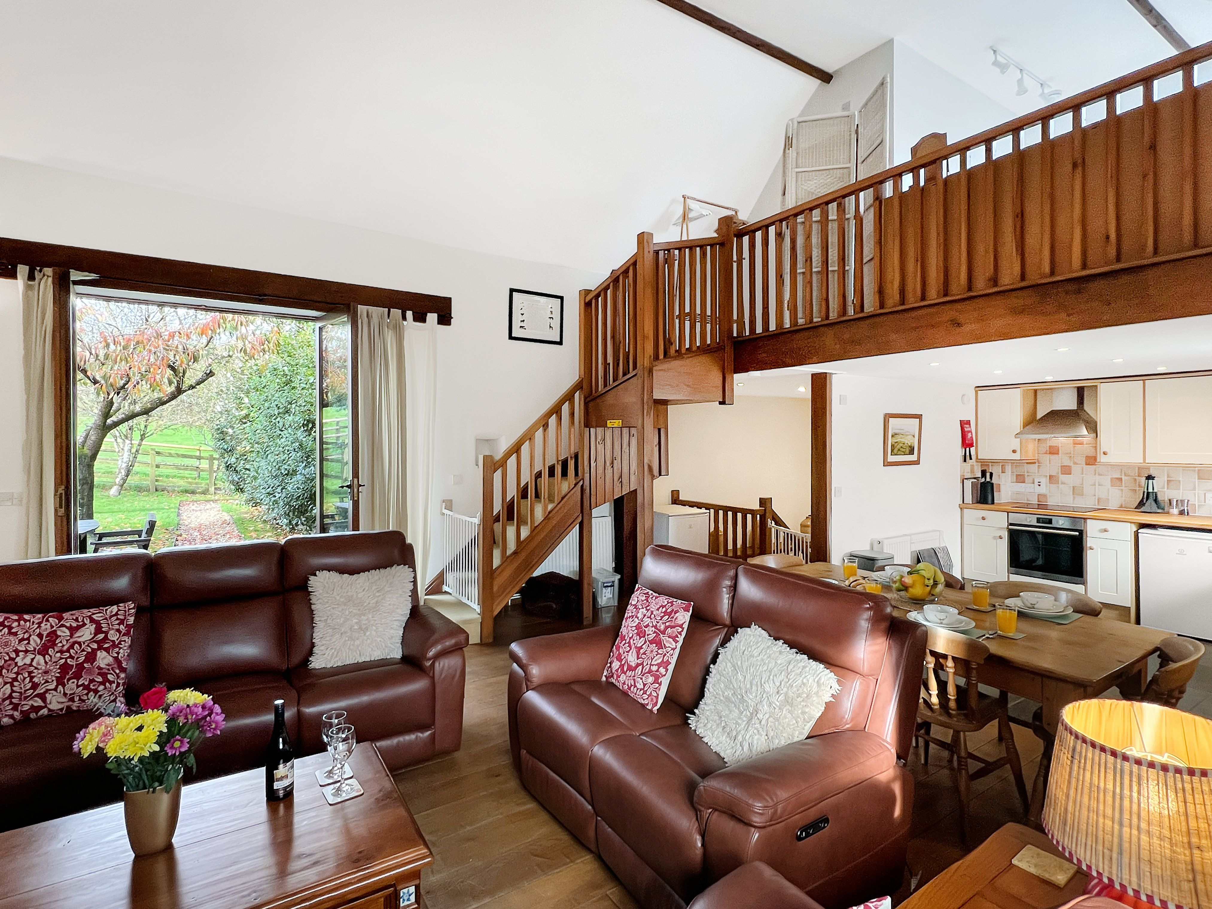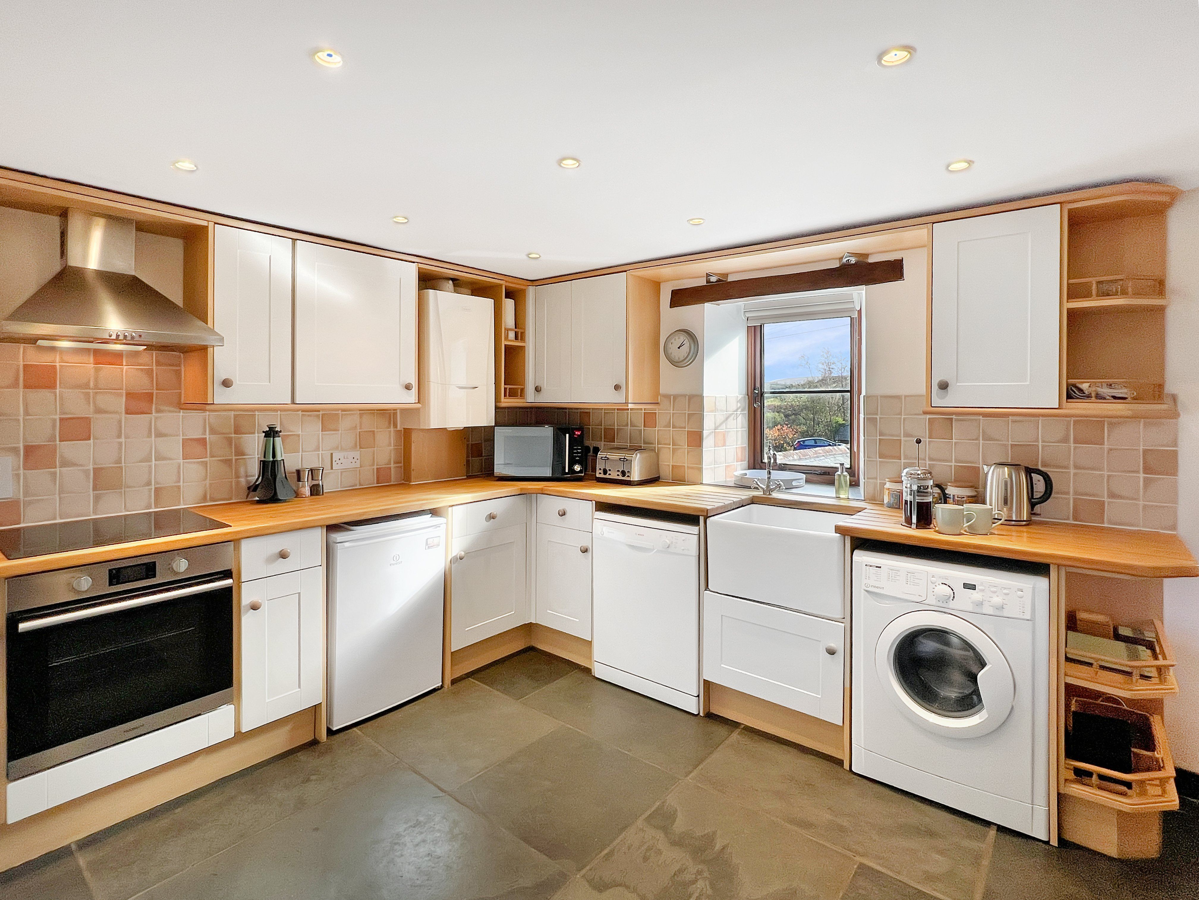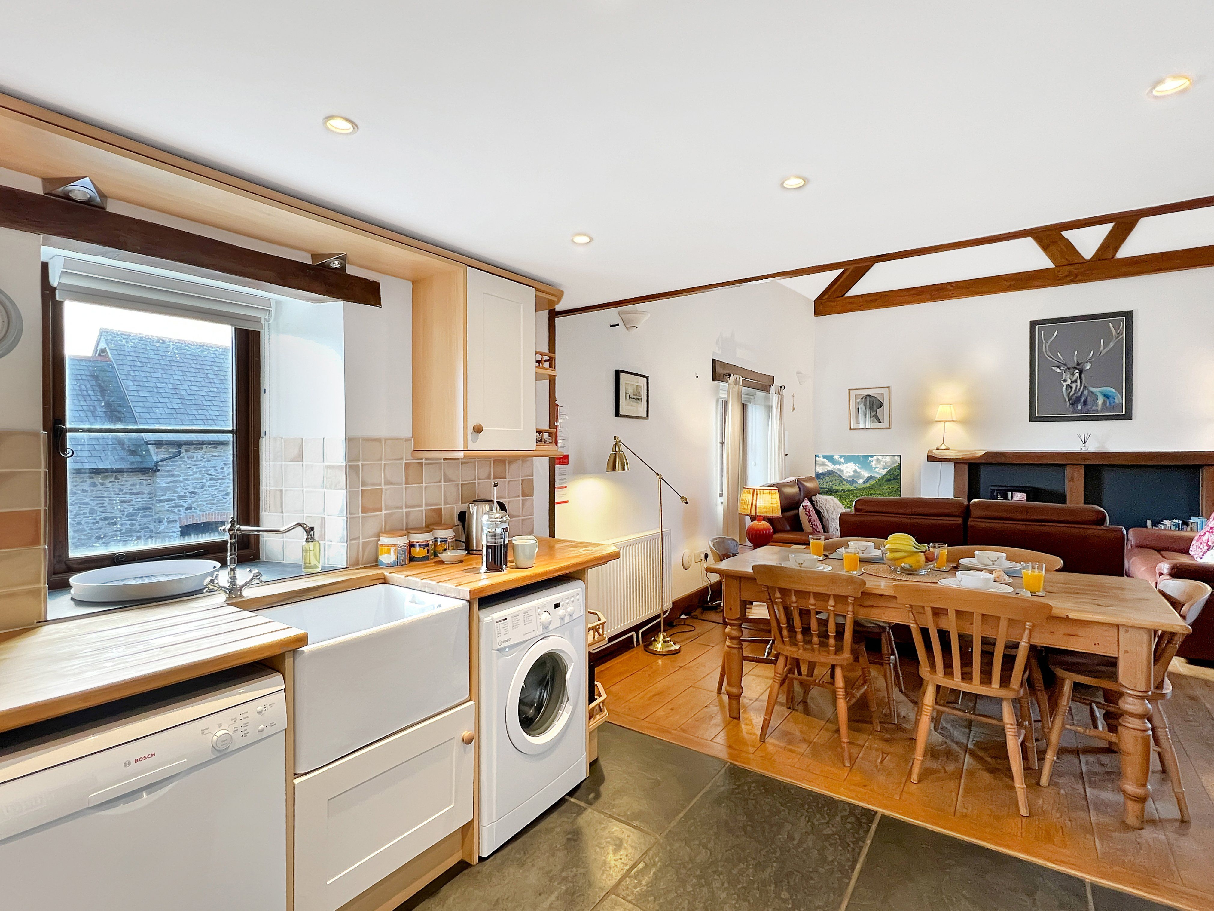 Facilities The well-equipped kitchen includes a fridge and freezer, dishwasher, washing machine, microwave and electric oven plus hob. Other equipment includes toaster, kettle, a variety of cookware, kitchen utensils, cutlery, crockery and glasses. The kitchen area is open-plan through to the farmhouse dining table, which has space for seating 6 guests with comfort. A high chair is available on request. The living area has three comfortable sofas set around the Smart TV and an electric flame-effect fire.