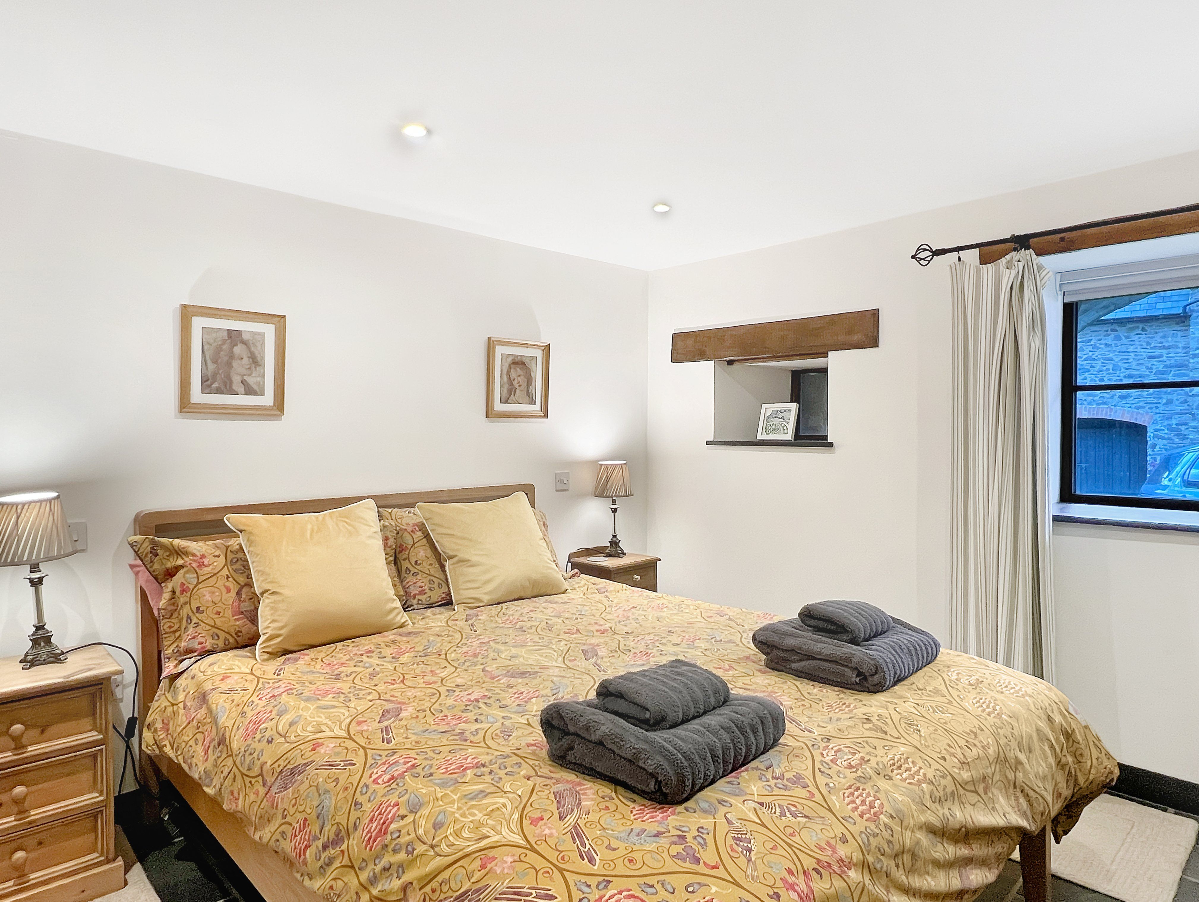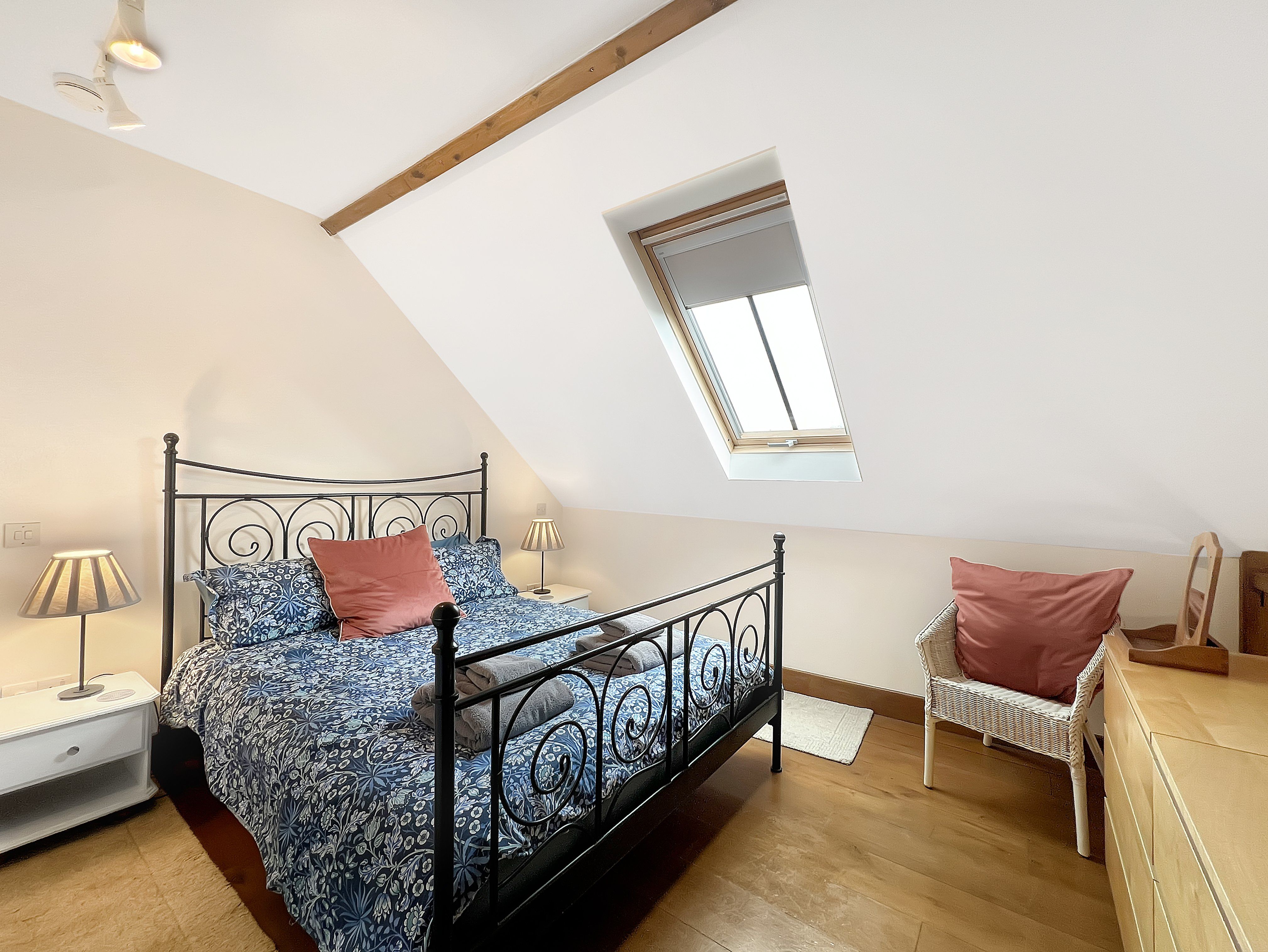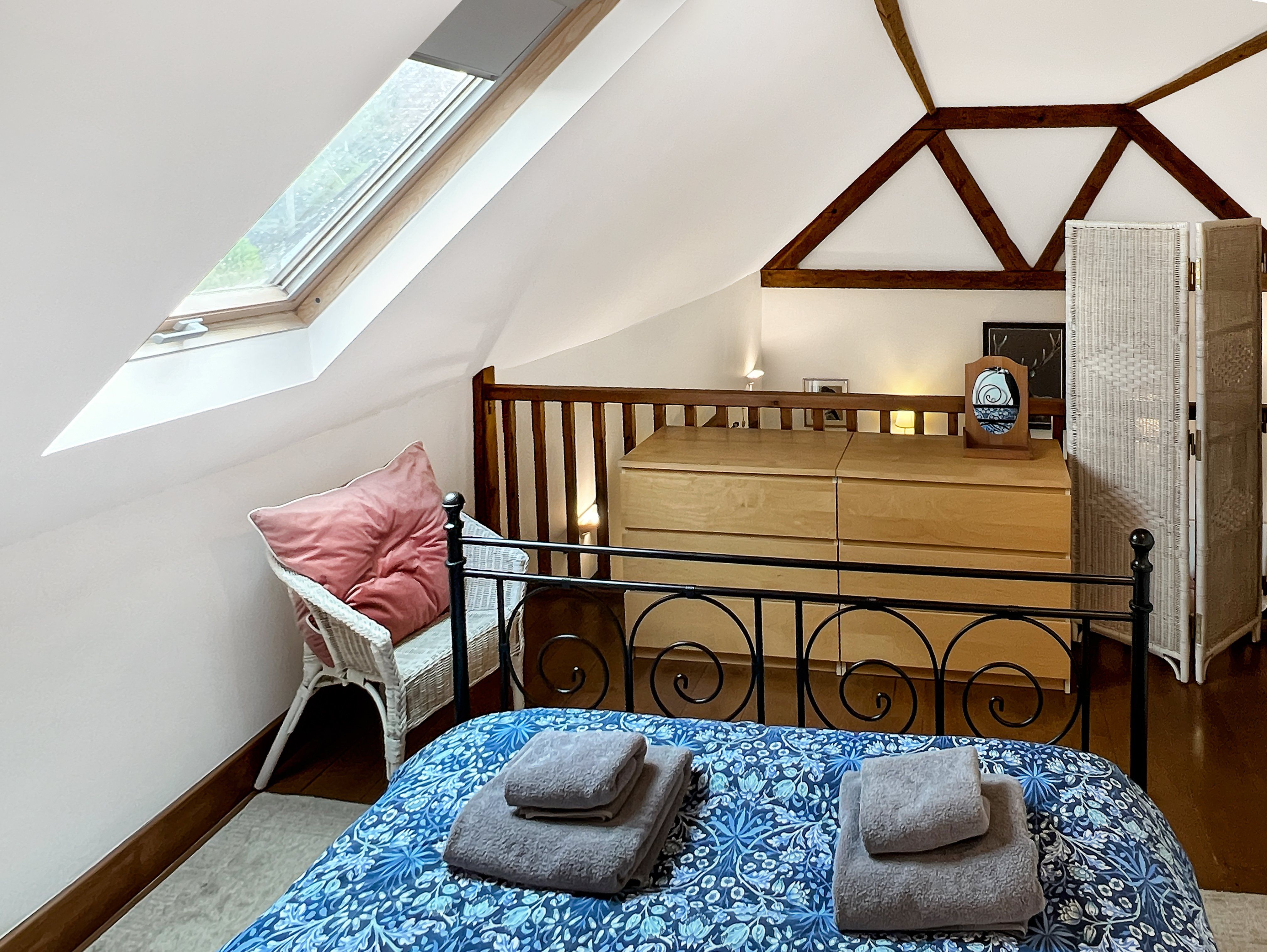 Stairs from the living area lead both upstairs and downstairs, there's a stair-gate fitted on the stairs. Upstairs is a mezzanine level overlooking the living area, where one of the king-size bedrooms is located along with an en-suite shower room.