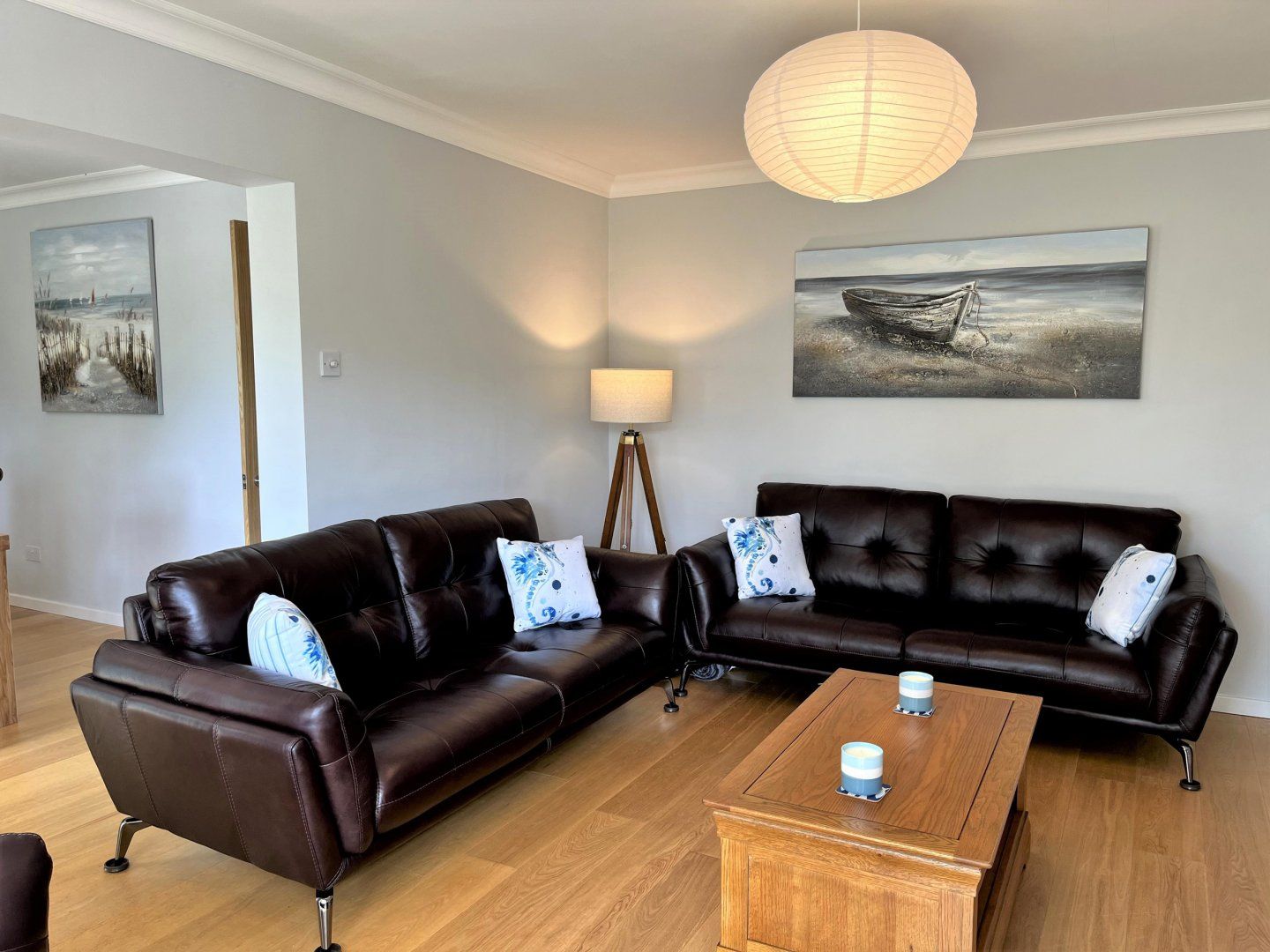 Accomodation Details Four bedrooms: 1 x ground-floor super king-size, 1 x king-size with Smart TV and balcony, 1 x king-size, 1 x twin. Bathroom with bath, walk-in shower, basin, heated towel rail and WC. Ground floor cloakroom with basin and WC. Kitchen. Utility. Dining room. Sitting room with gas fire