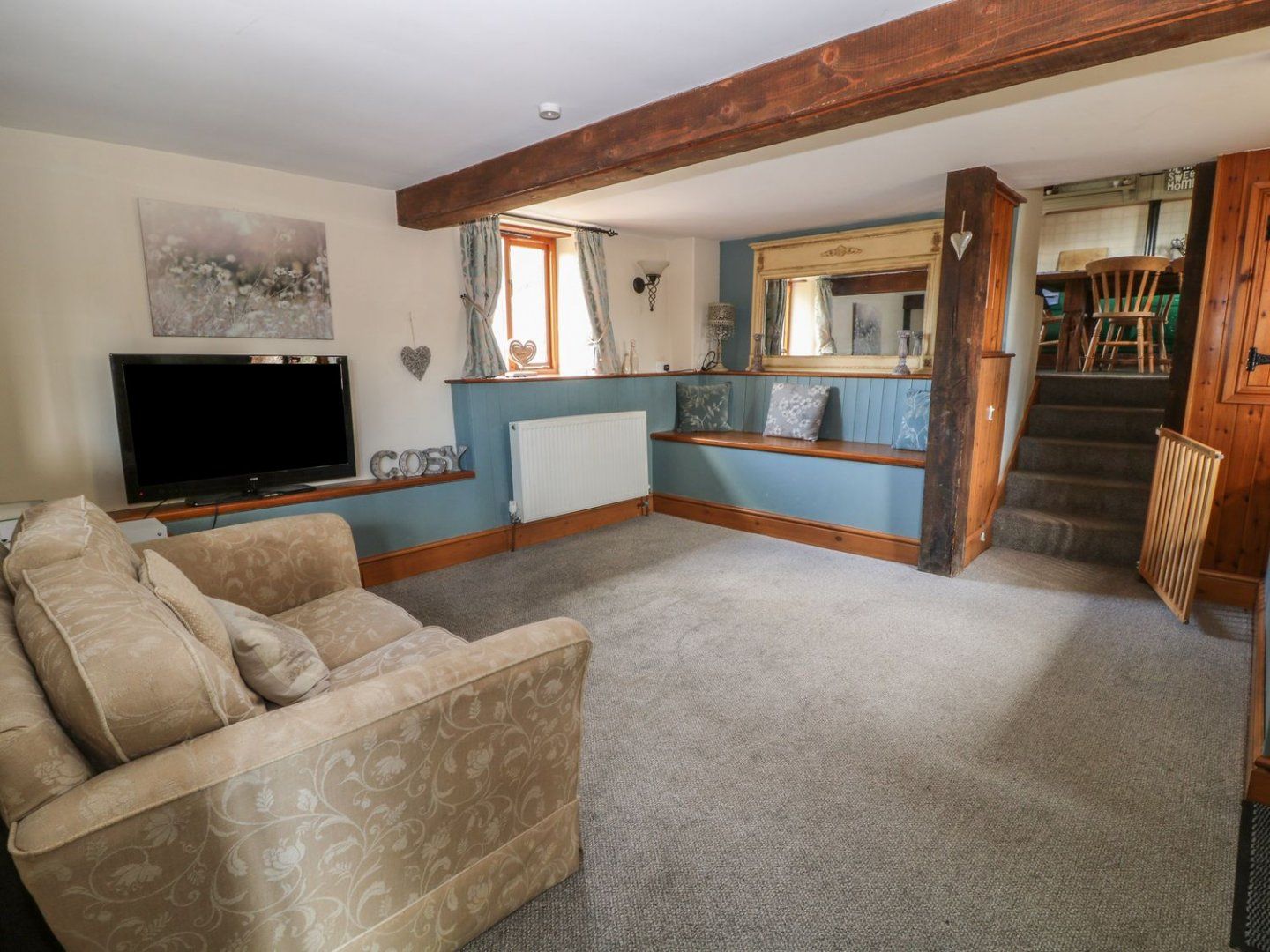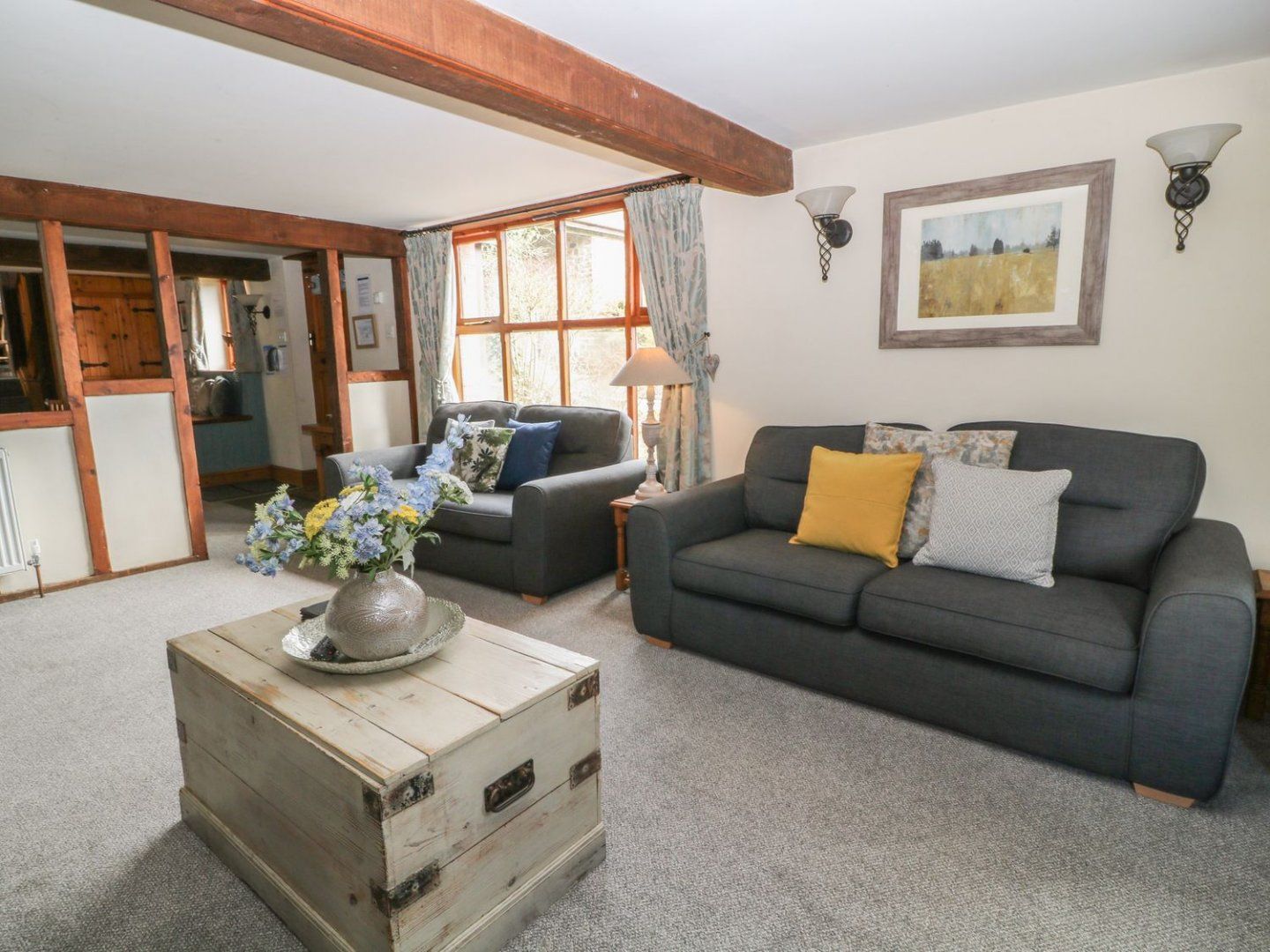 Amenities Oil central heating with woodburning stove. Electric double oven and hob, microwave, 2 x fridge/freezer, washing machine, dishwasher. TV with Freeview, DVD, iPod dock, Xbox with games, WiFi, selection of books, games and DVDs. Shared external games room with table tennis, pool table, table football and TV with PS2 and games. Fuel and power inc. in rent. Starter pack for woodburning stove inc. in rent Oct-March; at other times of year fuel for stove can be purchased locally. Bed linen and towels inc. in rent; hot tub towels are not provided. Highchair and travel cot available on request. Shared car park for 3 cars situated approximately 30 metres from the property. Two well behaved dogs welcome. Enclosed lawned garden with furniture, private 6-person hot tub and barbecue. Shared use of 6-acre site. Sorry no smoking. Shop and pub 2.7 miles. Note: One of the double bedrooms and both twins have sloping ceilings. Note: The property is over three floors, with 5 steps from ground floor to first floor level and then a further 5 steps to second floor level. Note: This property is in a rural location, accessed by country lanes that are single track in some places. Note: Check-in is from 4pm, check-out by 10am