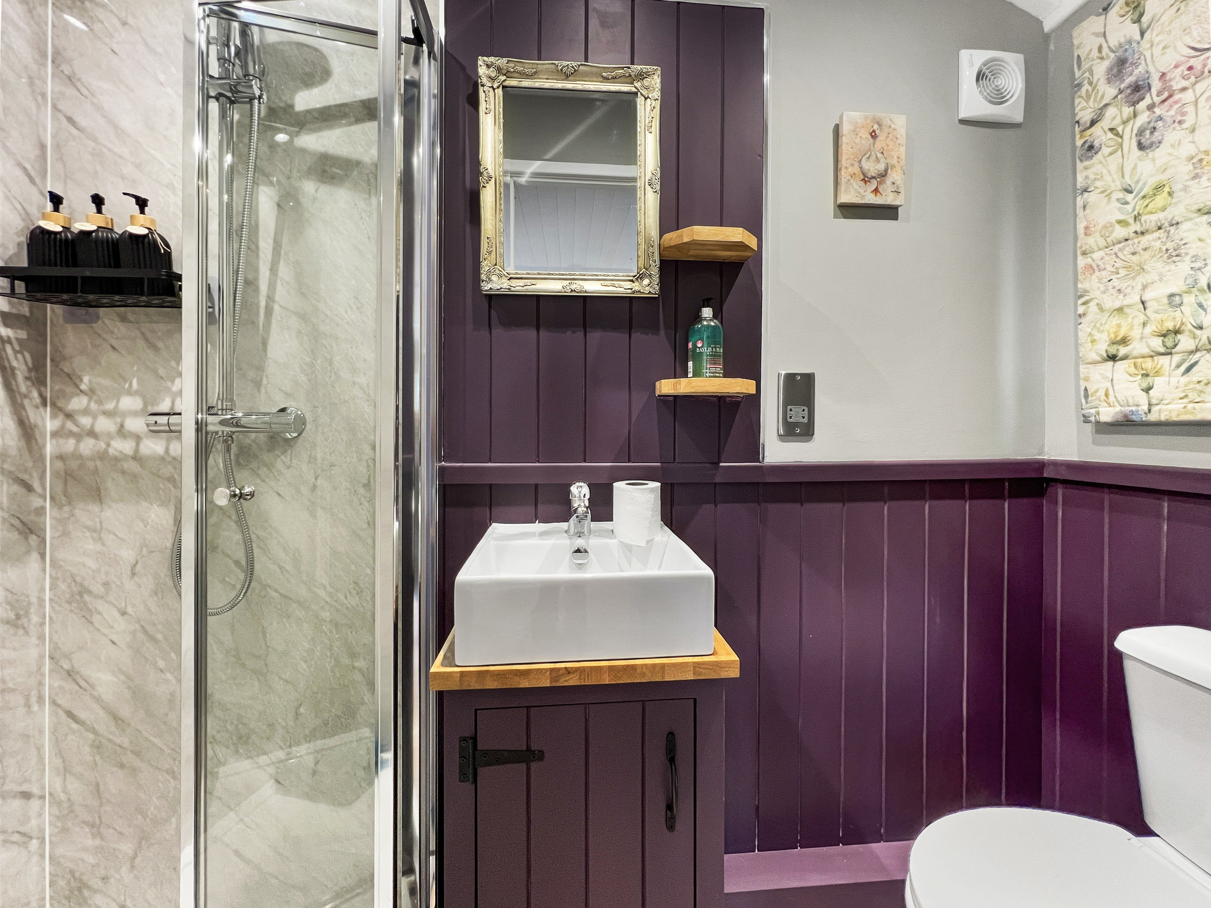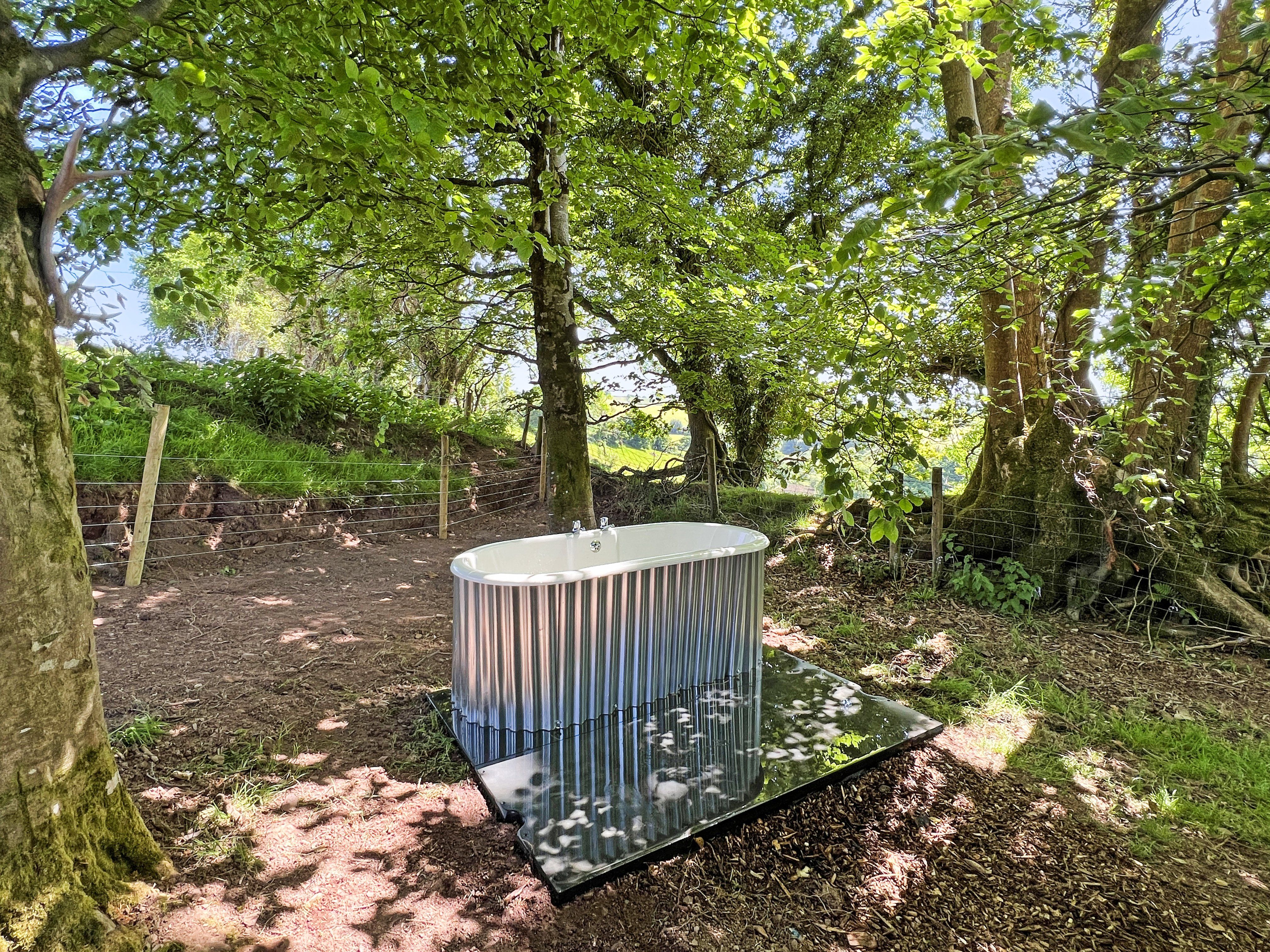 At the far end of the hut, the en-suite shower room includes a walk-in shower, toilet and basin. The bath is located outside for bathing under the stars!