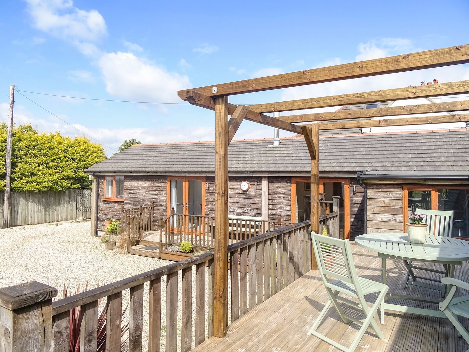 Holiday home Lilys Pad is single-storey and consists of a kitchen/diner with an electric oven and hob, microwave, fridge/freezer, washing machine, dishwasher, dining seating for four, and a sitting room with Smart TV and woodburning stove. The bedrooms both have en-suite shower rooms and consist of a king-size with Smart TV and a twin with TV. Outside there is an enclosed decking with furniture, communal land, plus off-road parking. Two well-behaved dogs welcome. Travel cot and highchair available. Within 2 miles you will find a shop, and within 1.5 miles, a pub, and please note this is a smoke-free property. WiFi, fuel, power, bed linen, and towels included in the rent. Explore the countryside of Devon with a stay at the delightful Lilys Pad. Note: Check-in 4 pm, check-out 10am. Note: This property can be booked with Ref. 1145064, together sleeping up to 8 guests.
