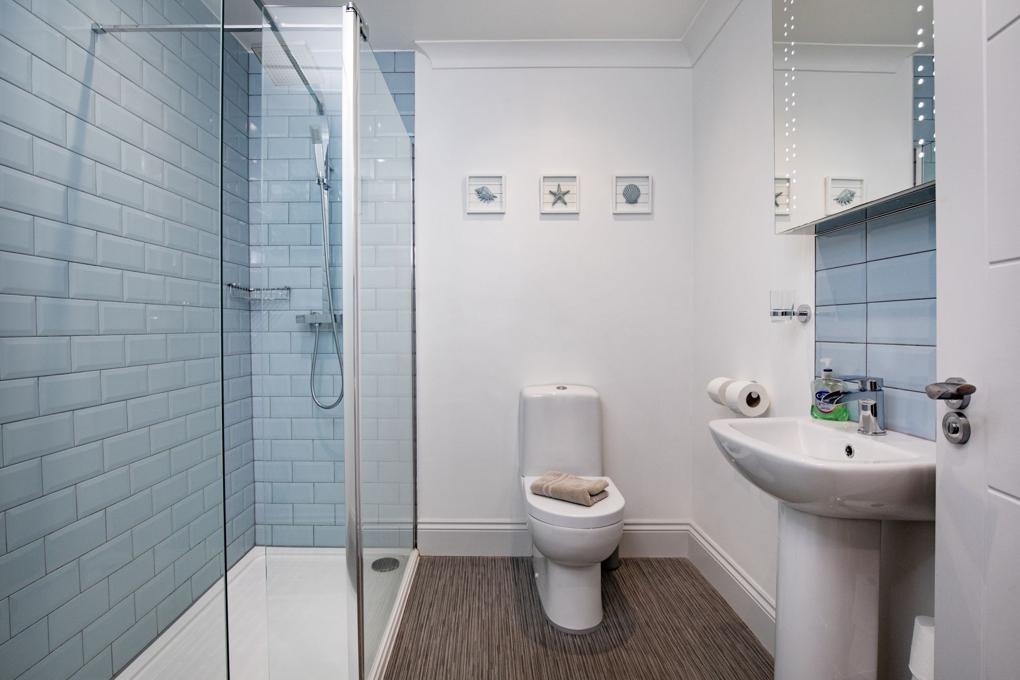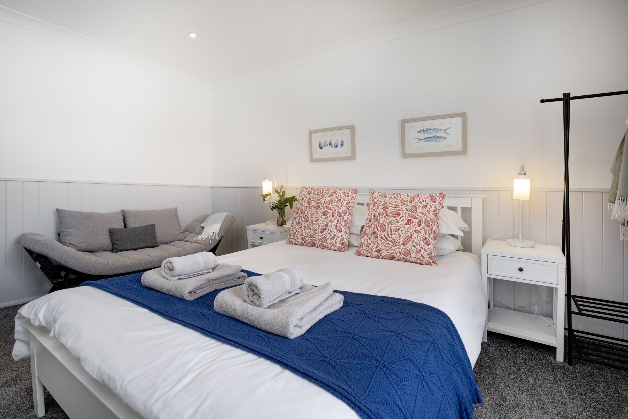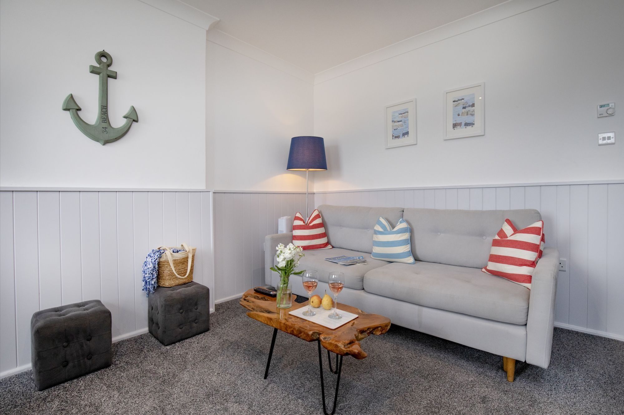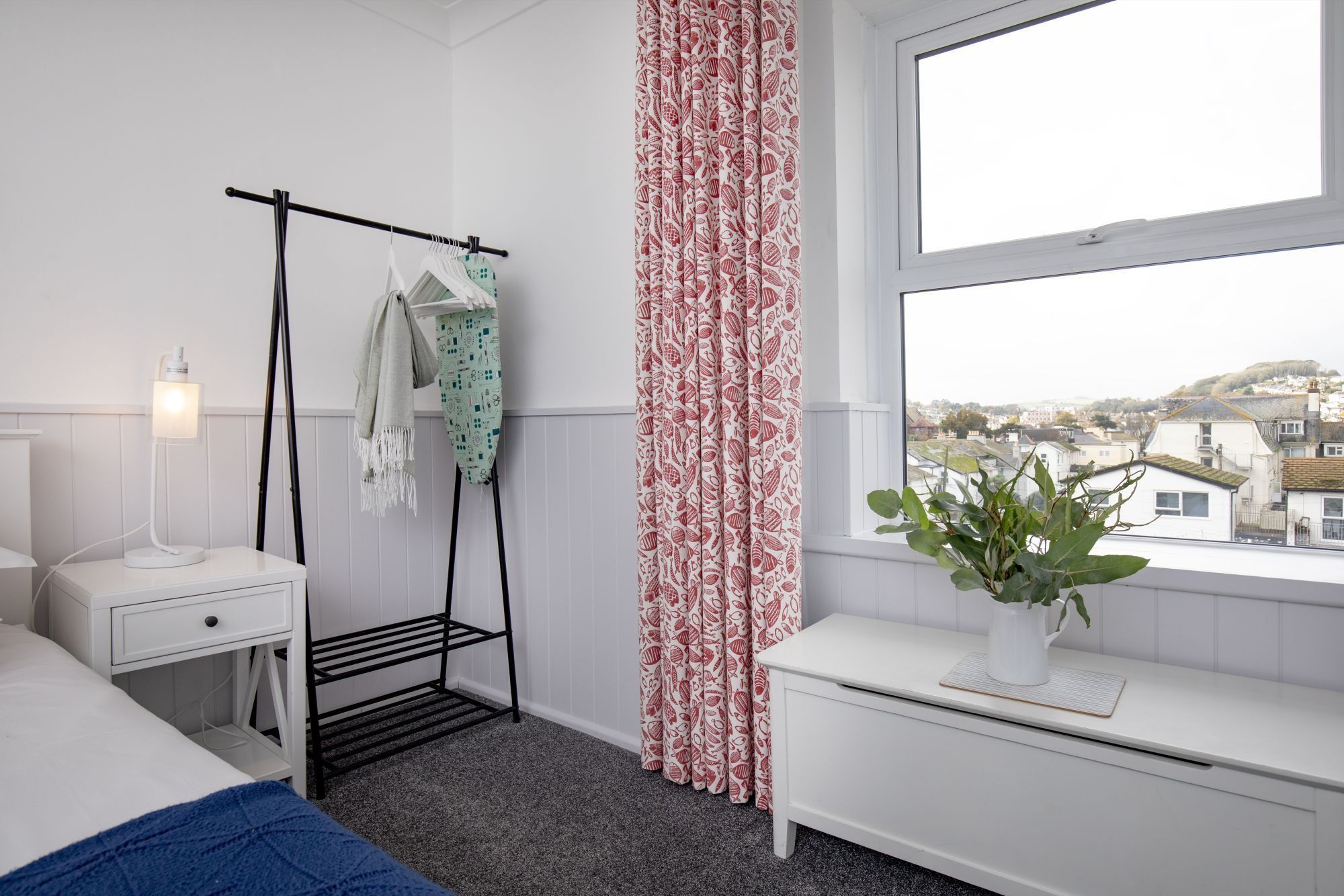 The nautical decor inside is a reminder of how close you are to the sea – anchors on the wall, paintings of beach huts and a palette of soft blues and whites. The stylish grey kitchen has all the essentials for self-catering, and the breakfast table sits in a sunny spot by the window, overlooking the rooftops of Paignton. The bedroom, with its king-size bed, is a soothing place to lay your head.