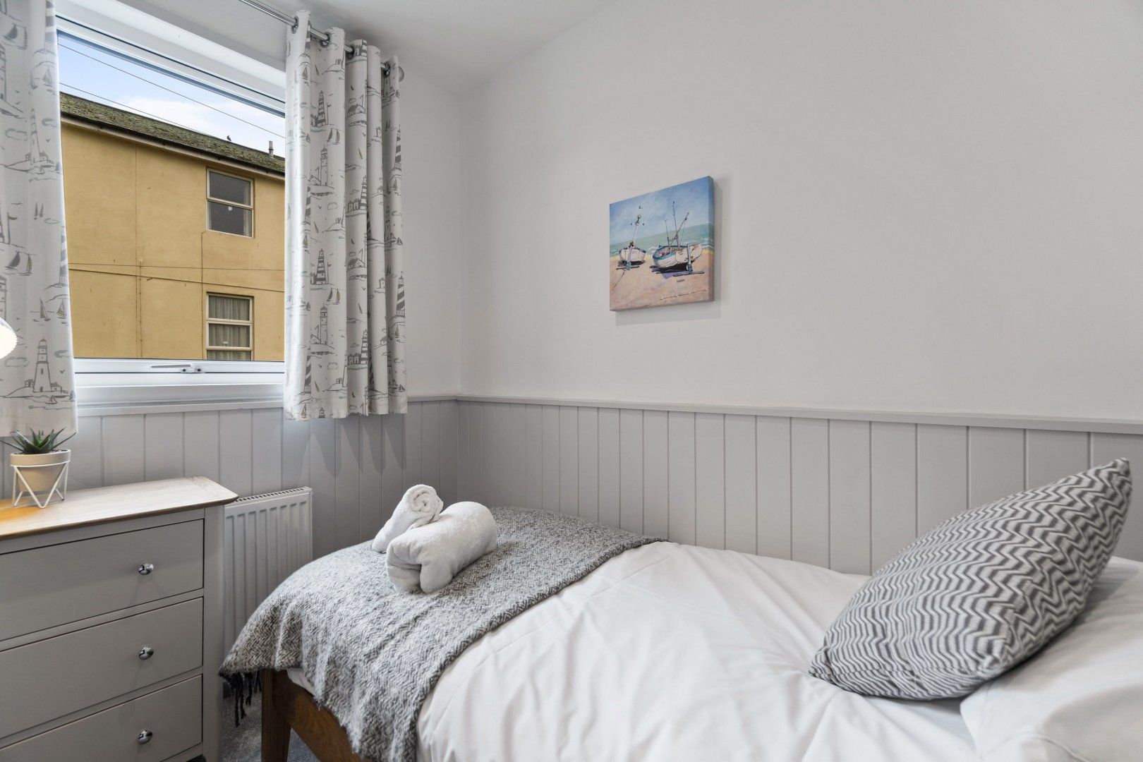 Live the Devonshire dream in this stunning seaside home, situated just metres from Paignton’s promenade and beach. Featuring a kitchen-diner and open plan living room – think soft grey panelling, cabinetry, carpets and cushions – as well as three bedrooms, this family-friendly home has been thoughtfully designed so as to make the most of spending time together.