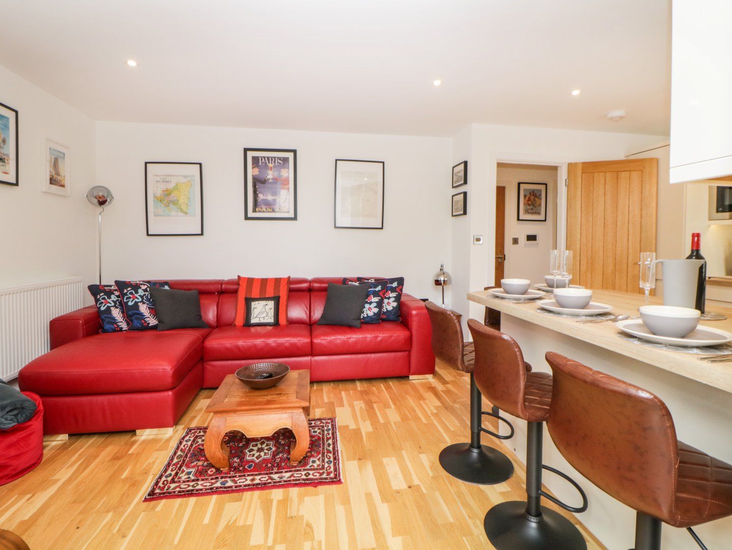 Accomodation Details First-floor apartment. Two bedrooms:. 1 x king-size double with en-suite walk-in shower, basin, heated towel rail and WC. 1 x king-size double (zip/link, can be twin on request). Bathroom with walk-in shower, basin, heated towel rail and WC. Open-plan living space with kitchen, breakfast bar dining and sitting area with balcony.