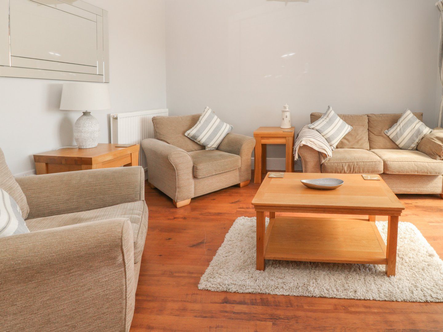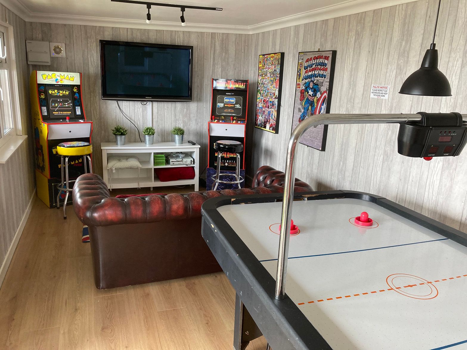Accomodation Details Three bedrooms with TVs: 1 x king-size with en-suite walk-in shower, basin, heated towel rail and WC, 1 x ground-floor twin with en-suite corner bath, basin, heated towel rail and WC, 1 x ground-floor day bed with pull out bed. Ground-floor shower room with walk-in shower, basin, heated towel rail and WC. Kitchen. Living/dining room. Conservatory. External lodge with games room