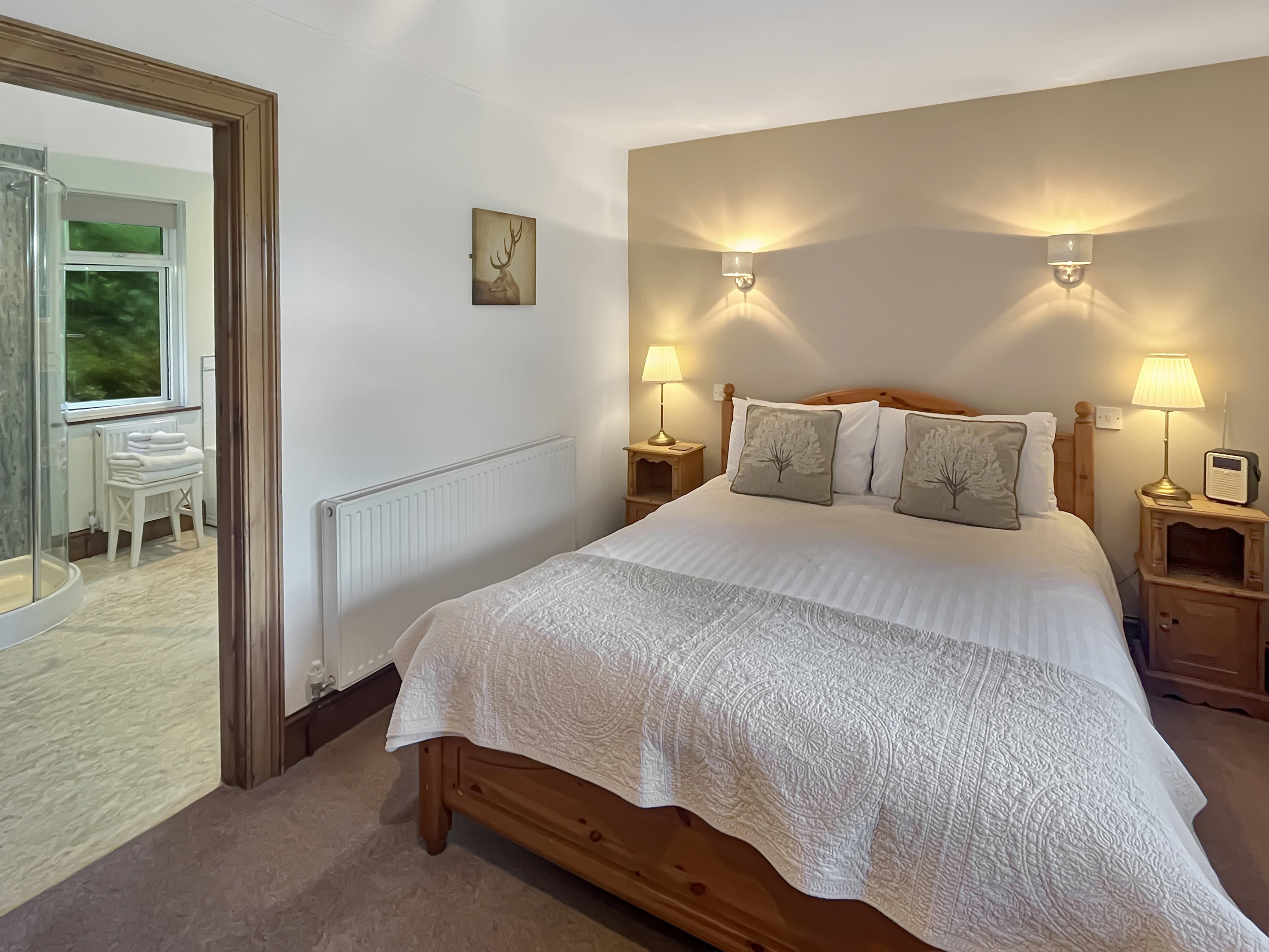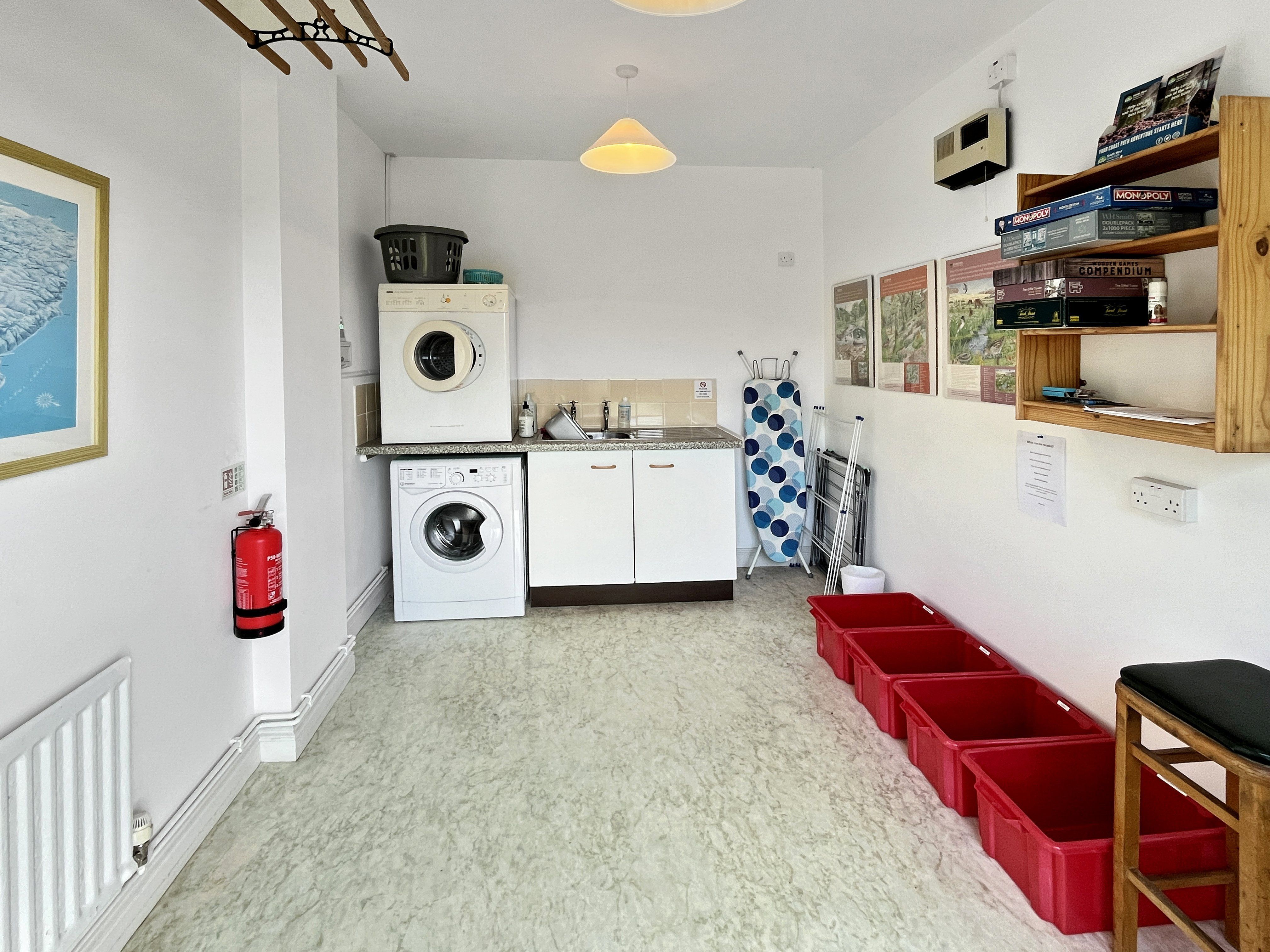 Facilities Ground floor: Living/dining room with wood-burning stove, smart TV with Freesat, DVD player and DAB Radio with dock for iPhone. Kitchen with electric oven and induction hob, microwave, large fridge/freezer, dishwasher and coffee machine. Washing machine, tumble dryer and payphone in shared utility area. Bedroom with king-size bed, DAB radio/alarm and large en-suite bathroom with bath, separate walk-in shower, WC and basin.