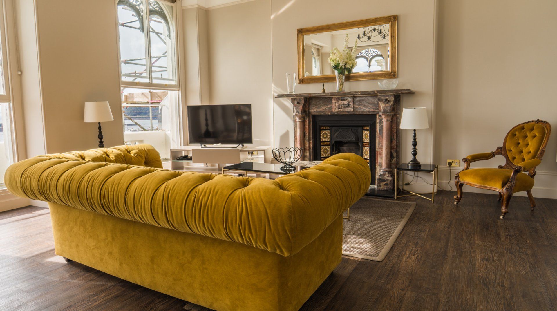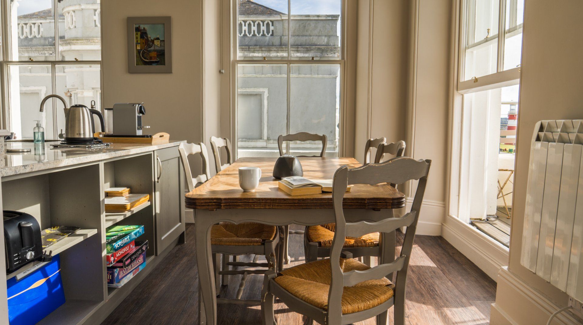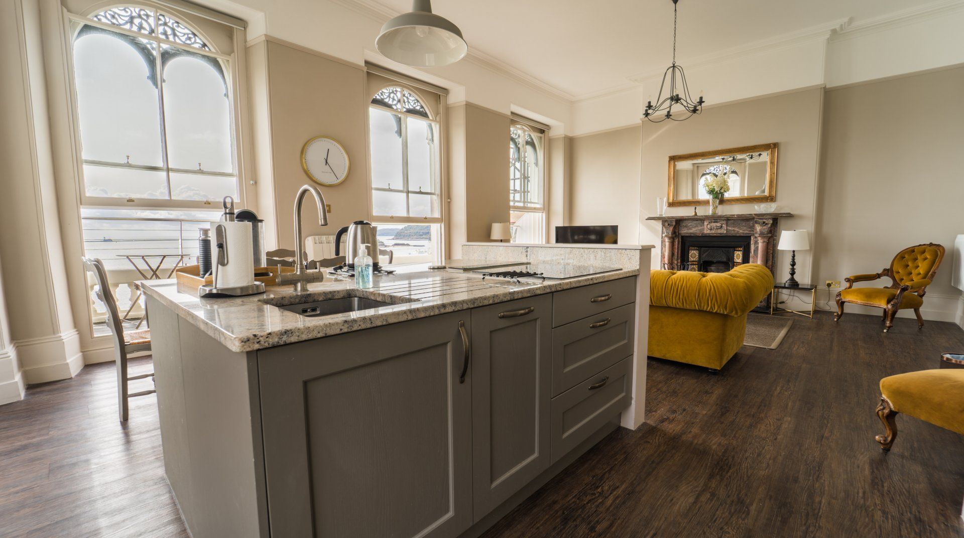 The apartment itself has beautiful sash windows, which flood the rooms with light. Wooden floors, mustard velvet upholstery and a modern kitchen make the open-plan living space a comfortable and stylish place to relax after a day of exploring. But the highlight of this home has to be its views, which you can enjoy from the balcony. We think it’s an experience best enjoyed with a locally distilled gin in hand as the sun sets into the water.
