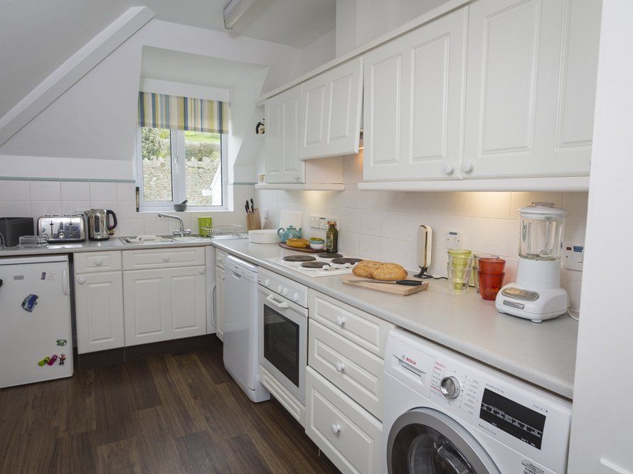 Amenities Four-ring electric hob and oven, dishwasher, washer/dryer, fridge with ice compartment and microwave. LCD digital TV, DVD player. Wifi. Balcony with garden furniture. Communal gardens available (but unsuitable for young children due to steep gradient). Electric immersion for hot water and heating by night storage heaters (Economy 7). Parking for one car, plus unreserved visitors bay (additional parking usually available in the village nearby). Duvets, pillows, bed linen and towels provided - tenants require beach and tea towels. Strictly No Smoking
