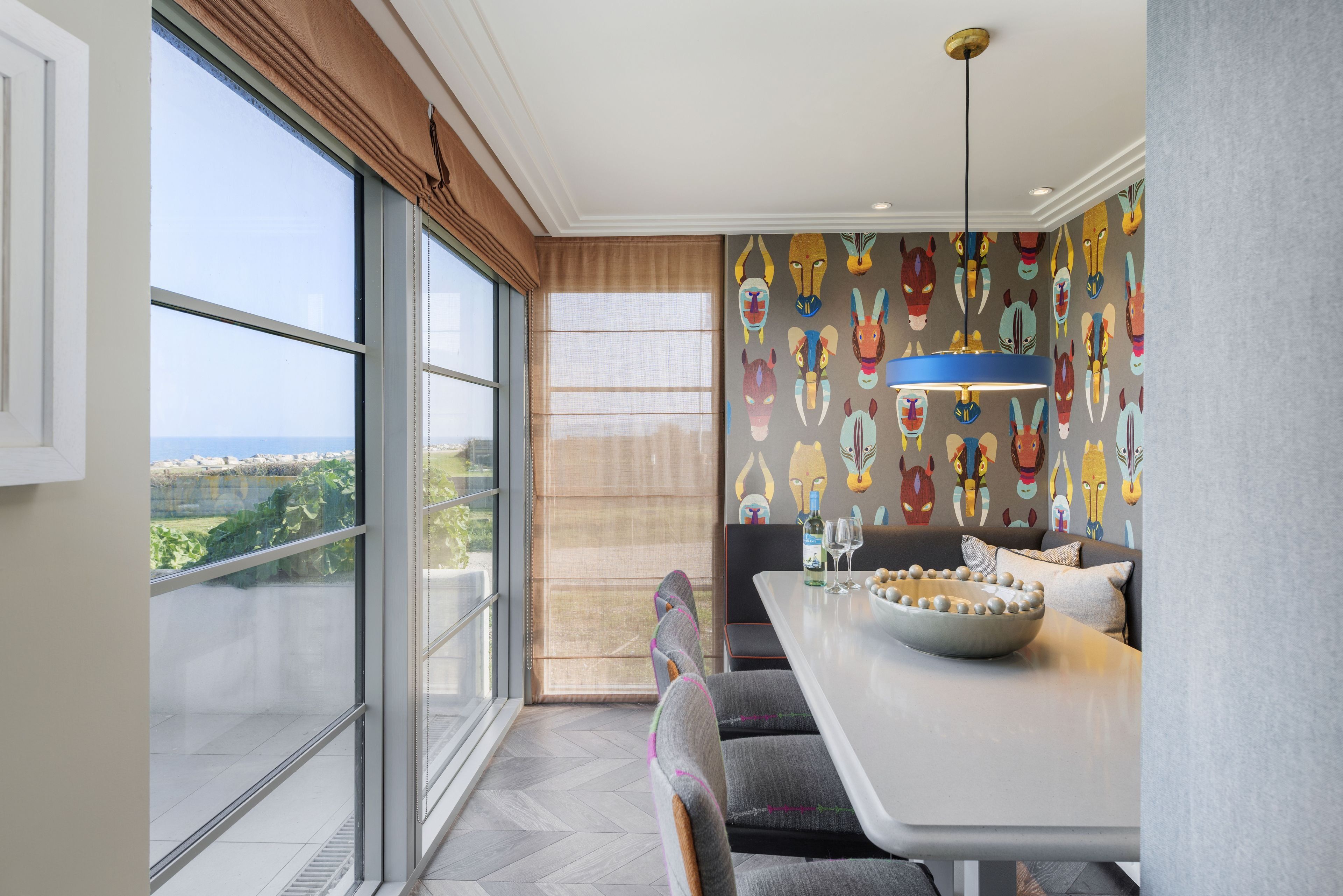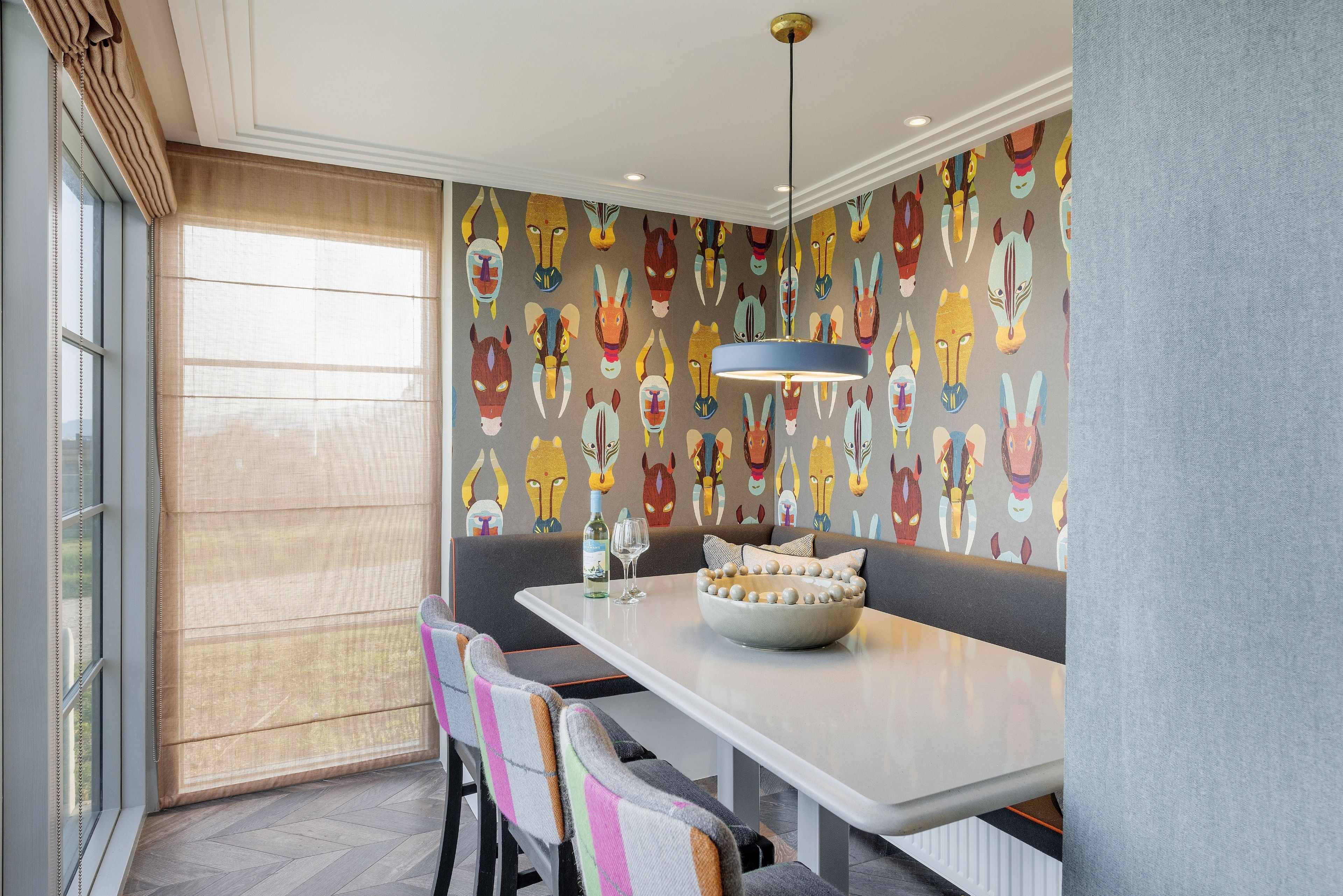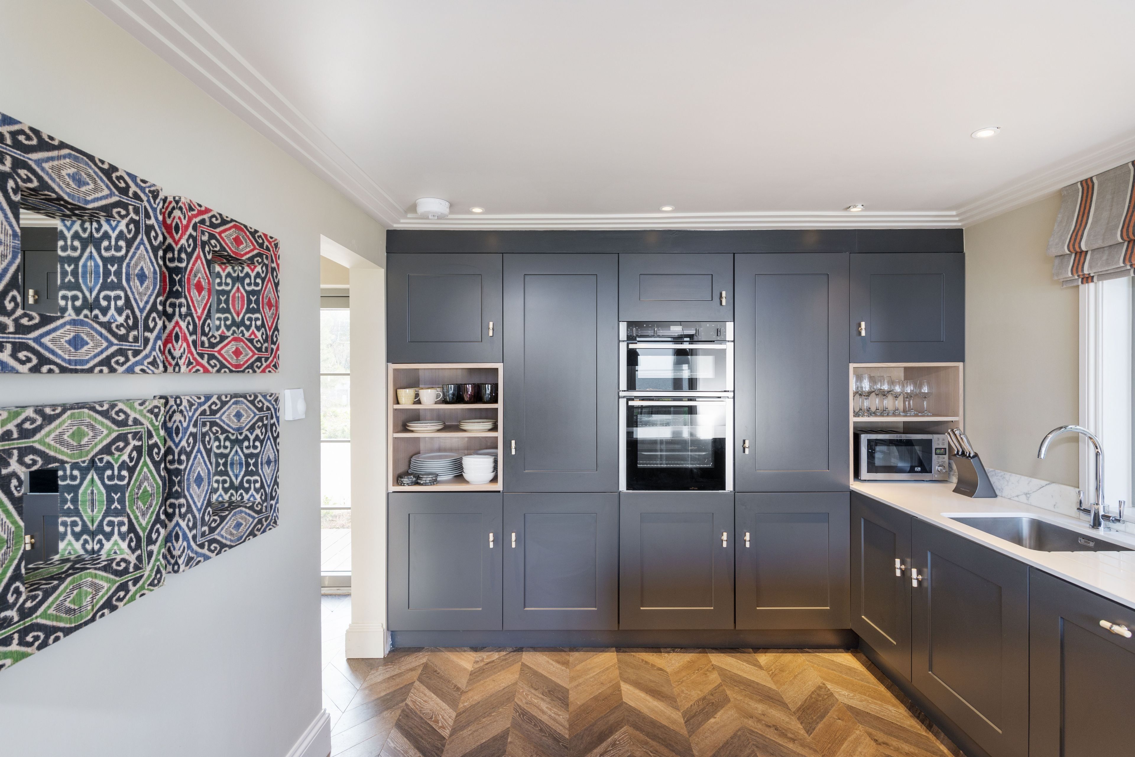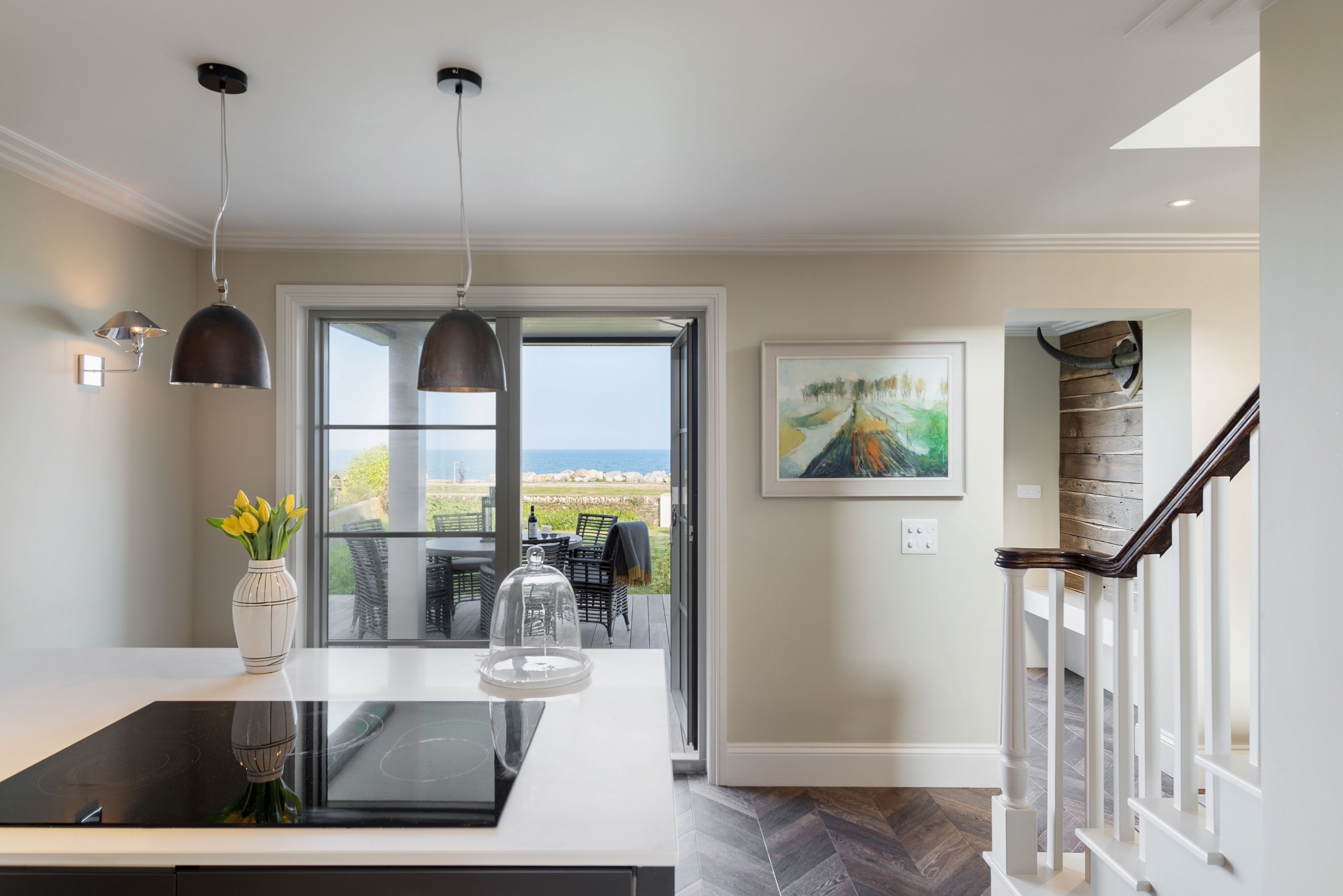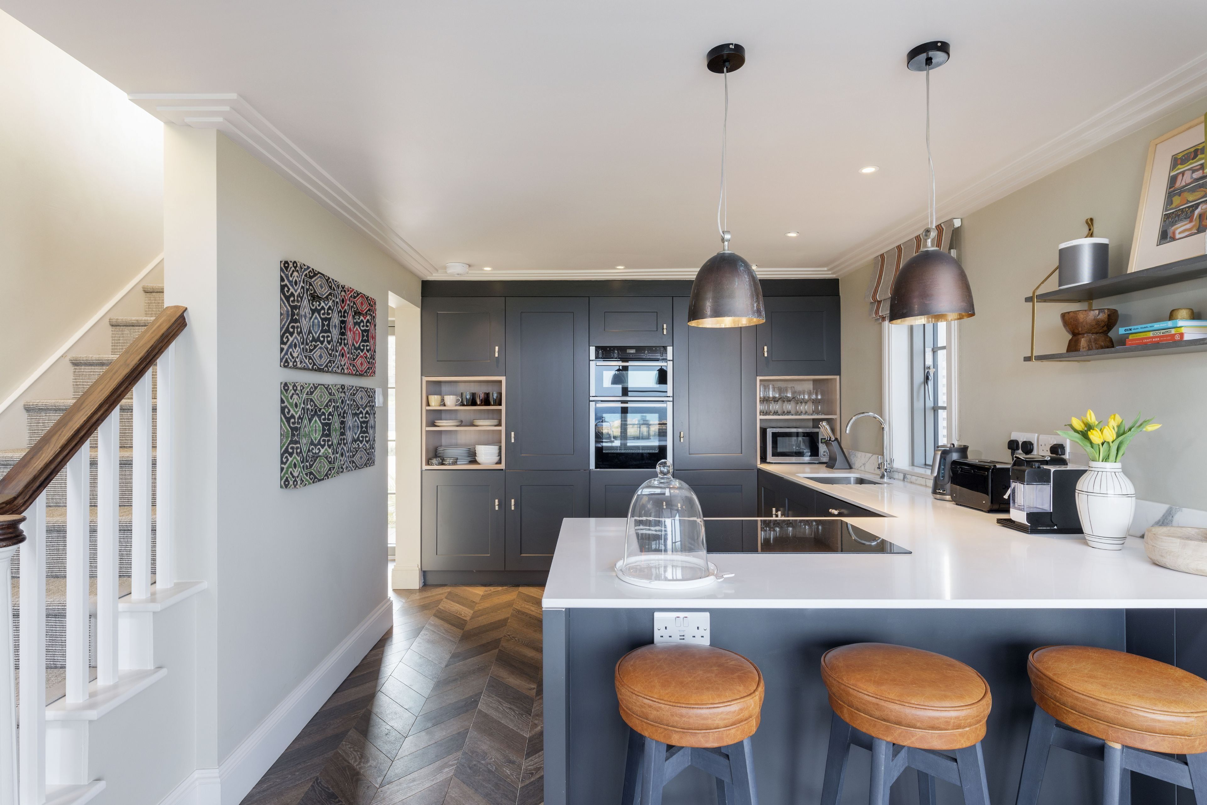 Open plan with the living and dining areas and located on the ground floor. Electric oven with grill and hob, microwave, fridge/freezer, dishwasher, washing machine and coffee machine. Most appliances are NEFF. Breakfast bar with two stools.