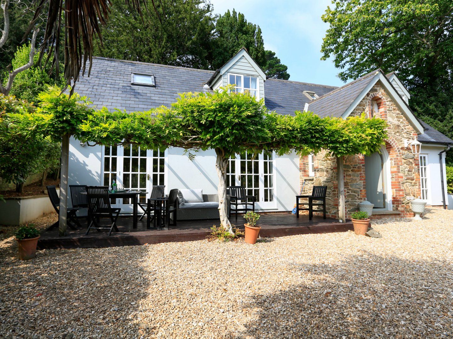 Decked area and pergola with outside furniture.