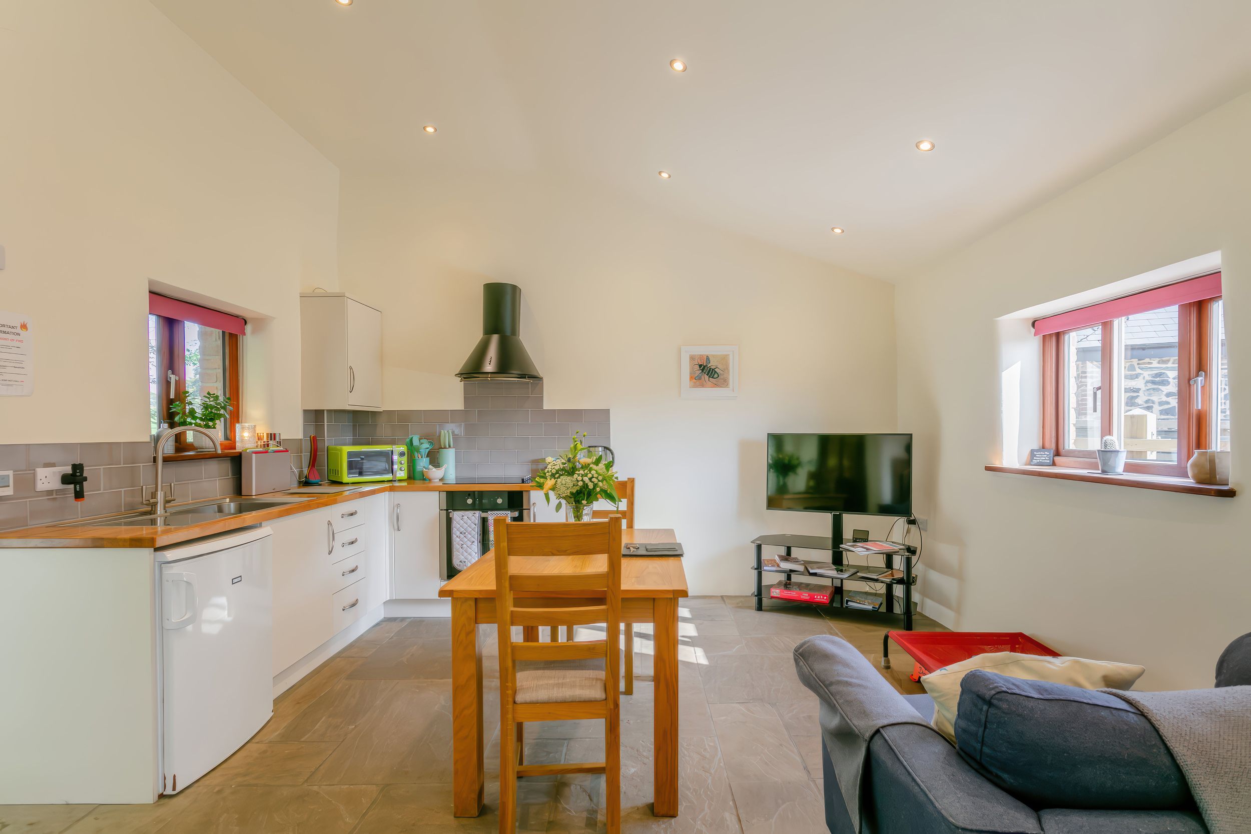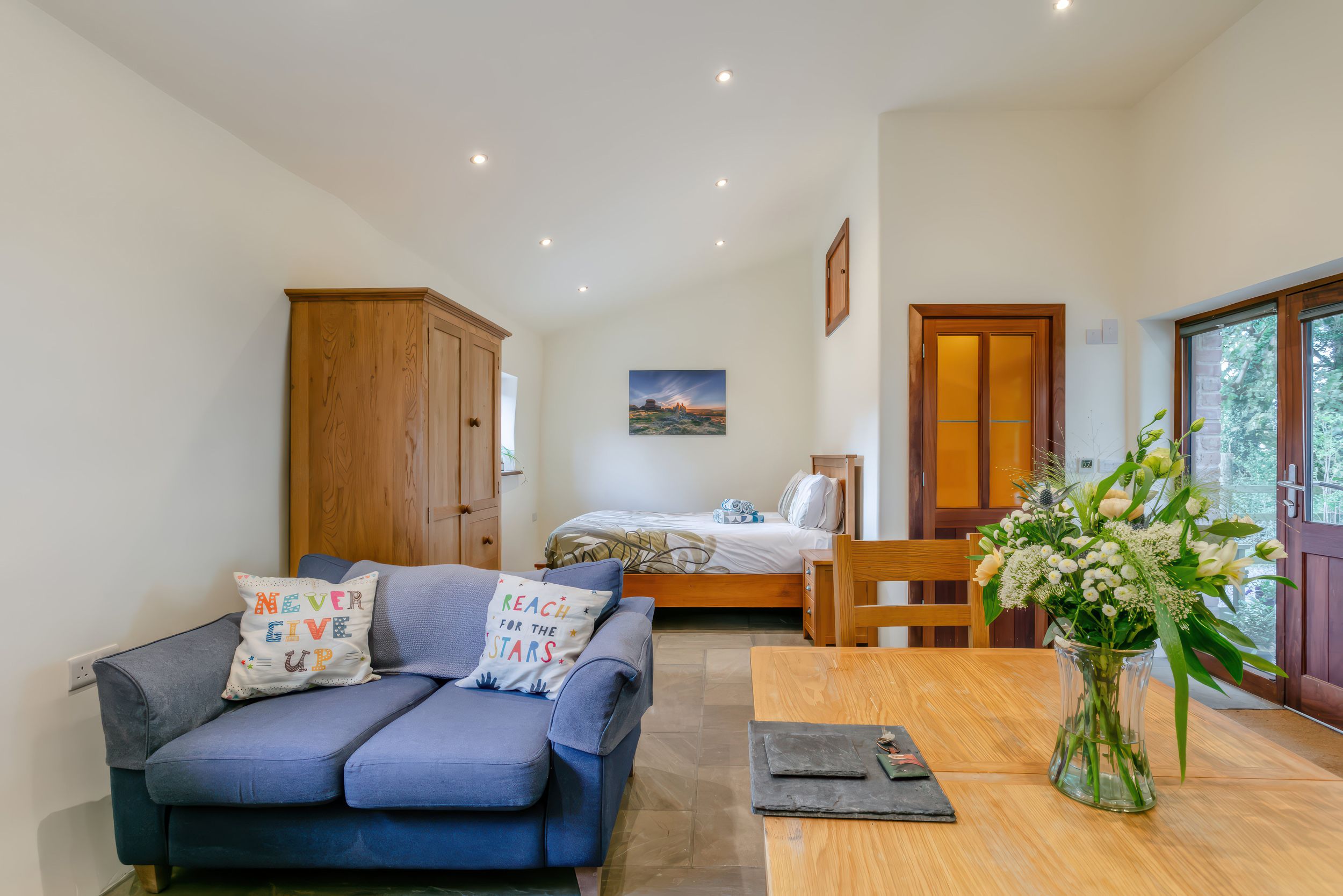 Accomodation Details Single-storey. Studio-style layout with king-size bed, kitchen, dining area, and sitting area. Wet room with walk-in shower, basin, heated towel rail, and WC