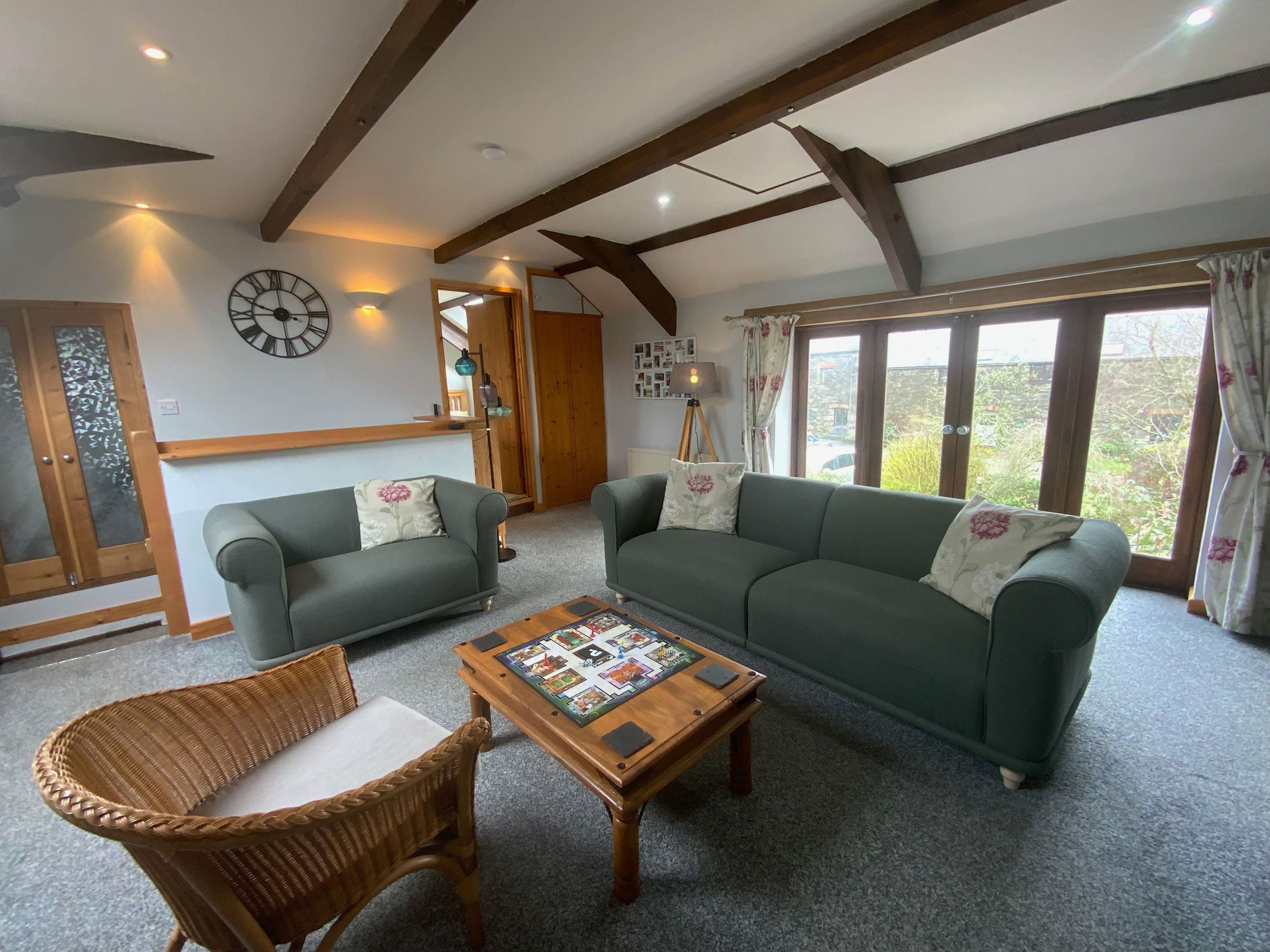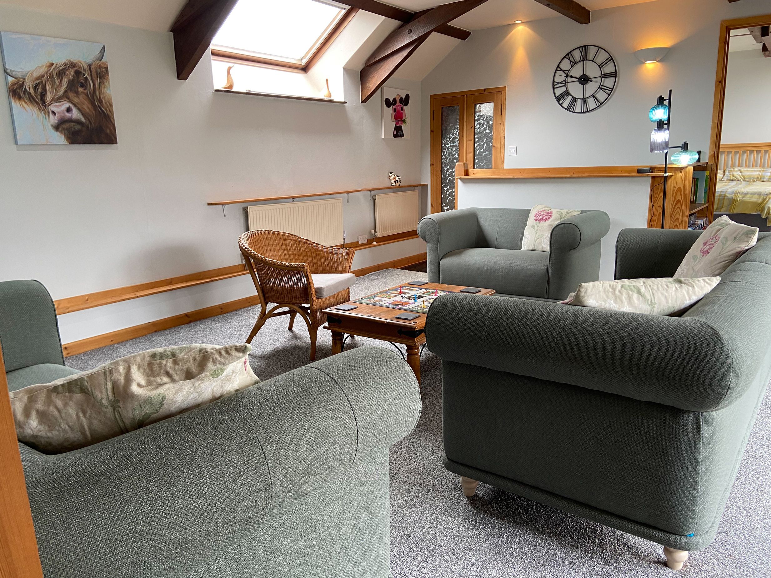 Accomodation Details Two bedrooms: 1 x king-size with TV, en-suite bath, hand-held shower, basin and WC, 1 x family room with double and single with TV and en-suite shower room with WC and basin. Cloakroom/ utility with washing machine, WC and basin. Kitchen/diner. First-floor sitting room with electric fire
