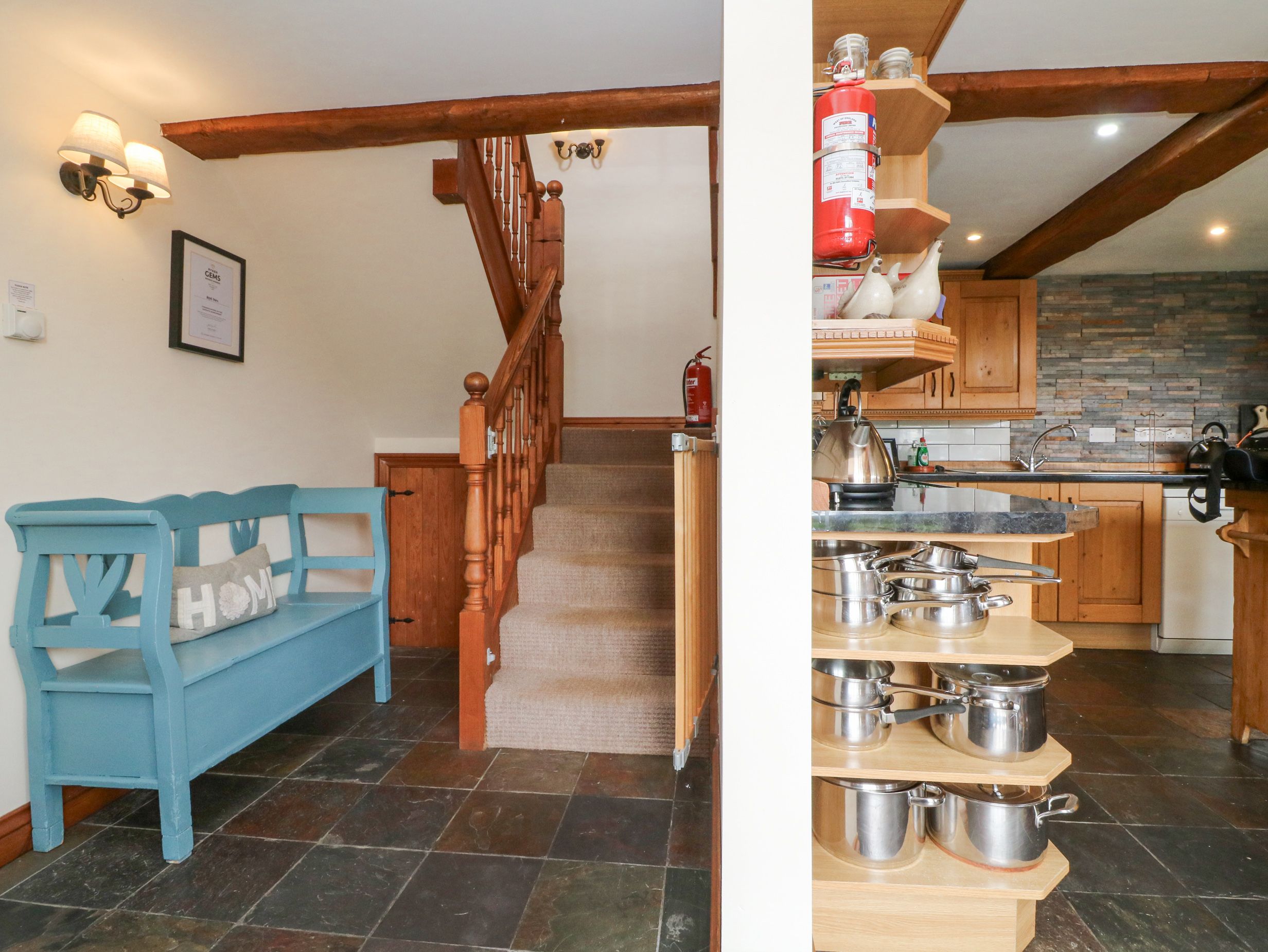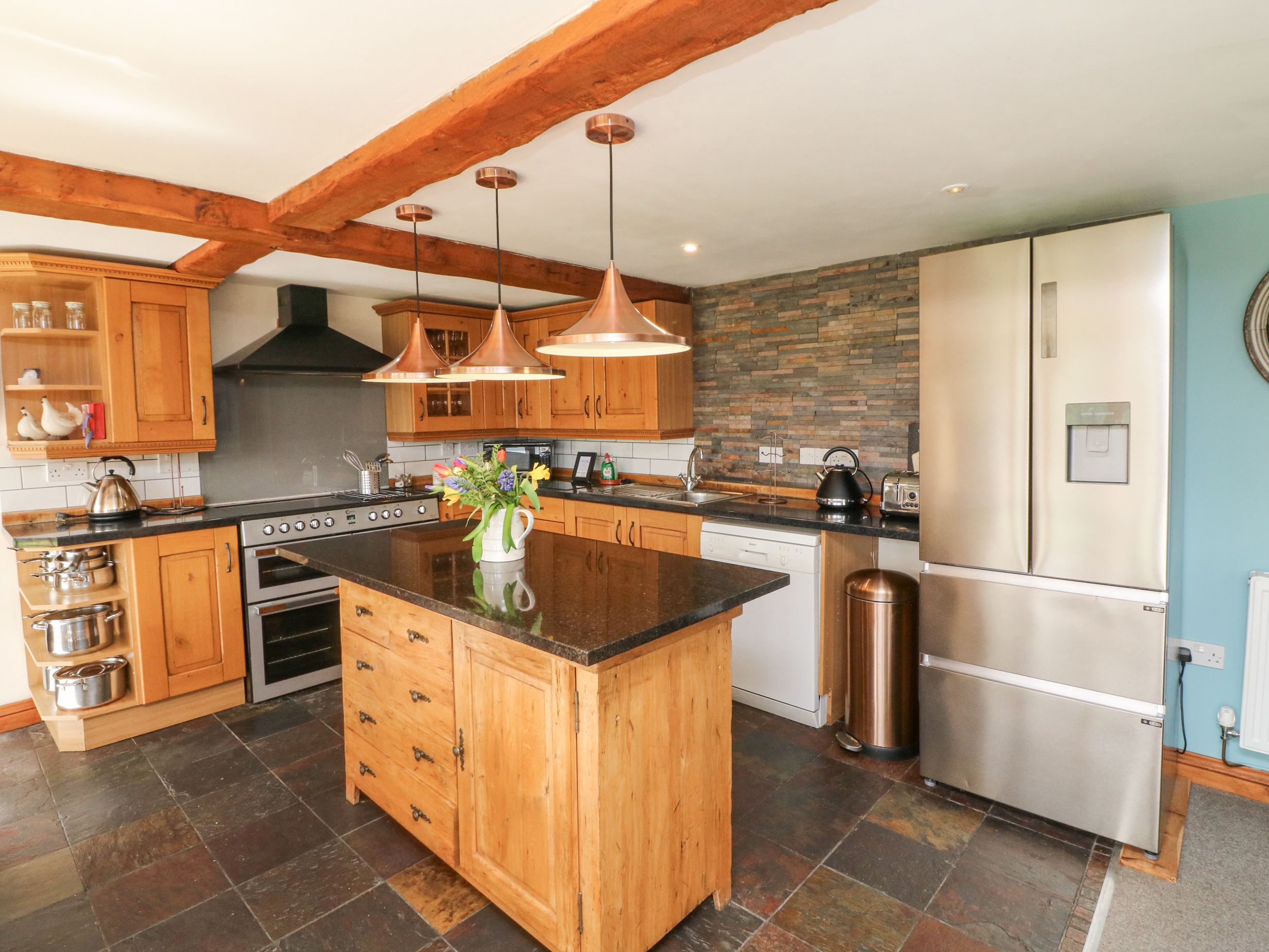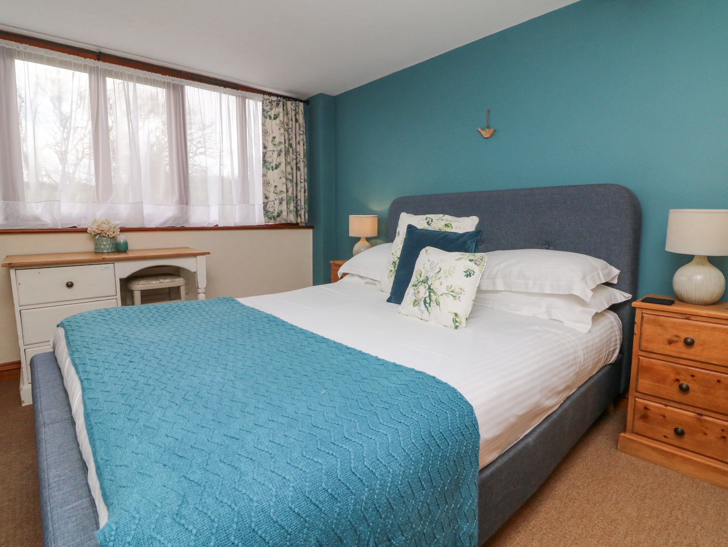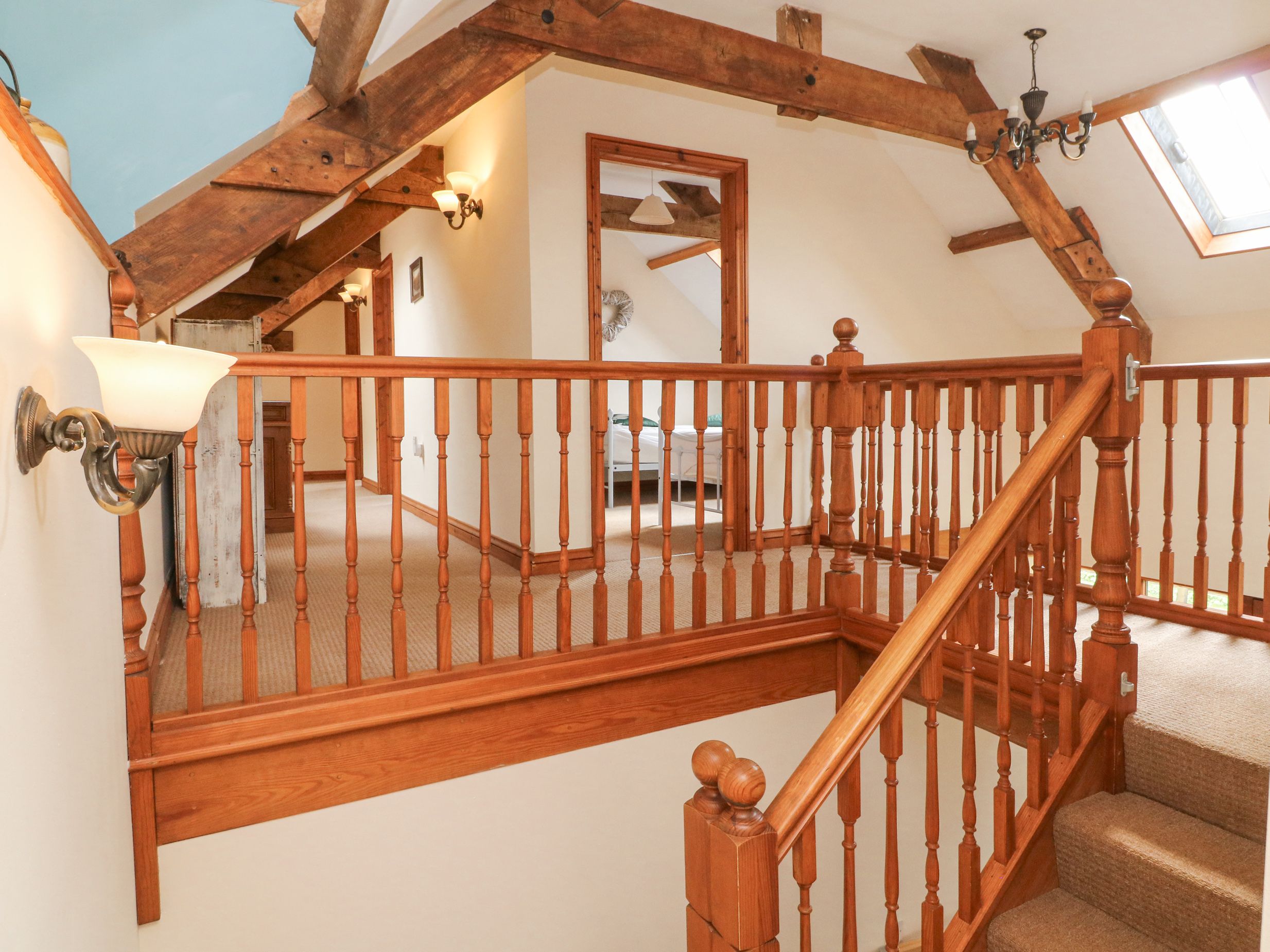 Oil central heating with woodburning stove. Electric double oven and hob, microwave, 2 x fridge, freezer, washing machine, dishwasher. TV with Freeview, DVD, CD/radio, iPod dock, WiFi, selection of books, games and DVDs. Fuel and power inc. in rent. Starter pack for woodburning stove inc. in rent Oct-March; at other times of year fuel for stove can be purchased locally. Bed linen and towels inc. in rent; hot tub towels are not provided. Travel cot, highchair and stairgate available on request. Ample off-road parking. Private 6-person hot tub overlooking the valley. Enclosed lawned garden with furniture and barbecue. Shared use of 6-acre site. Shared external games room with table tennis, pool table, table football and TV with PS2 and games. Sorry, no pets and no smoking. Shop and pub 2.1 miles. Note: One of the double bedrooms and both twins have sloping ceilings. Note: The property is over three floors, with 8 steps from ground floor to first floor level and then a further 8 steps to second floor level. Note: This property is in a rural location, accessed by country lanes that are single track in some places. Please be advised the charging of electric vehicles is prohibited at this property.