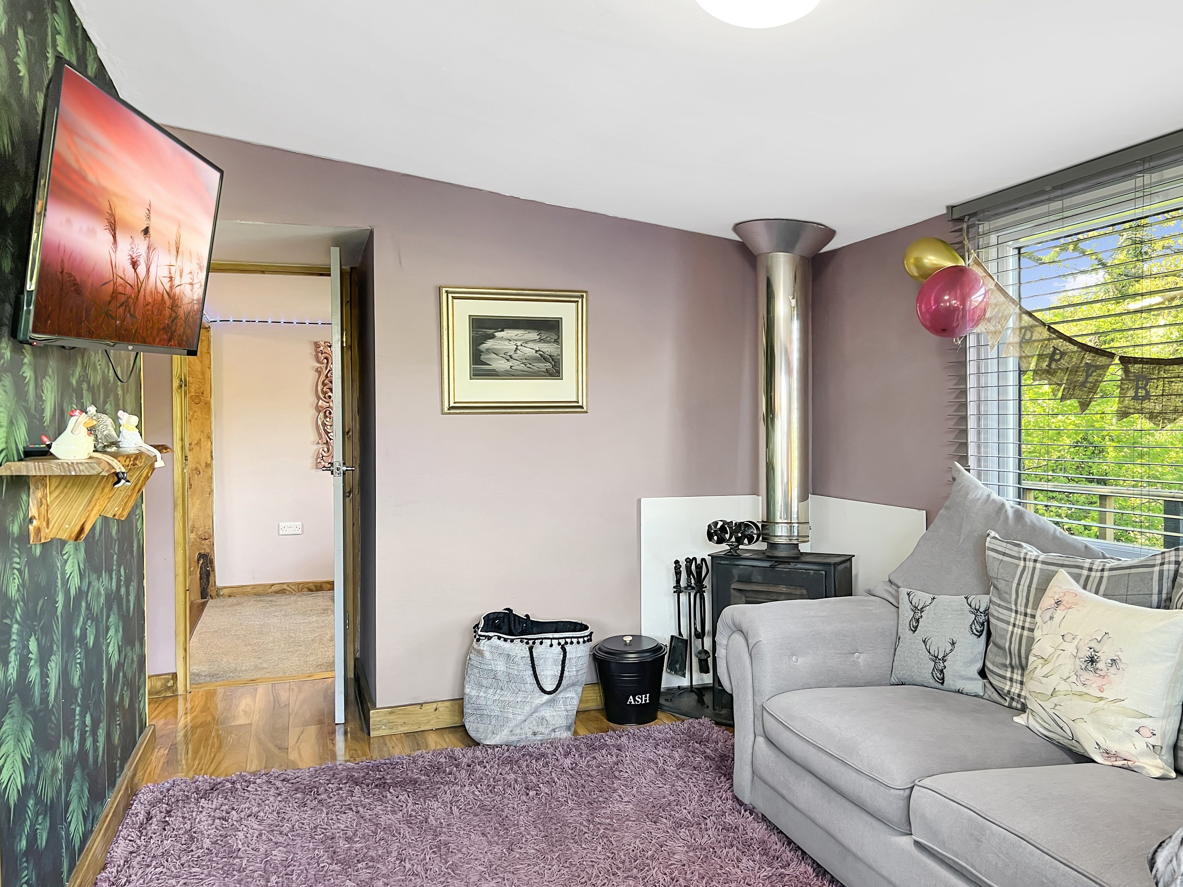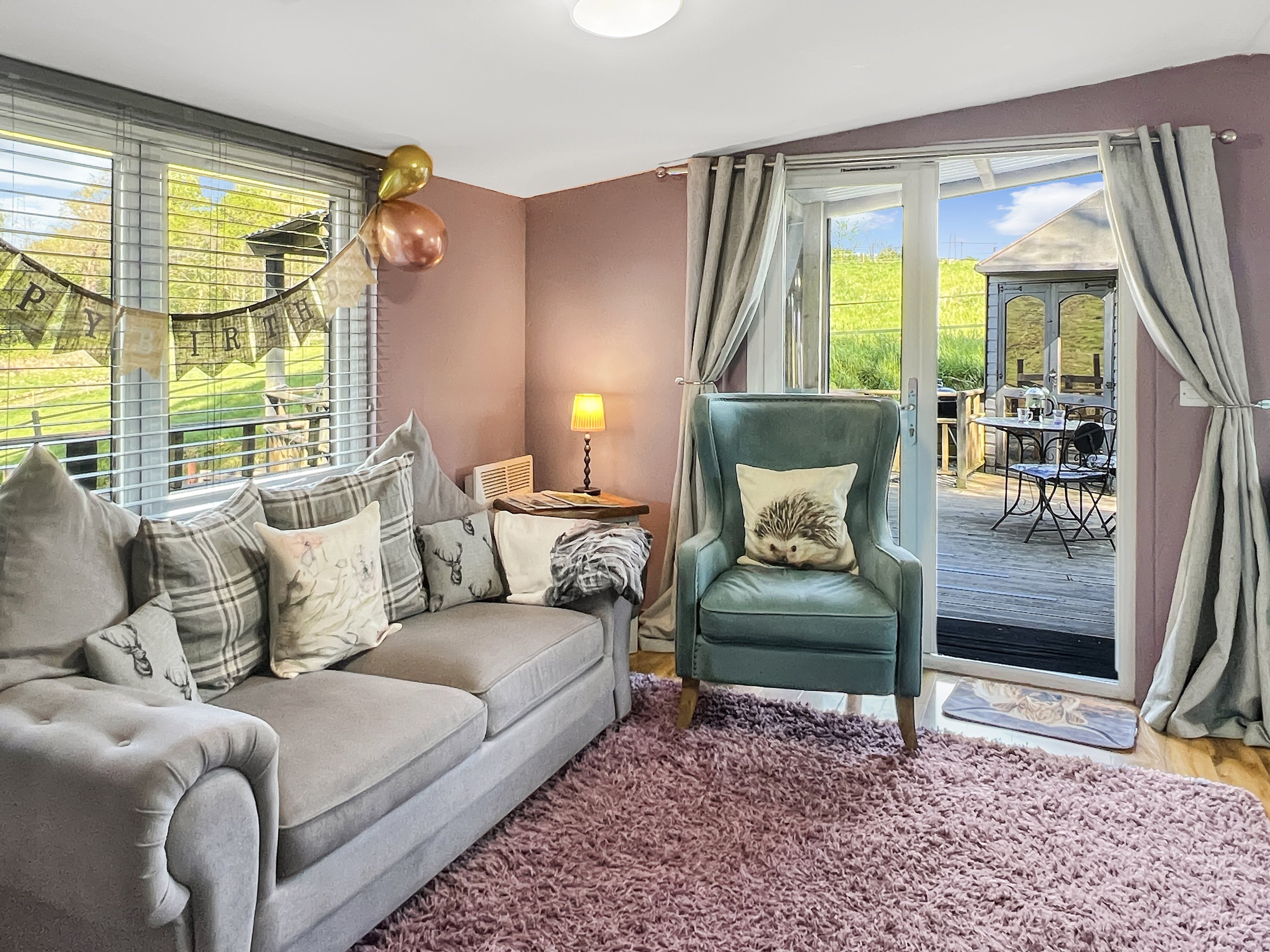 The living area is furnished with a dining table and chairs, a comfortable seating area, a wood-burning stove, and a television. Doors open from the living space onto the private terrace, allowing easy access to the outdoor seating and countryside views.