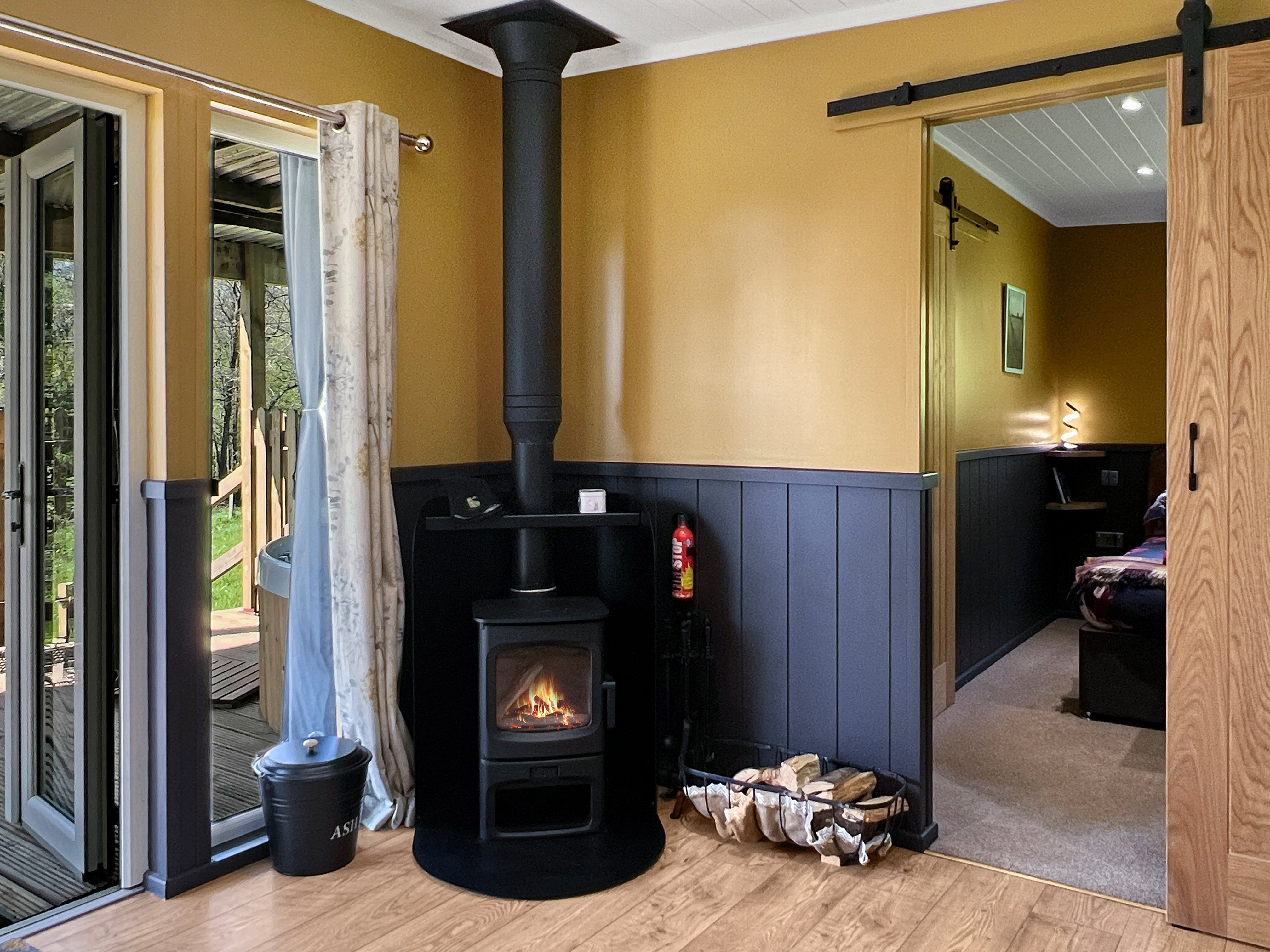 The dining area includes a table and chairs, and the living space features a three-seater sofa which can be converted into a sofa bed. A wood-burning stove creates a cosy atmosphere, and a television is provided for guest use.