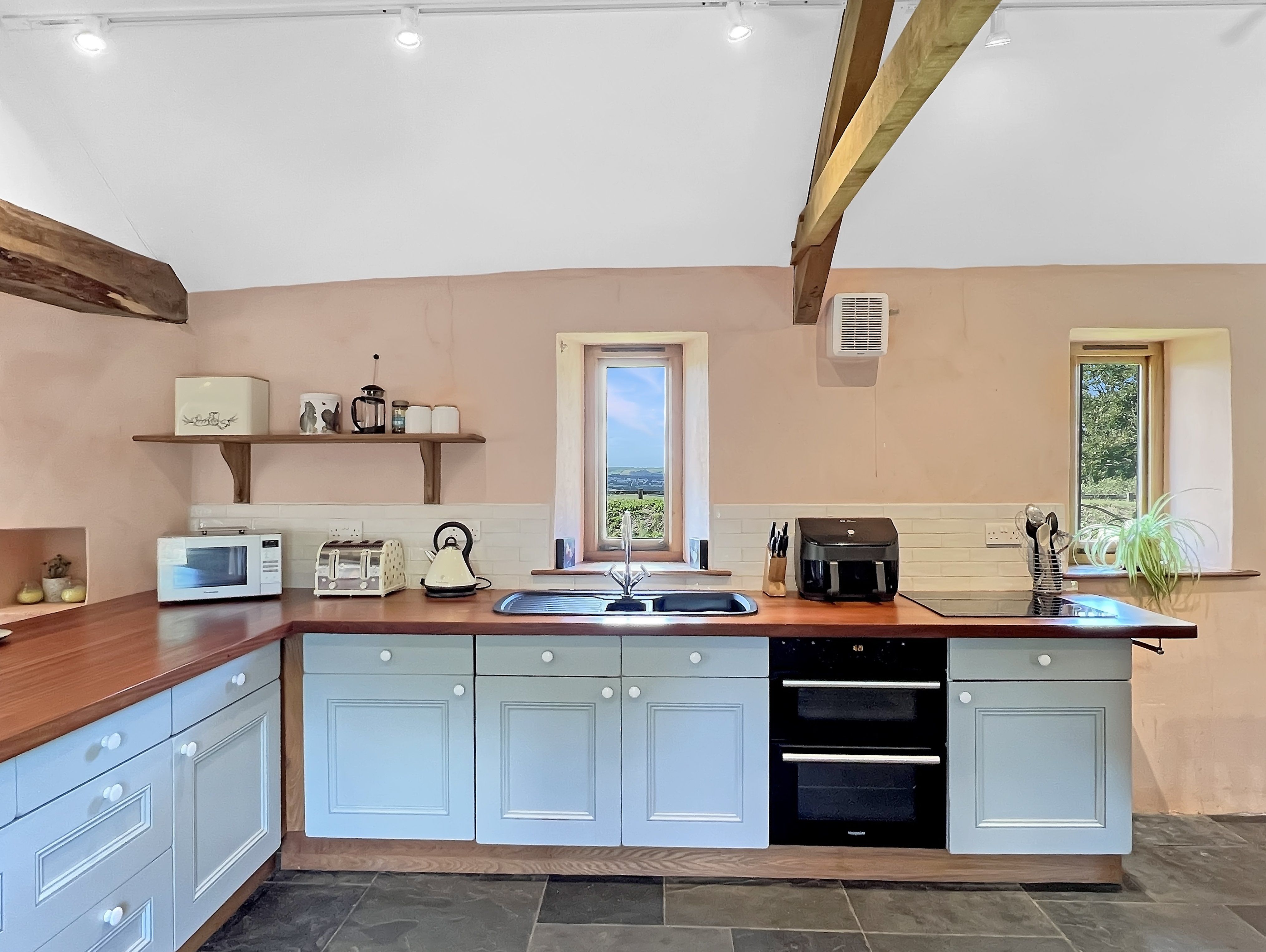 The open-plan kitchen and dining area is fully equipped for socialising and cooking, featuring essential appliances such as electric double oven and hob, American style fridge-freezer, dishwasher, microwave, toaster, air fryer, kettle, plus all the usual cookware, utensils, crockery, glassware and cutlery as you would expect. The dining area can comfortably seating for up to 6 guests.