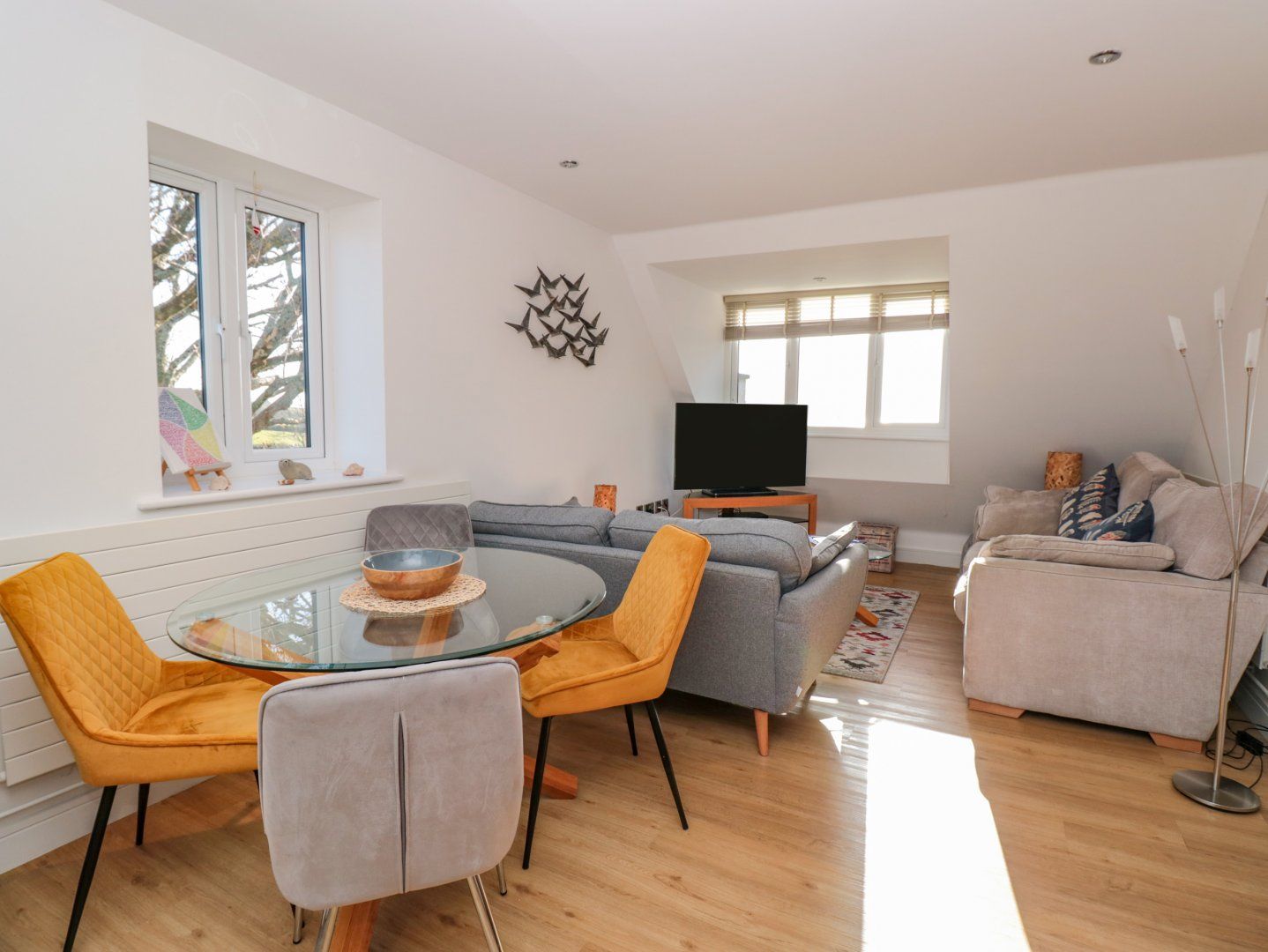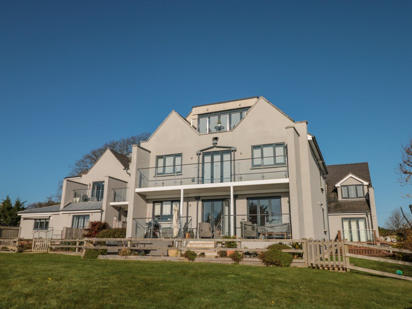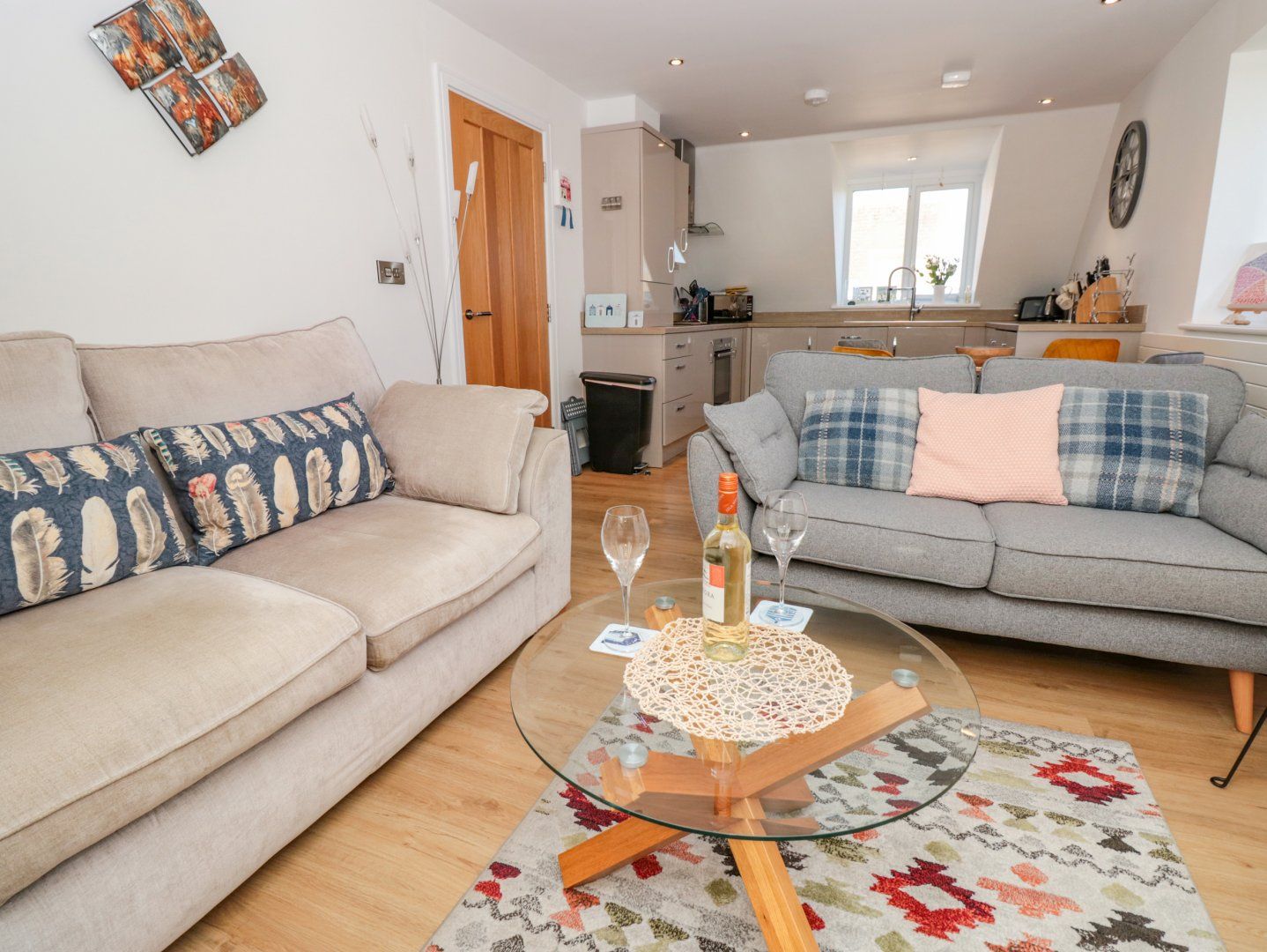 Accomodation Details First-floor apartment. Two bedrooms: 1 x king-size with en-suite walk-in shower, basin and WC, 1 x single with trundle and with Smart TV. Bathroom with bath, shower over, basin, heated towel rail and WC. Open-plan living space with kitchen, dining area and sitting area