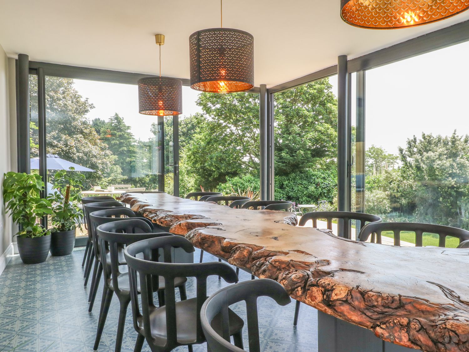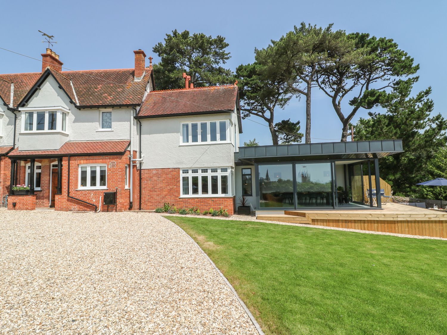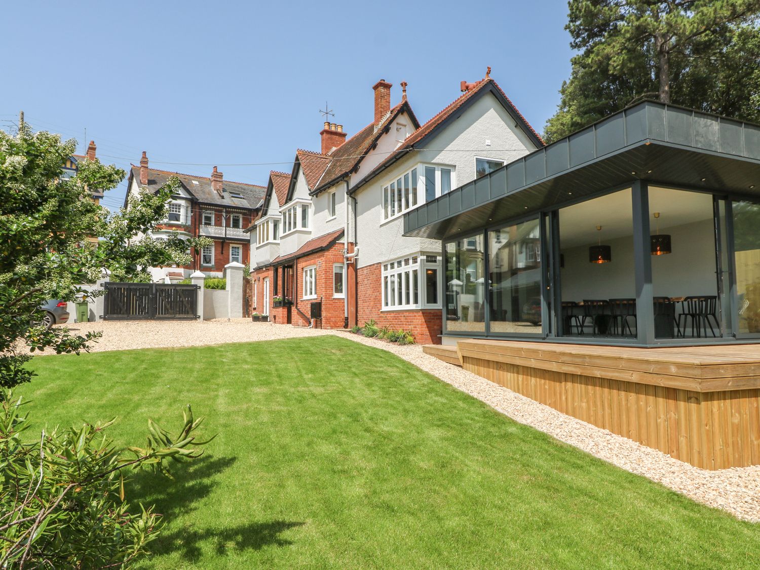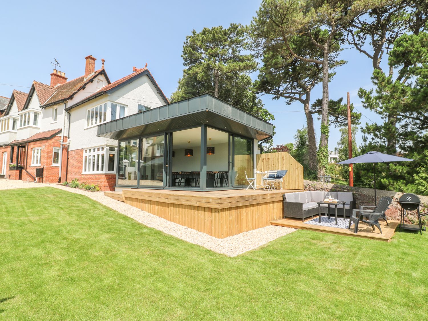 Holiday home In the heart of the popular seaside resort of Teignmouth, is The Coach House, a super stylish, luxury holiday home with lovely large enclosed garden and plenty of parking. A striking glazed dining area is the focal point and has been recently added to this lovely period property. The cosy living room has a wall mounted Smart TV for watching a movie and there is a separate games room outside to keep all amused whatever the weather. A sleek white kitchen provides opportunity to cook and prepare meals. There are six gorgeous bedrooms, two of which are en-suite. On the ground floor there is a bunk room and double room with a family shower room. On the first floor two bedrooms are en-suite, one with roll top bath and they all have sea views. There is plenty of space outside for children to play and adults to relax in the sunshine on the patio or the deck. Note: Please be aware that there are three shallow, carpeted steps with a grabrail down into the living room
