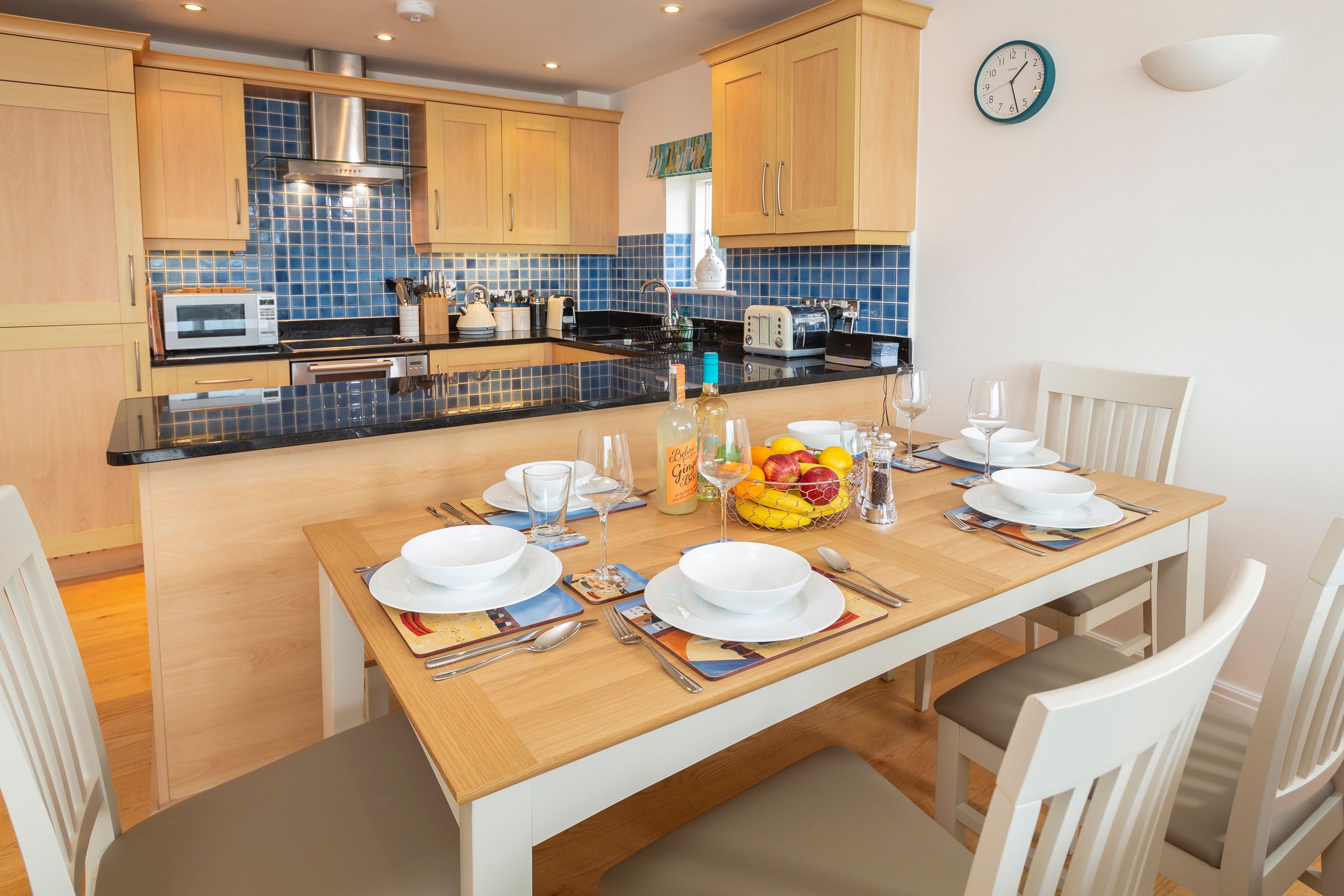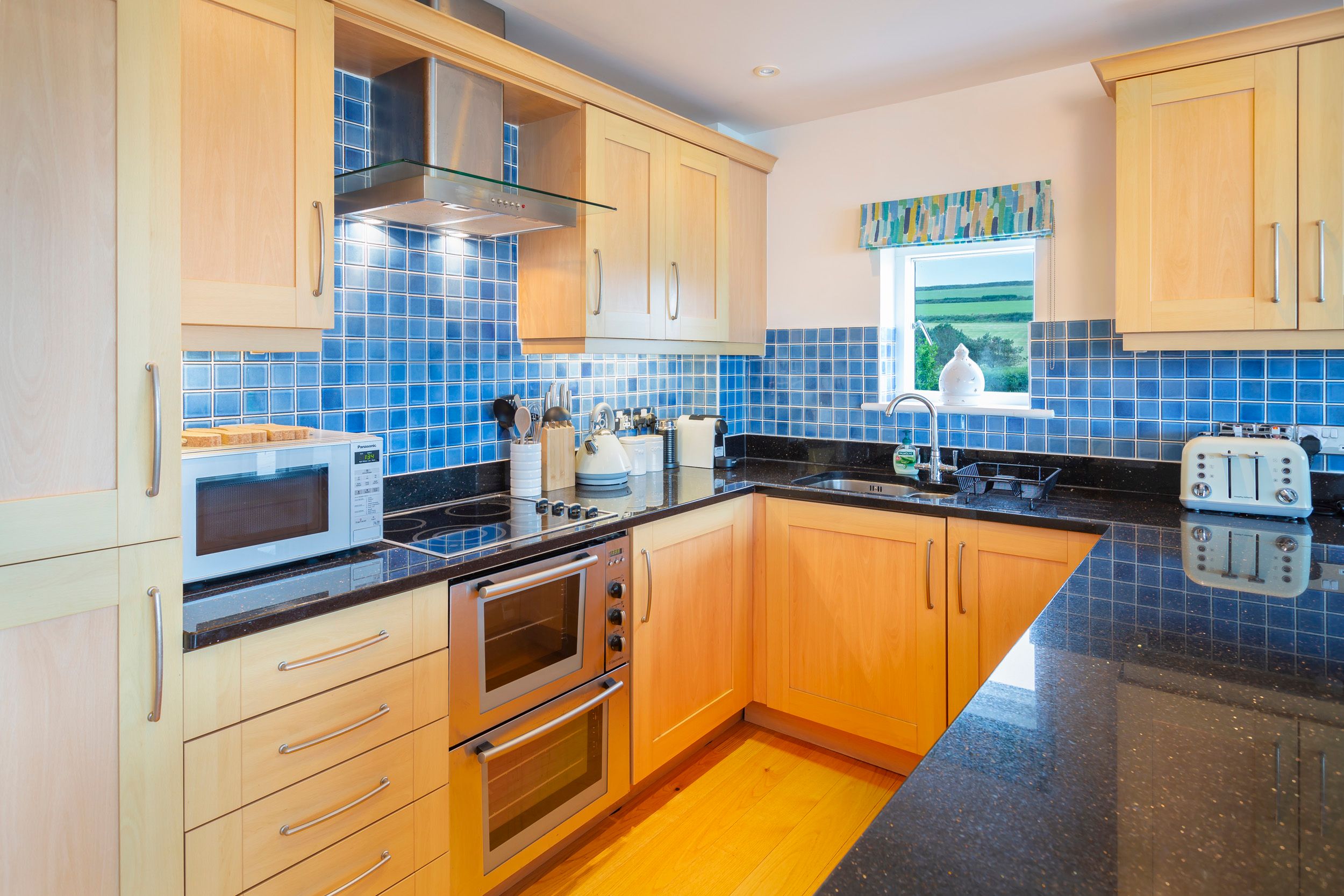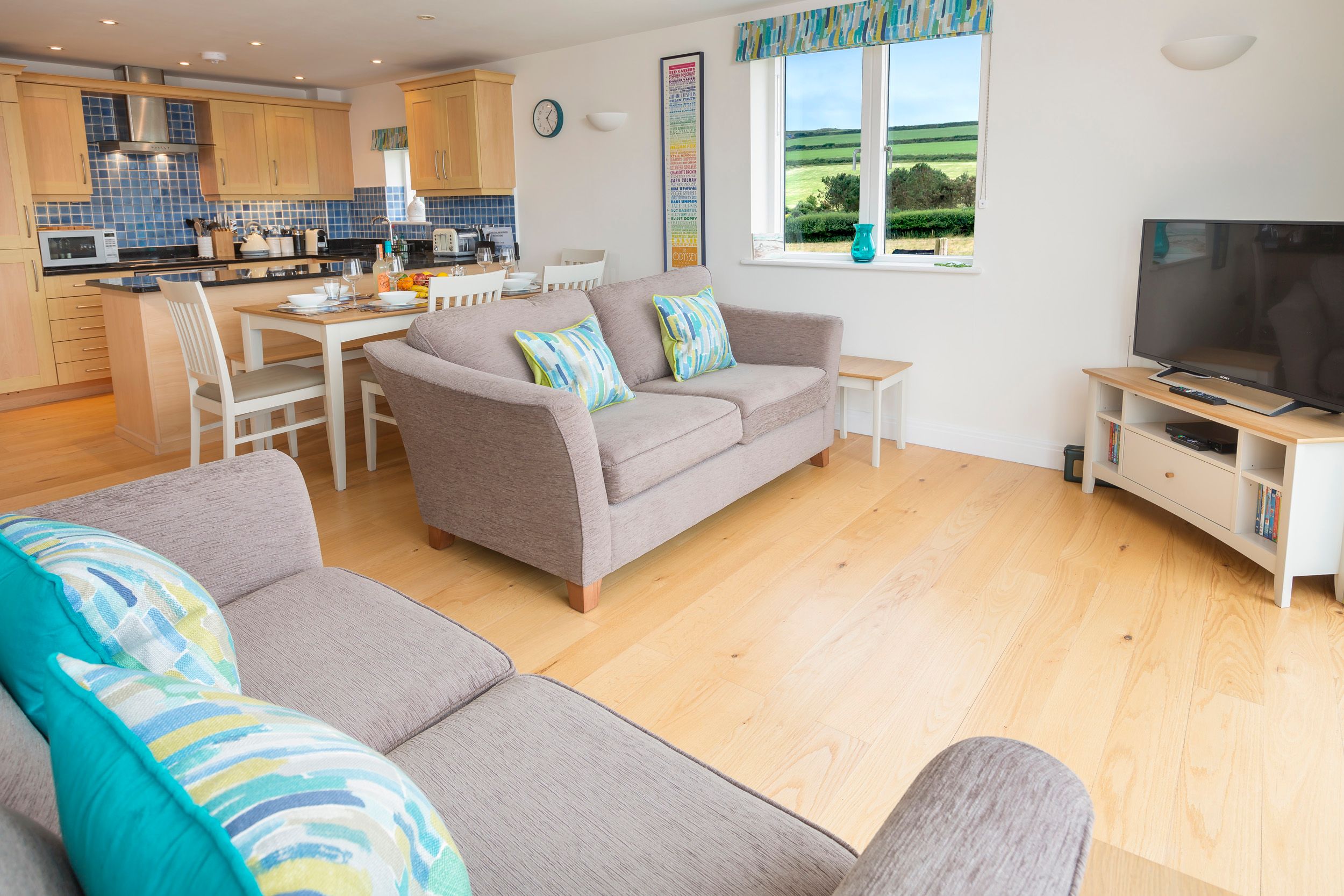 Underfloor heating in all rooms. Wireless broadband internet available. Shared swimming pool usually open from late May to September. Four-ring ceramic hob, electric double oven, integrated fridge/freezer, dishwasher, microwave, and Nespresso coffee machine. Smart TV, DVD player, Roberts radio and Bluetooth speaker. Wall mounted TV and DVD player in twin bedroom. All duvets, pillows, bed linen and towels are provided – guests need to bring tea towels, beach towels and oven gloves.