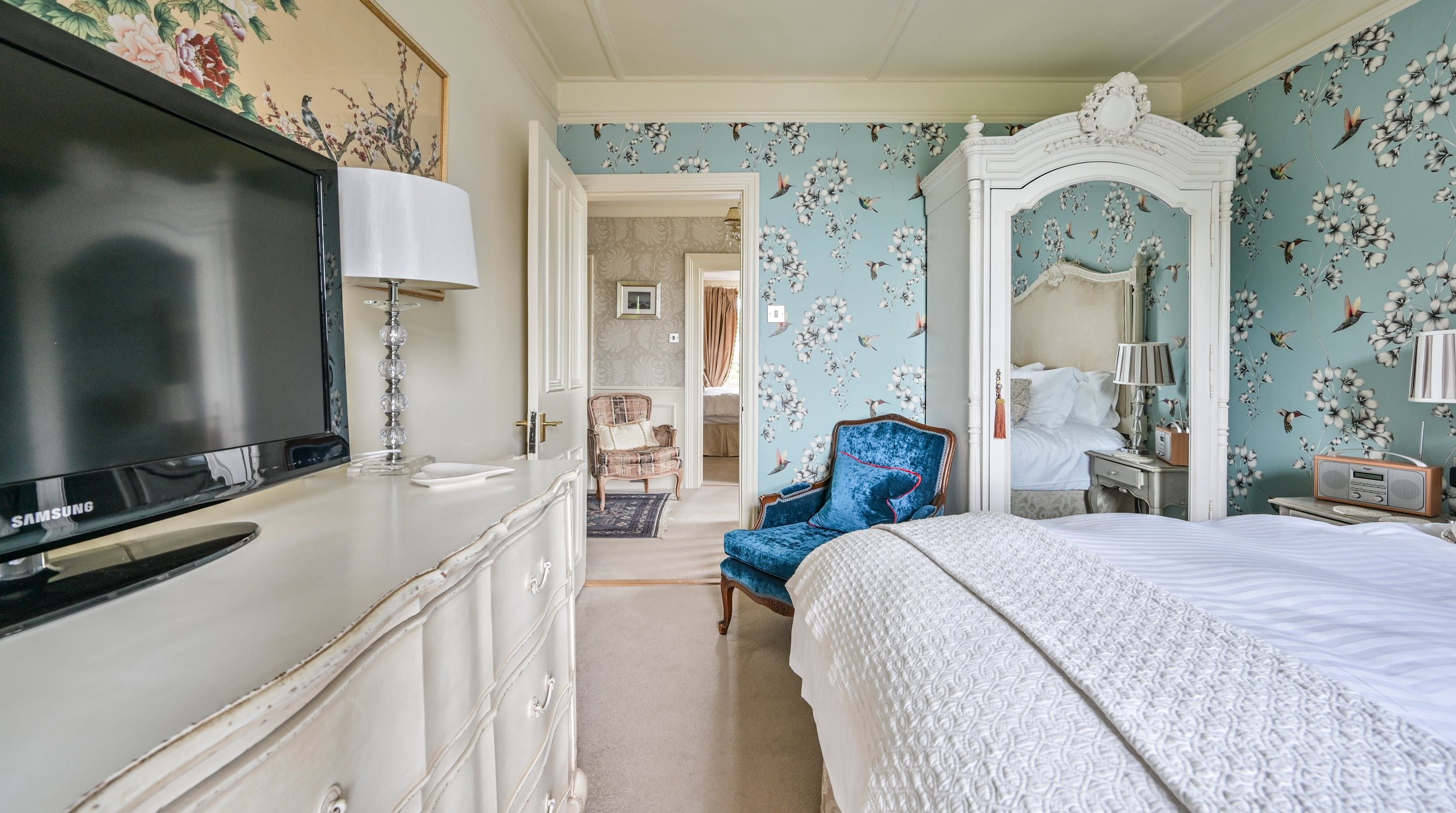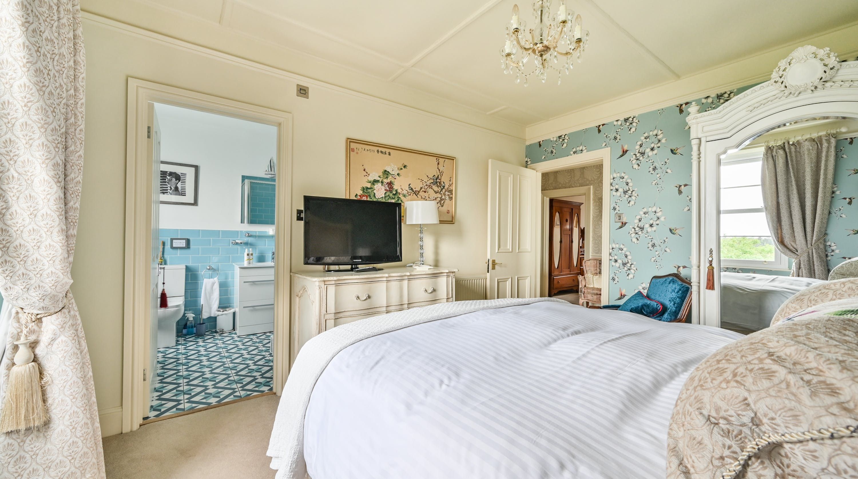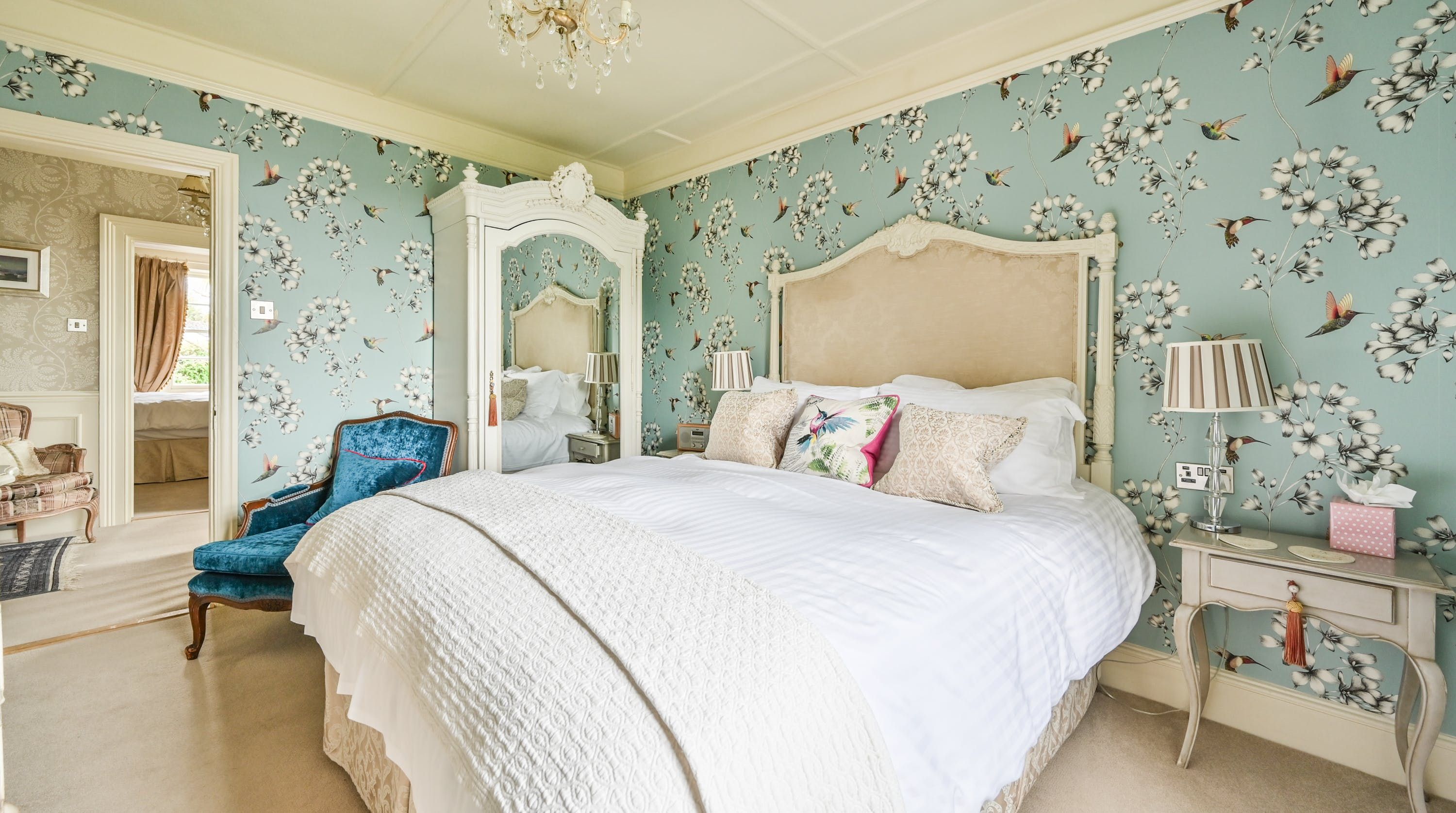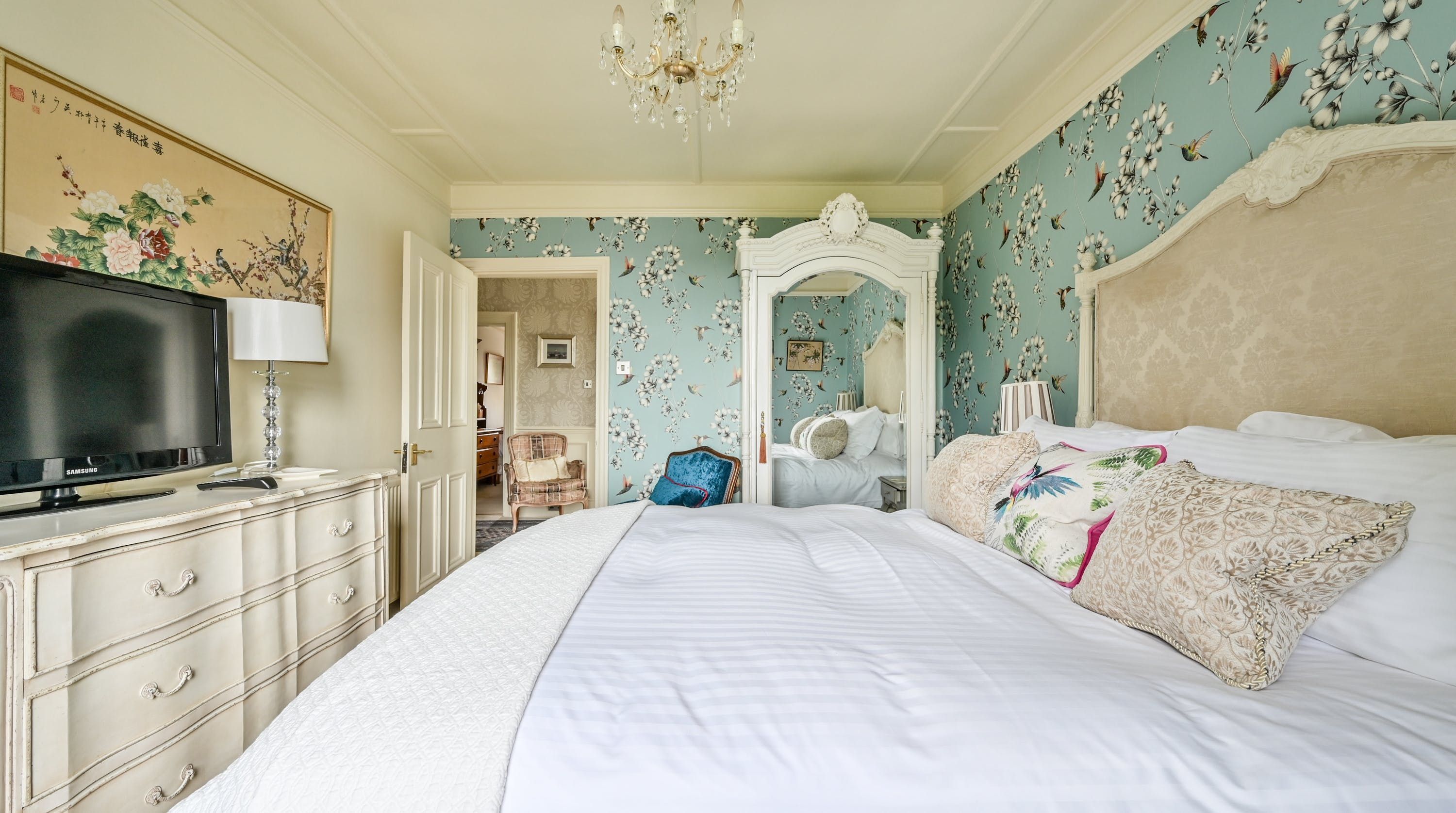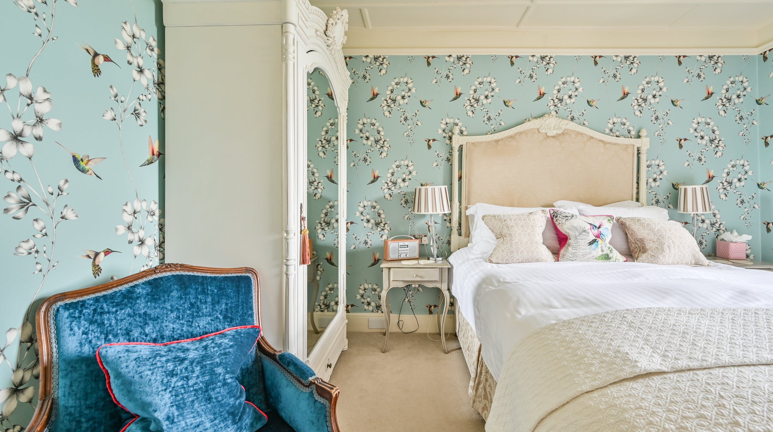 Having been renovated in 2022, the design brings together boldly patterned wallpaper, a smattering of antique furnishings, some well-chosen pieces of artwork and tufted furnishings to create an interior that feels traditional but far from stale. The bright blue tiling in the bathroom is rather fetching, too