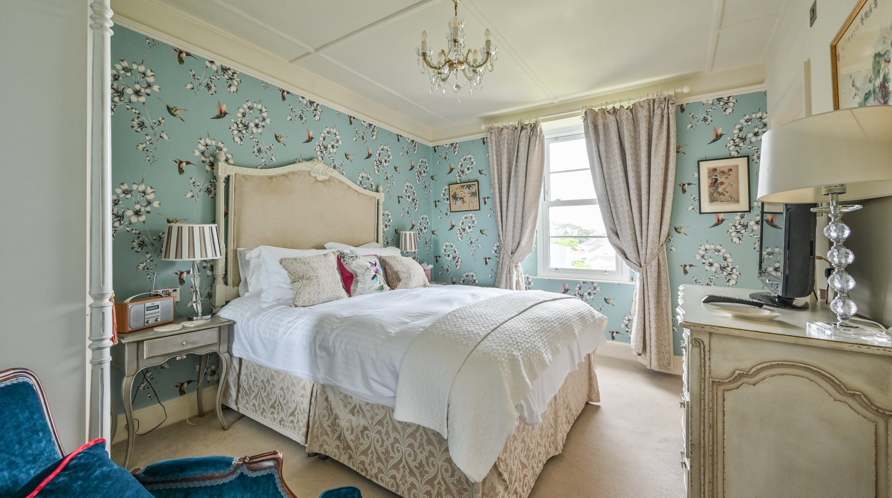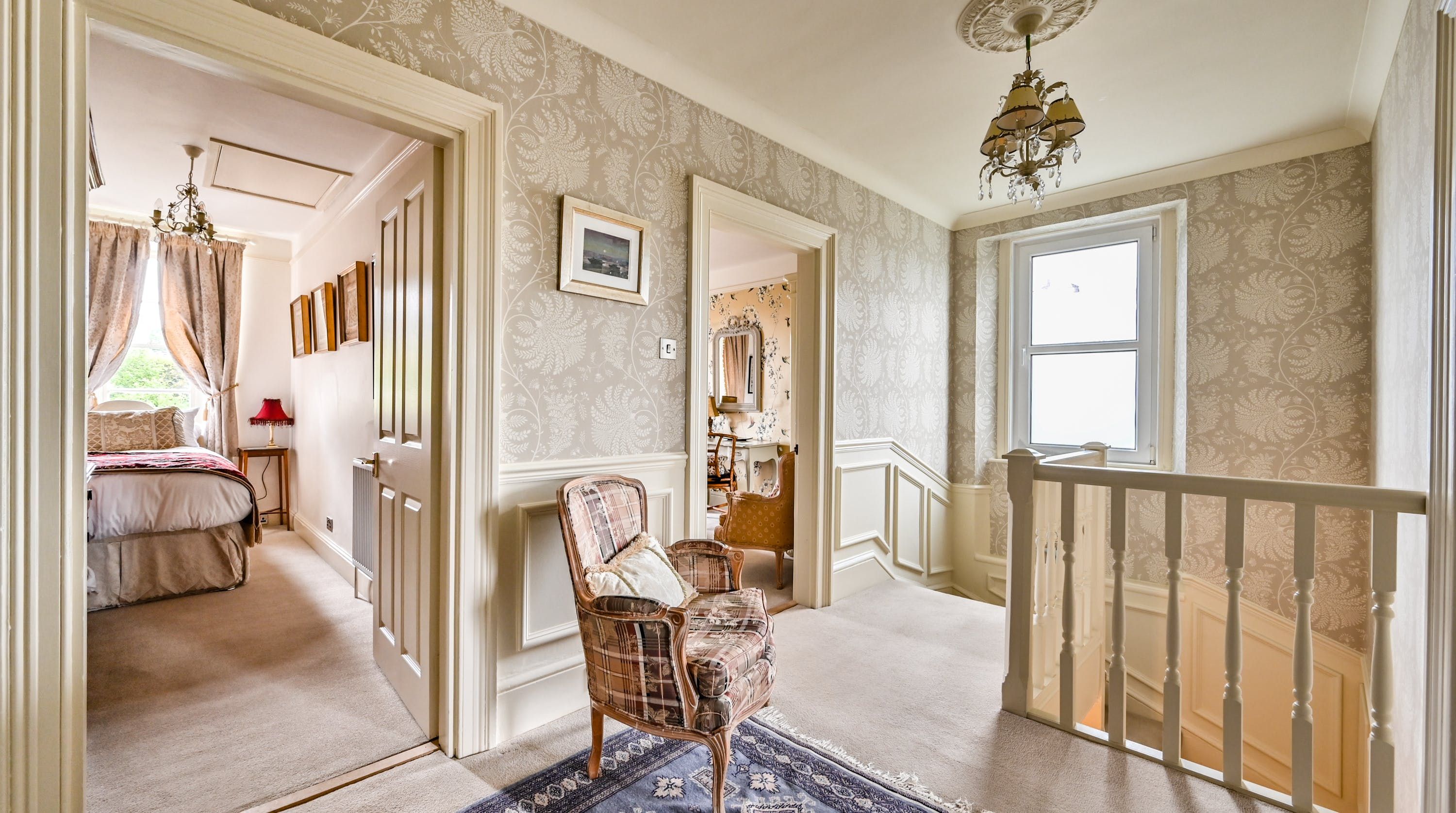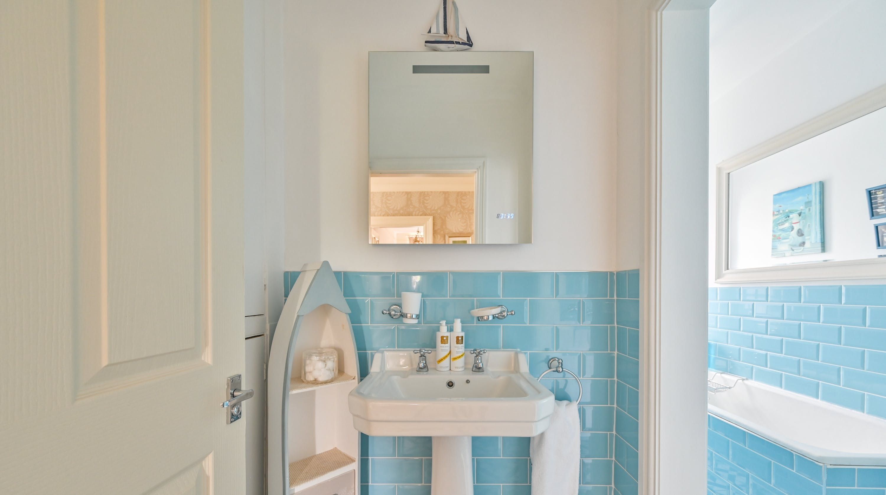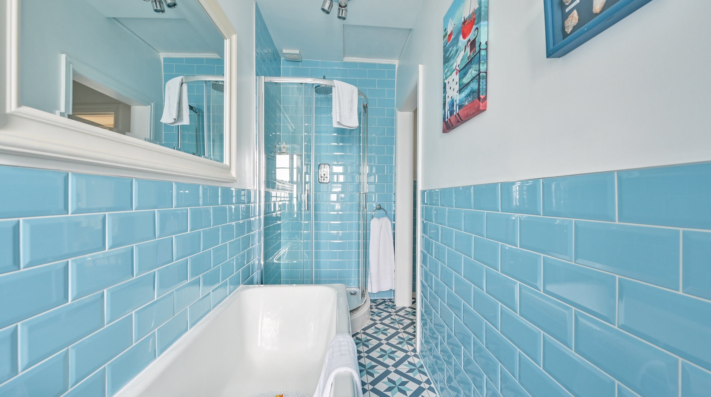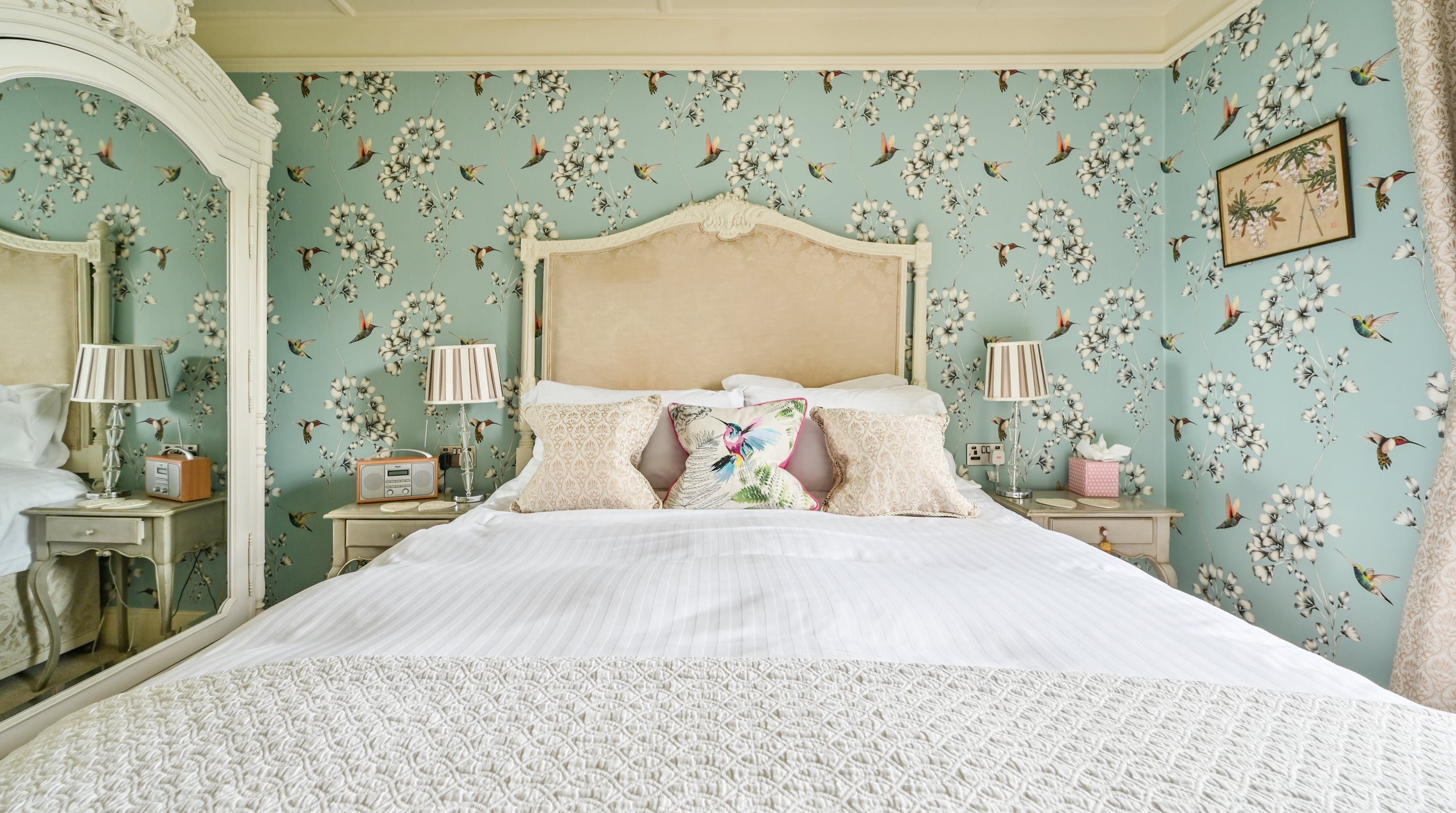 Having been renovated in 2022, the design brings together boldly patterned wallpaper, a smattering of antique furnishings, some well-chosen pieces of artwork and tufted furnishings to create an interior that feels traditional but far from stale. The bright blue tiling in the bathroom is rather fetching, too