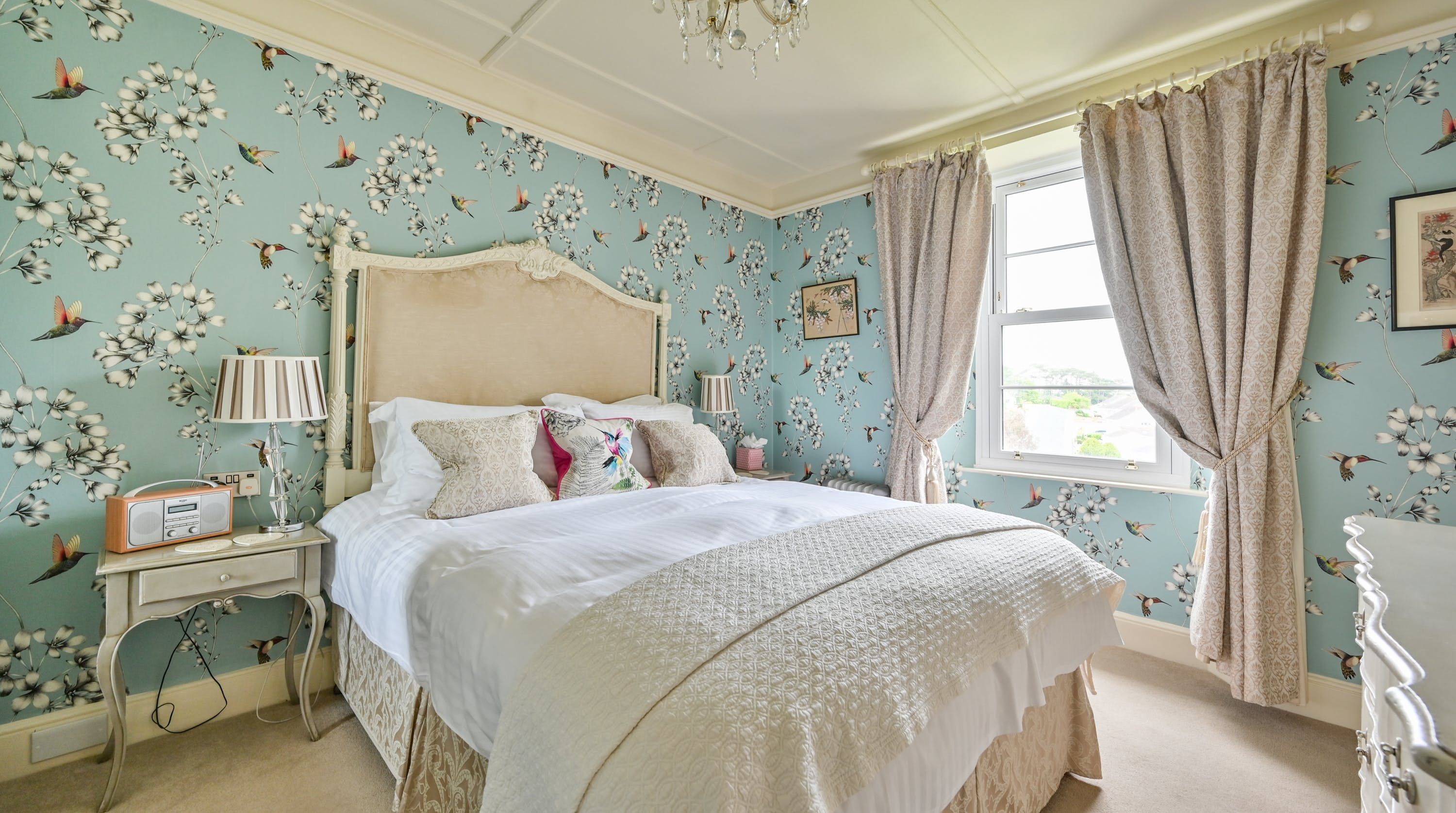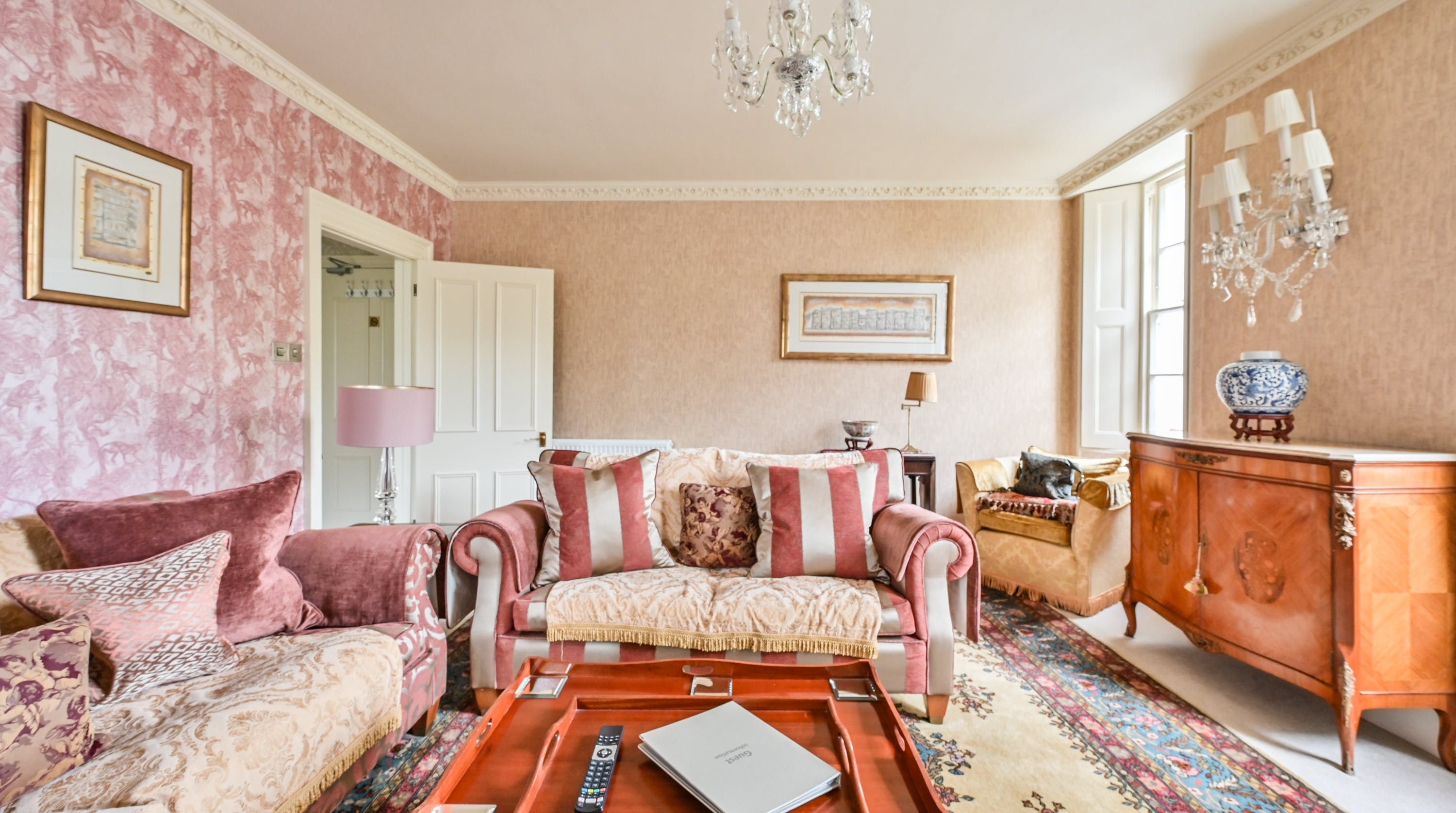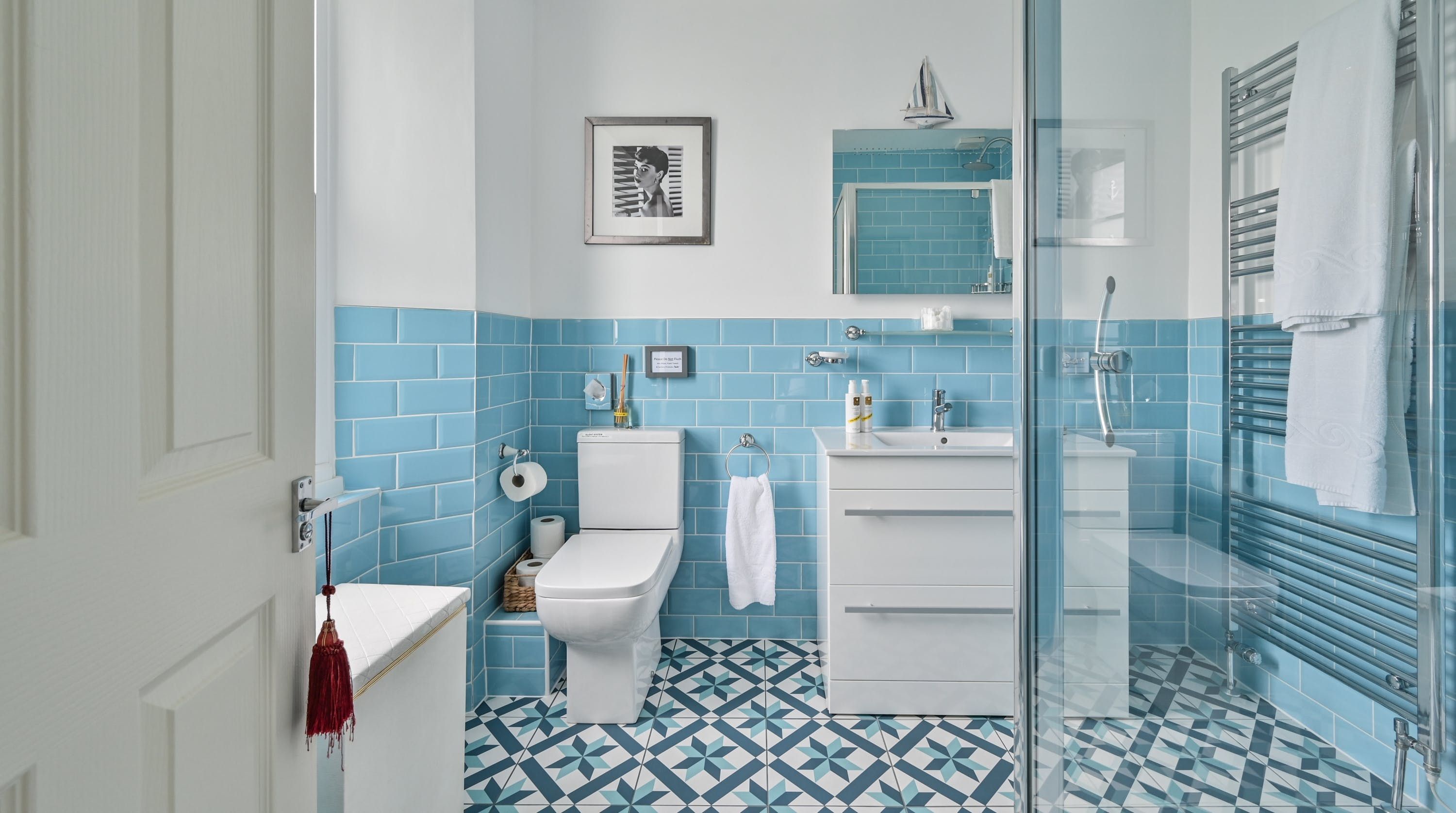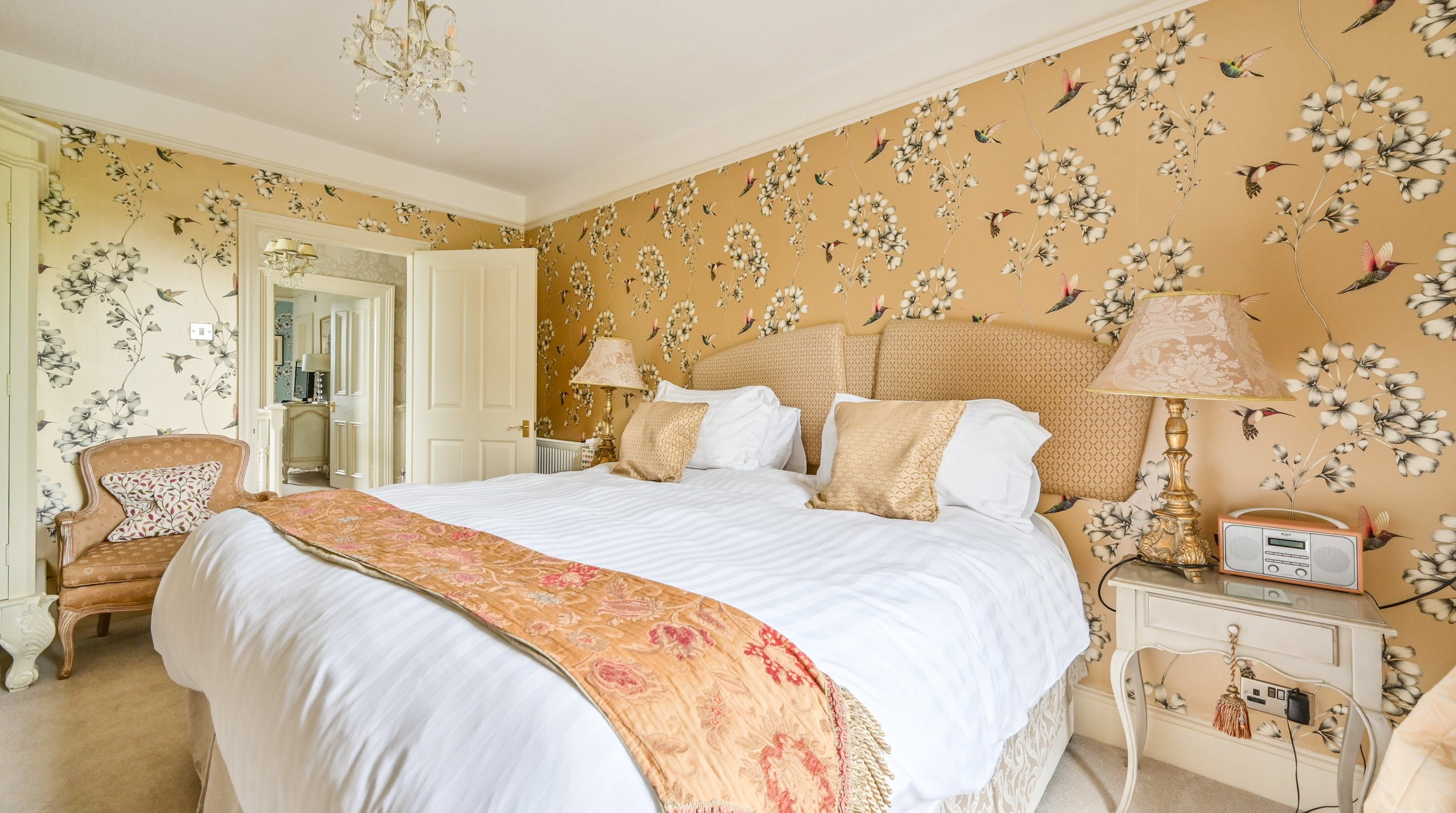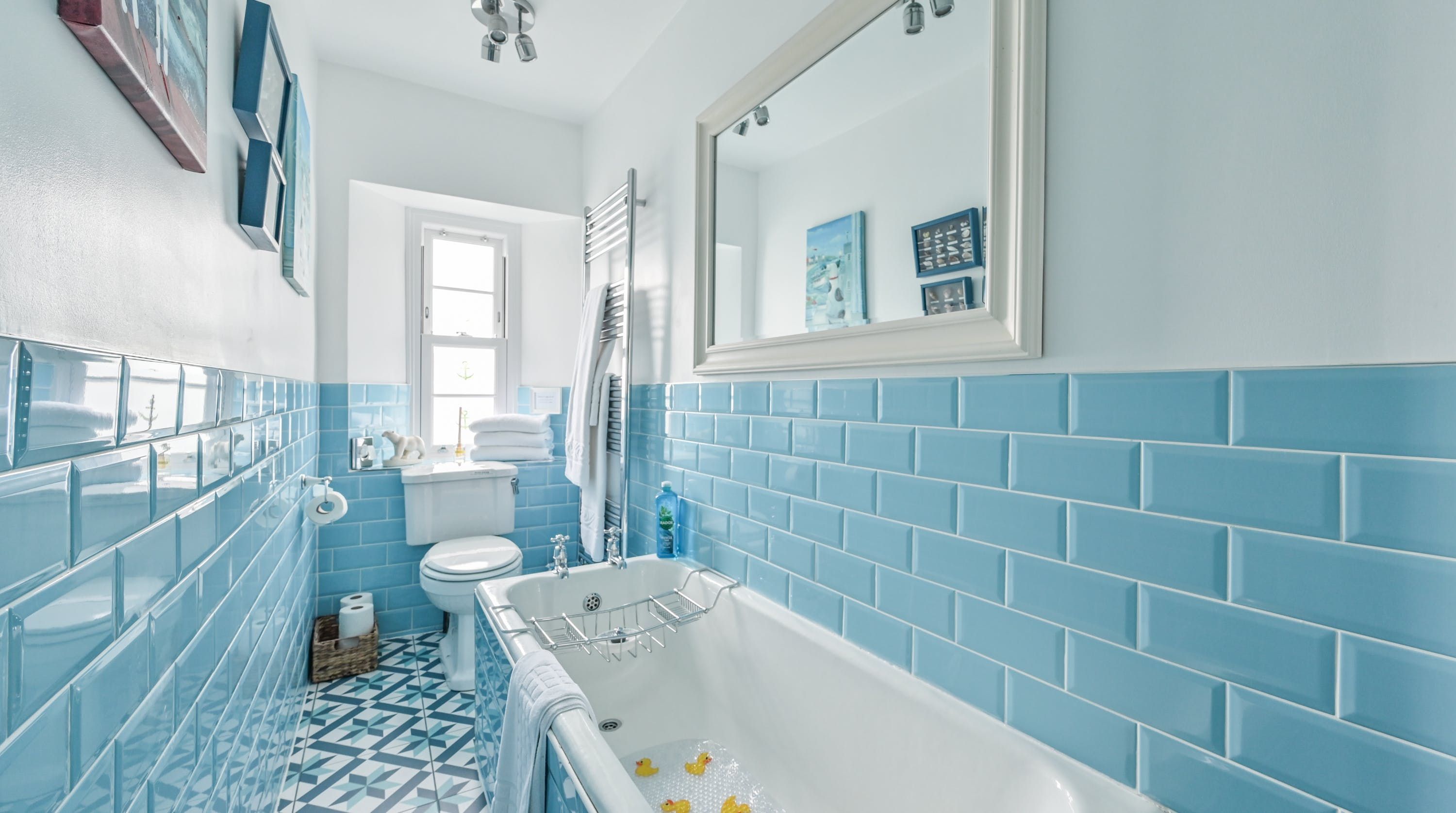 Having been renovated in 2022, the design brings together boldly patterned wallpaper, a smattering of antique furnishings, some well-chosen pieces of artwork and tufted furnishings to create an interior that feels traditional but far from stale. The bright blue tiling in the bathroom is rather fetching, too