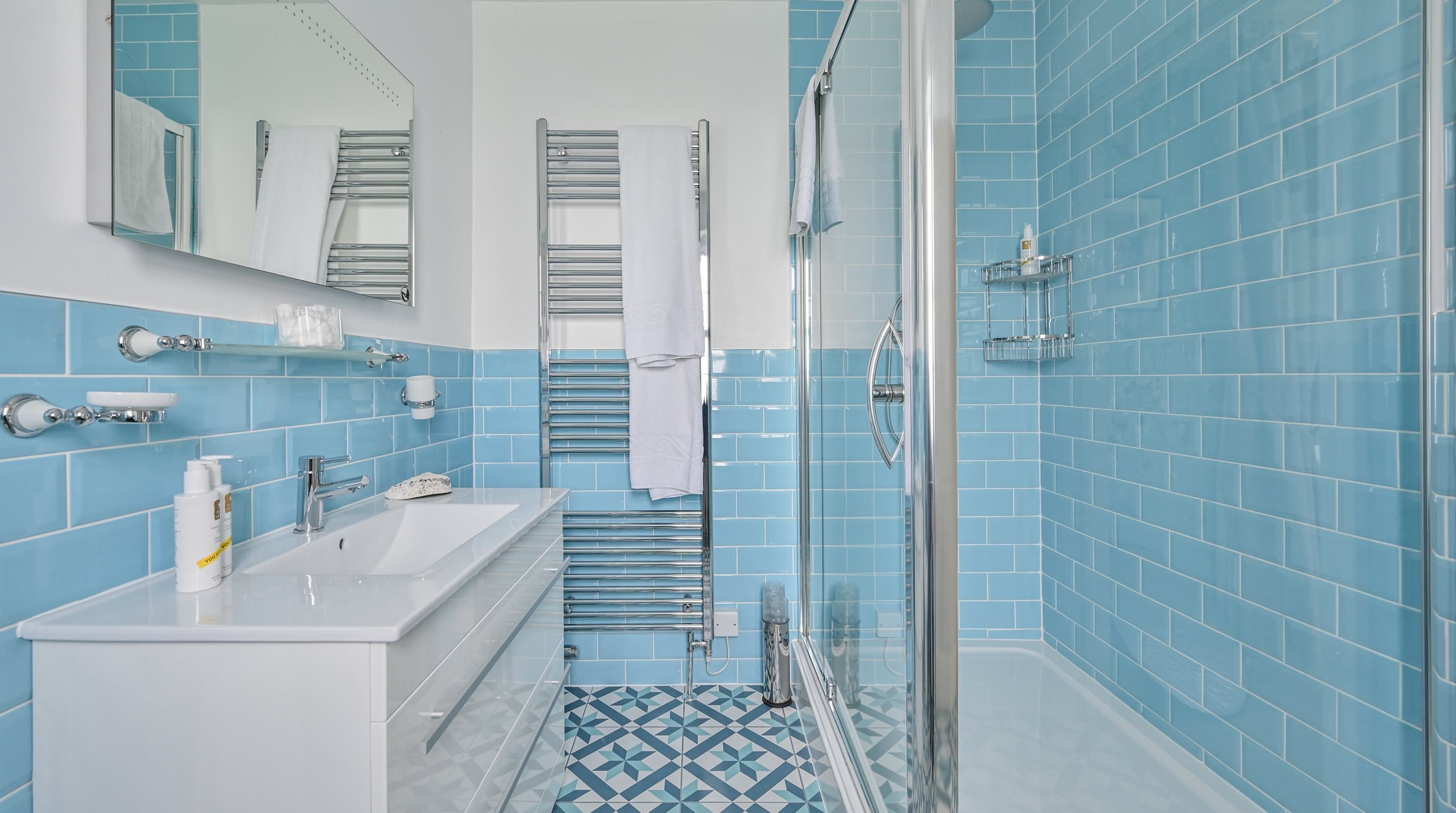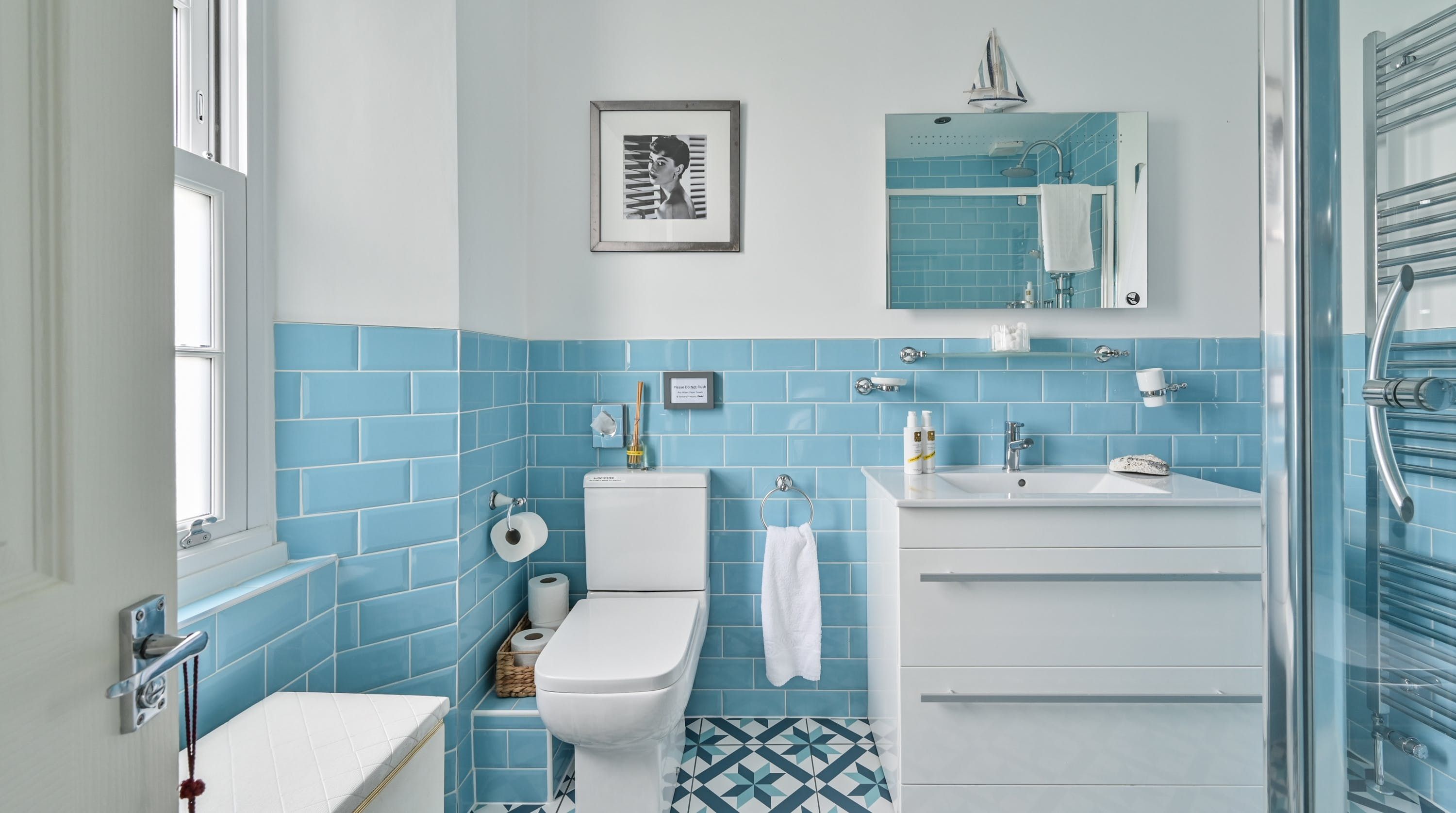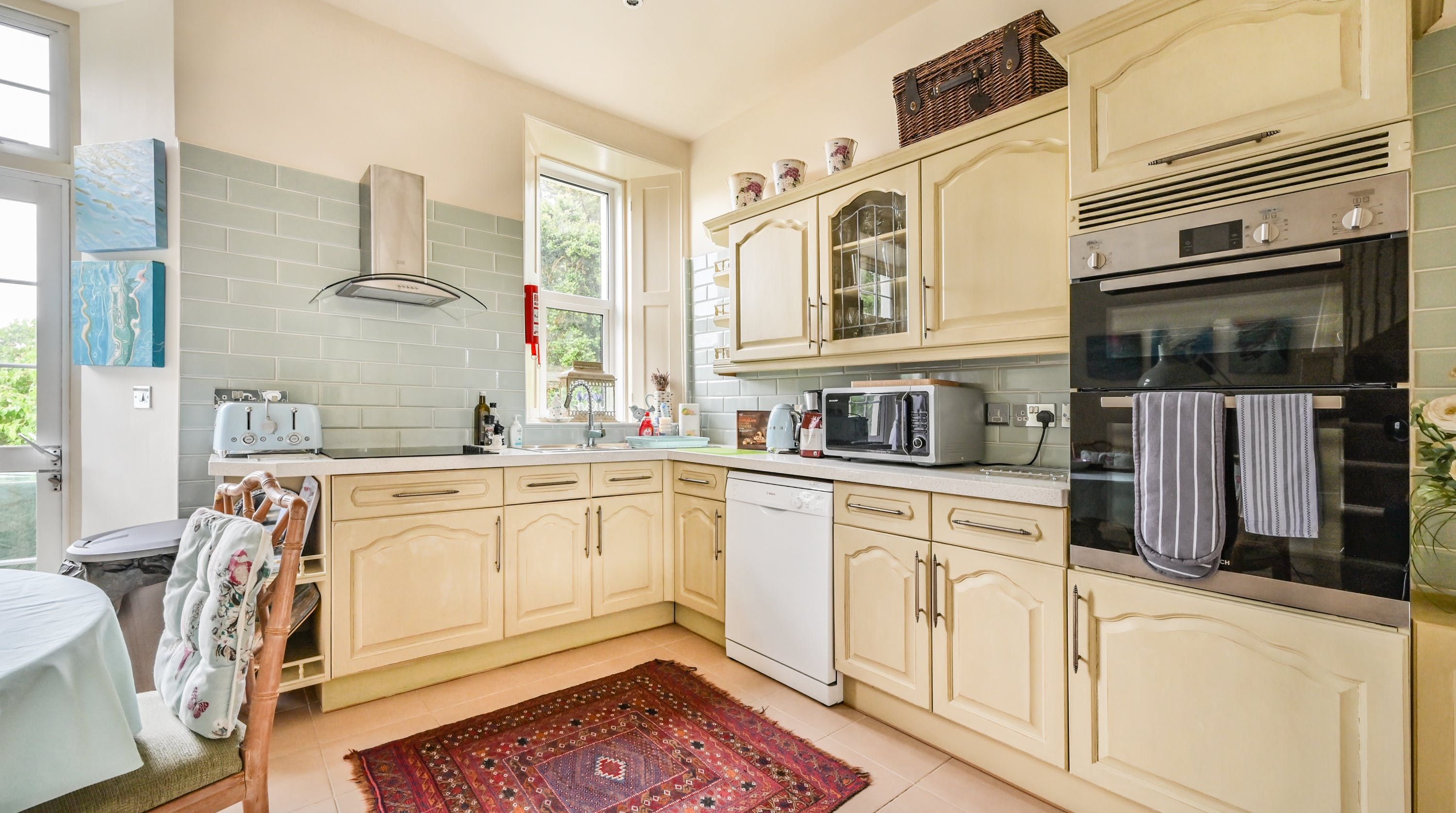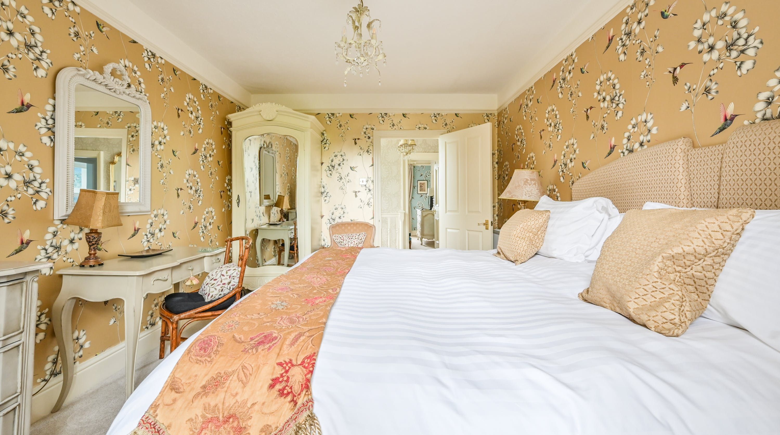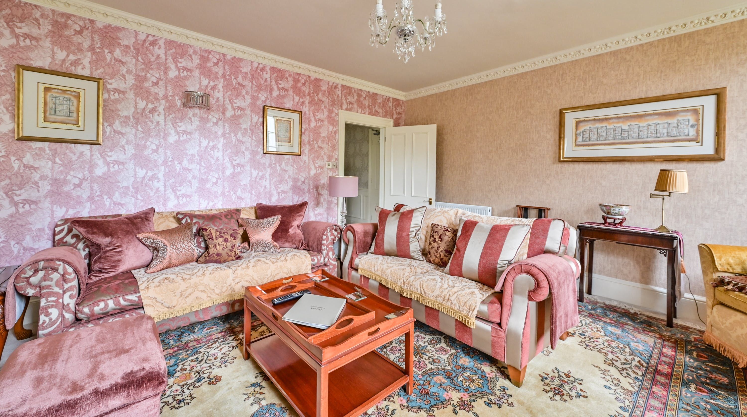 Having been renovated in 2022, the design brings together boldly patterned wallpaper, a smattering of antique furnishings, some well-chosen pieces of artwork and tufted furnishings to create an interior that feels traditional but far from stale. The bright blue tiling in the bathroom is rather fetching, too