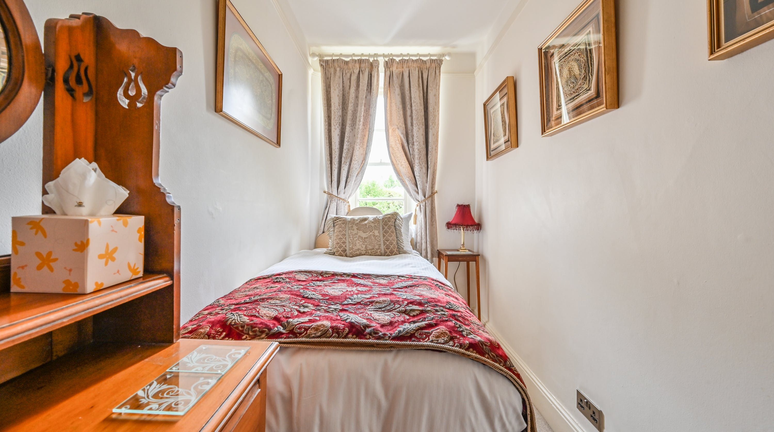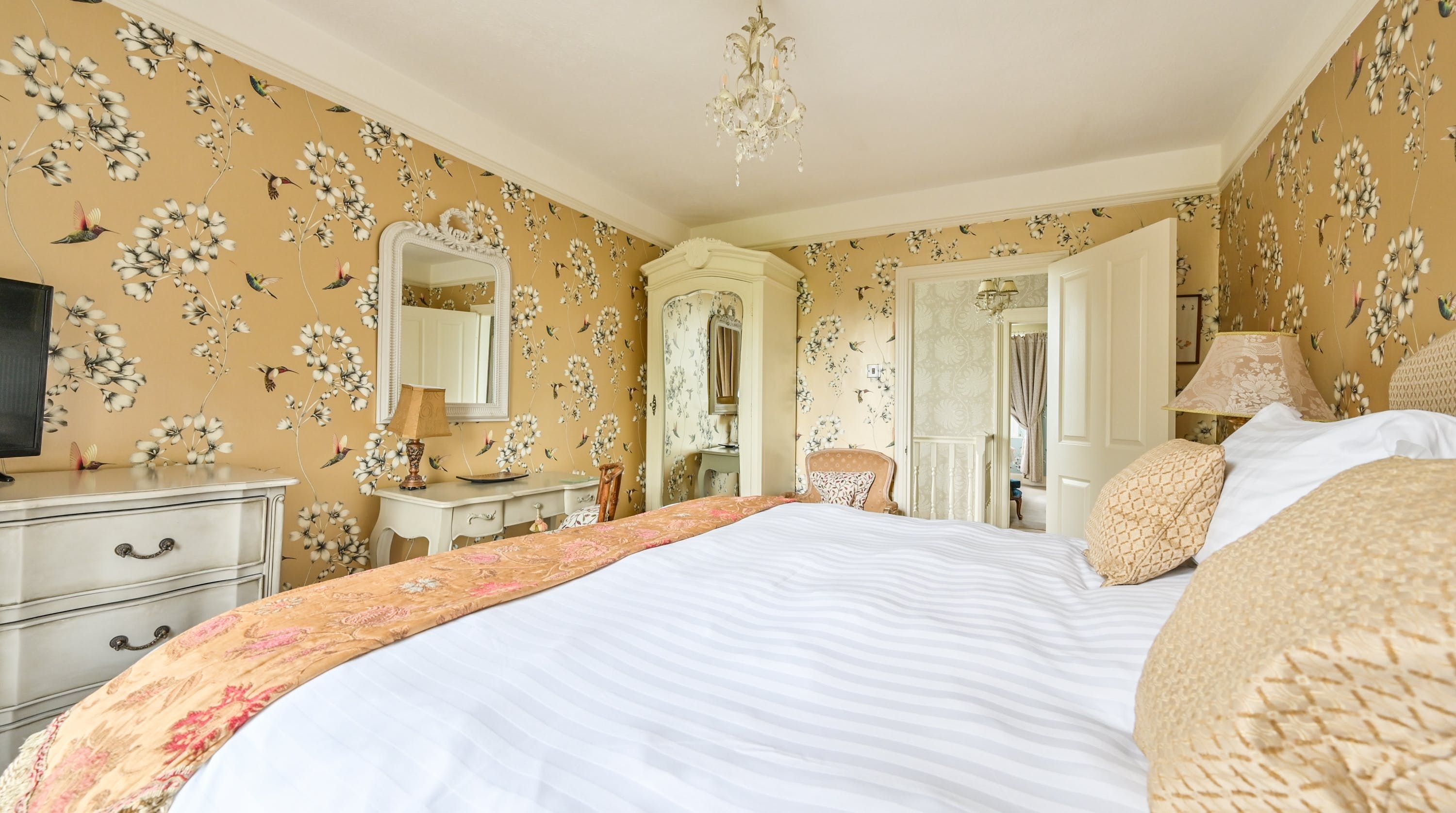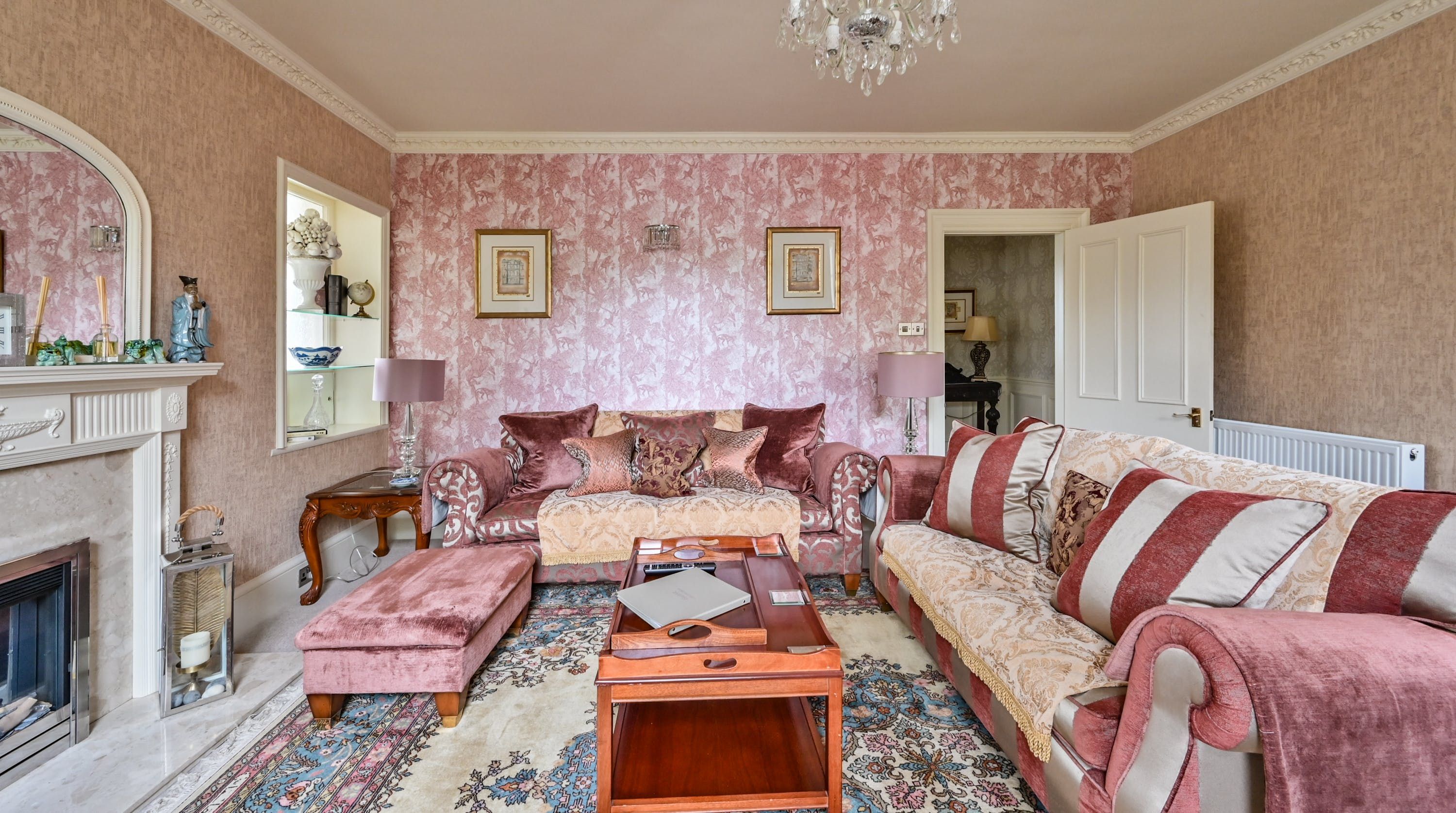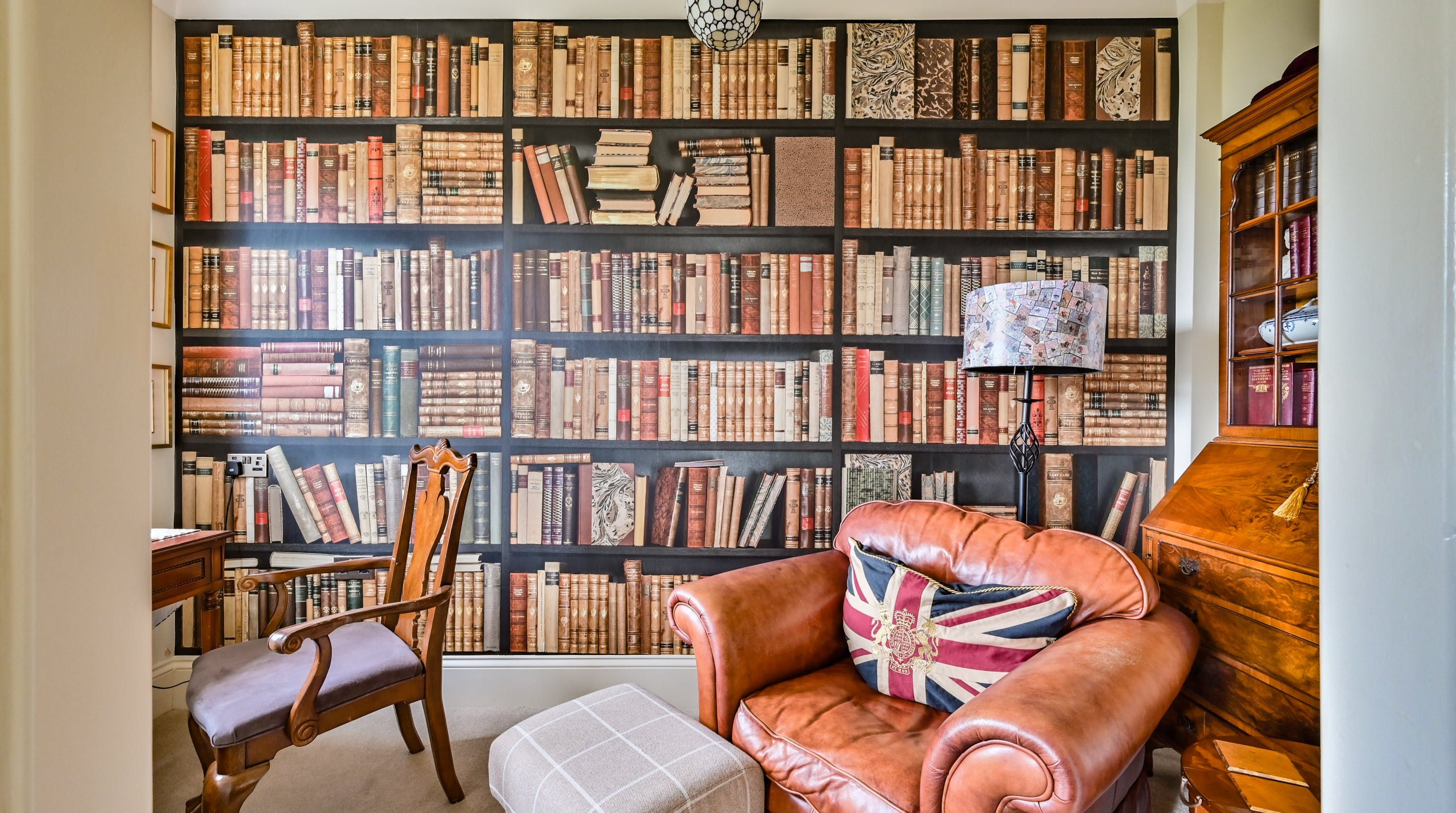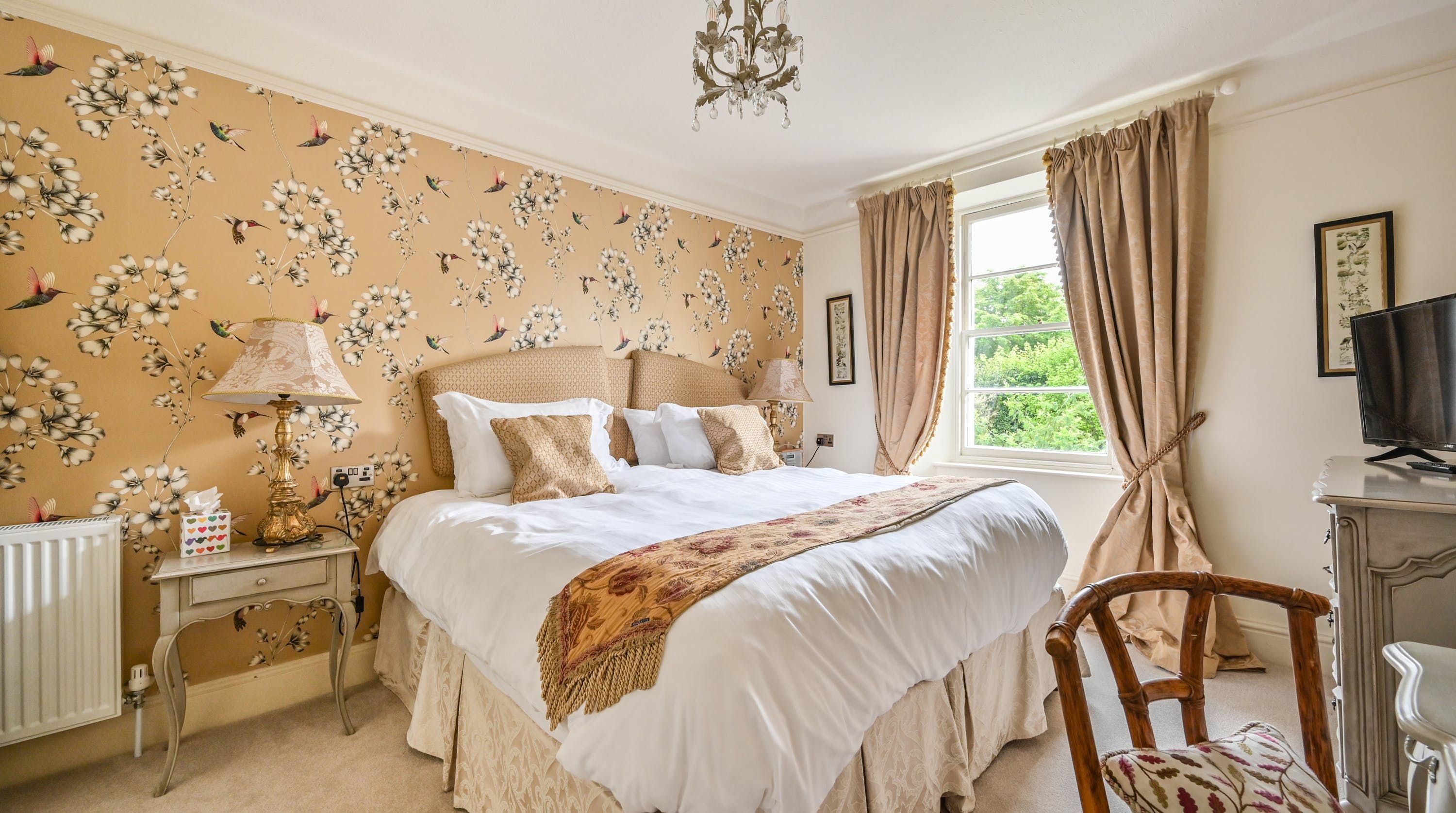 Having been renovated in 2022, the design brings together boldly patterned wallpaper, a smattering of antique furnishings, some well-chosen pieces of artwork and tufted furnishings to create an interior that feels traditional but far from stale. The bright blue tiling in the bathroom is rather fetching, too