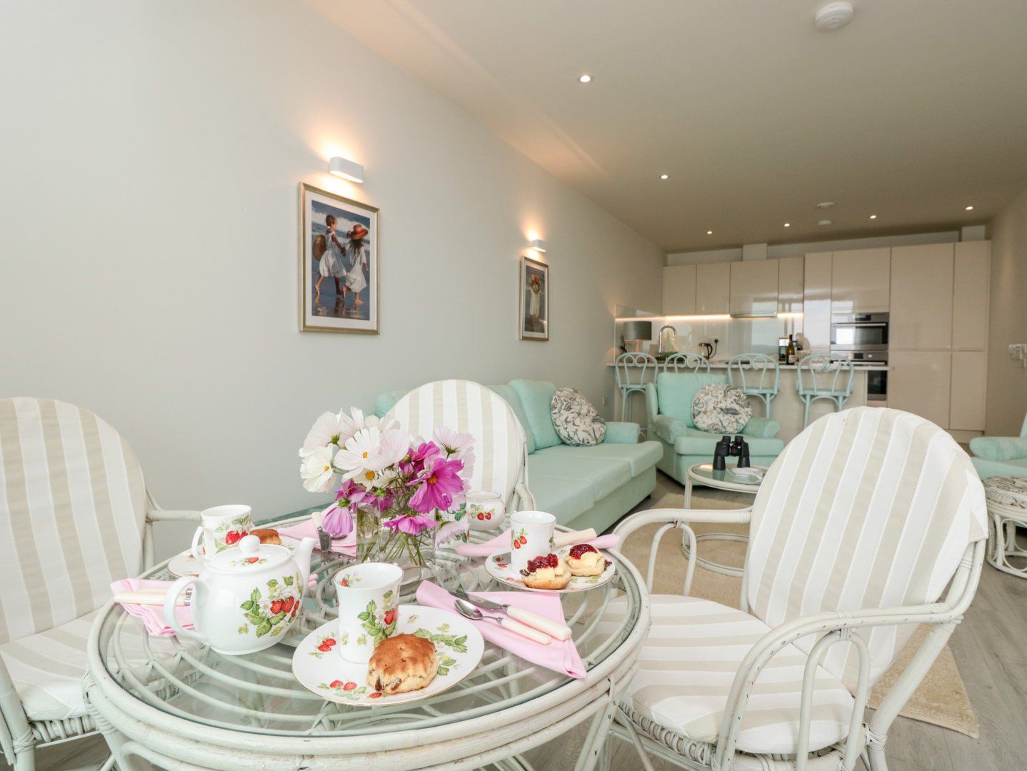 Second-floor apartment. Two bedrooms with Smart TVs and access to balcony: 1 x king-size with en-suite walk-in shower, basin, and WC, 1 x twin. Bathroom with bath, shower over, basin, and WC. Open-plan living space with kitchen, dining area and sitting area with balcony
