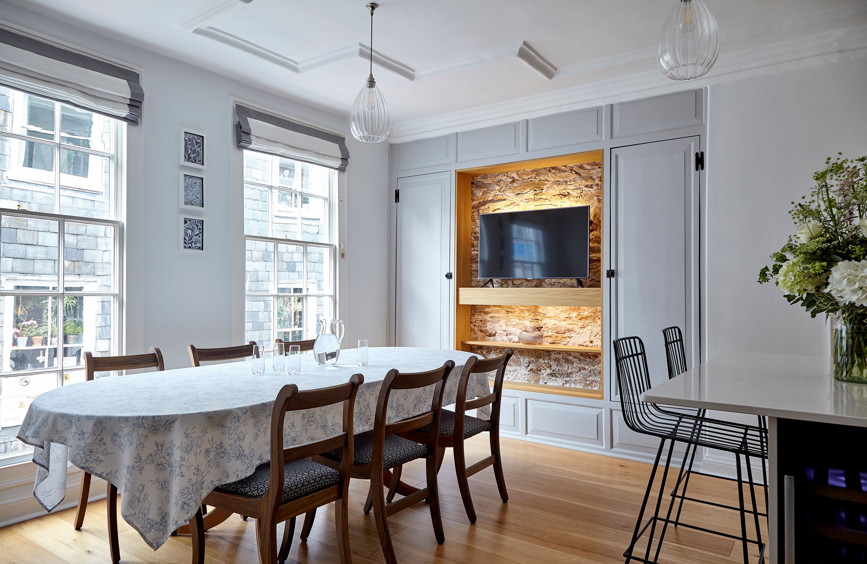 This 16th-century townhouse is right on the historic High Street of Totnes, an easy walk from independent boutiques, cafes, bakeries and restaurants. Both moor and coastline are within a few miles, with Dartmoor National Park only a twelve-minute drive away and the golden stretches of Broadsands Beach just a twenty-minute drive. Back at home, you’ll find a thoughtfully designed home whose historic ceilings and original features are complemented by contemporary furnishings. Unwind in the elegant sitting room under the stately chandelier and enjoy afternoon tea. The kitchen is well-equipped for home-cooked meals, and we especially love the oval dining table with a view of the street for entertaining. At the end of the day, you’ll find the bedrooms share the same elegant atmosphere and eye to comfort. Settle in for a night of dreamy, restorative sleep.