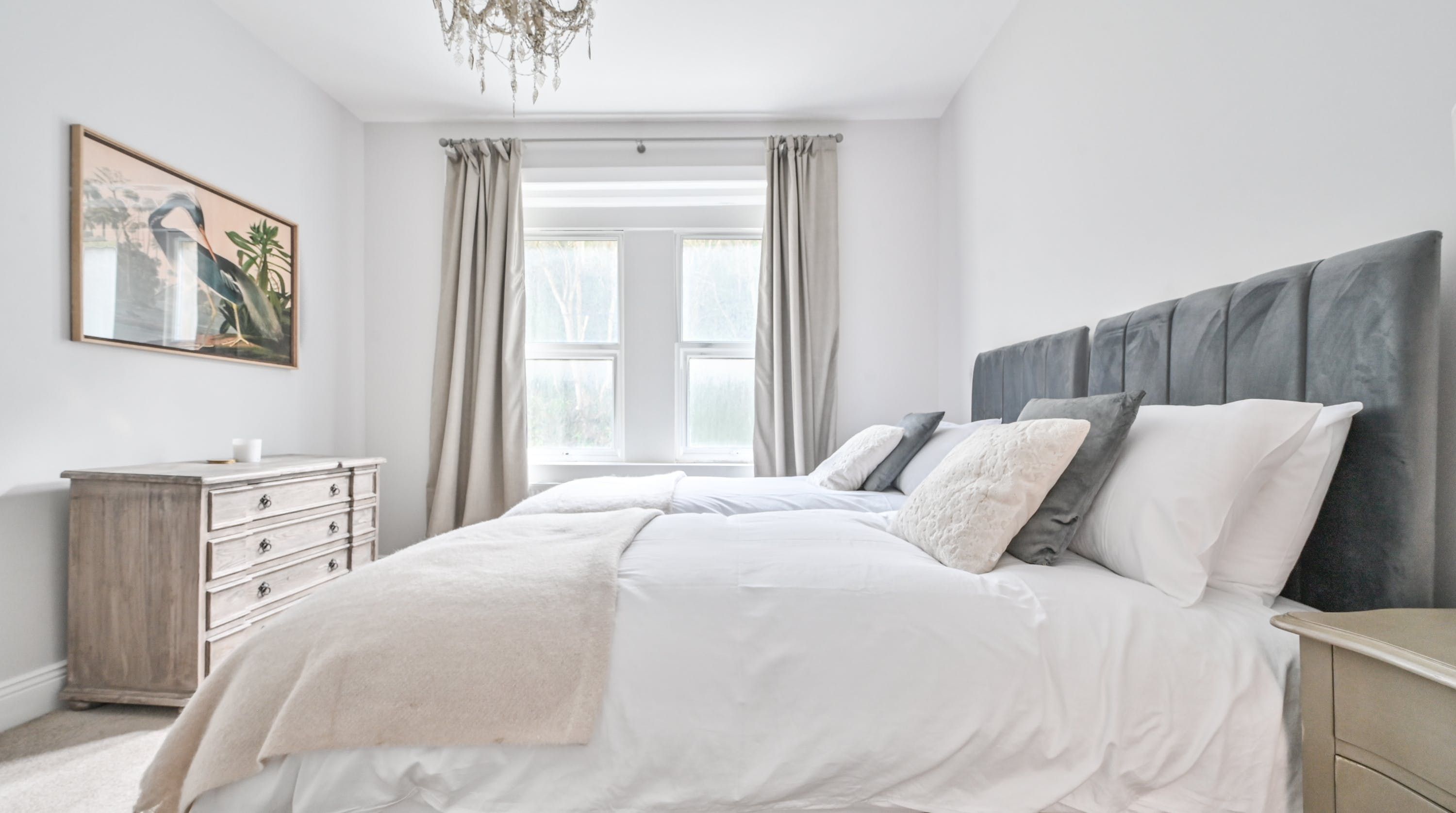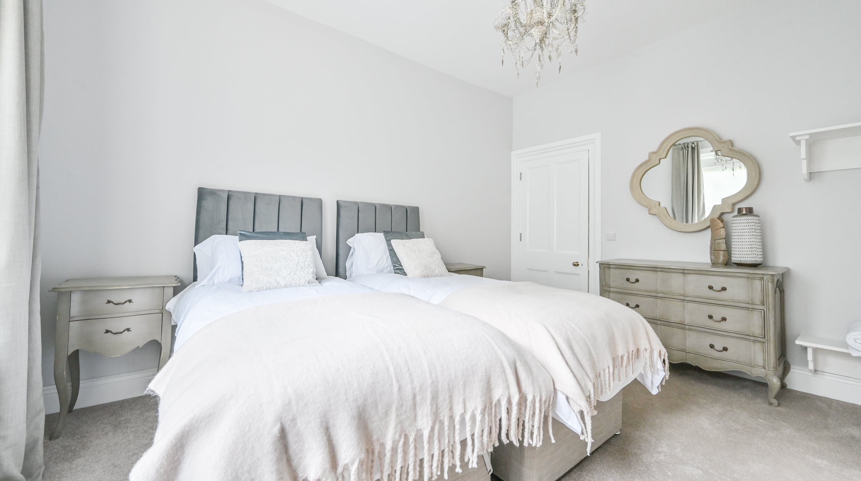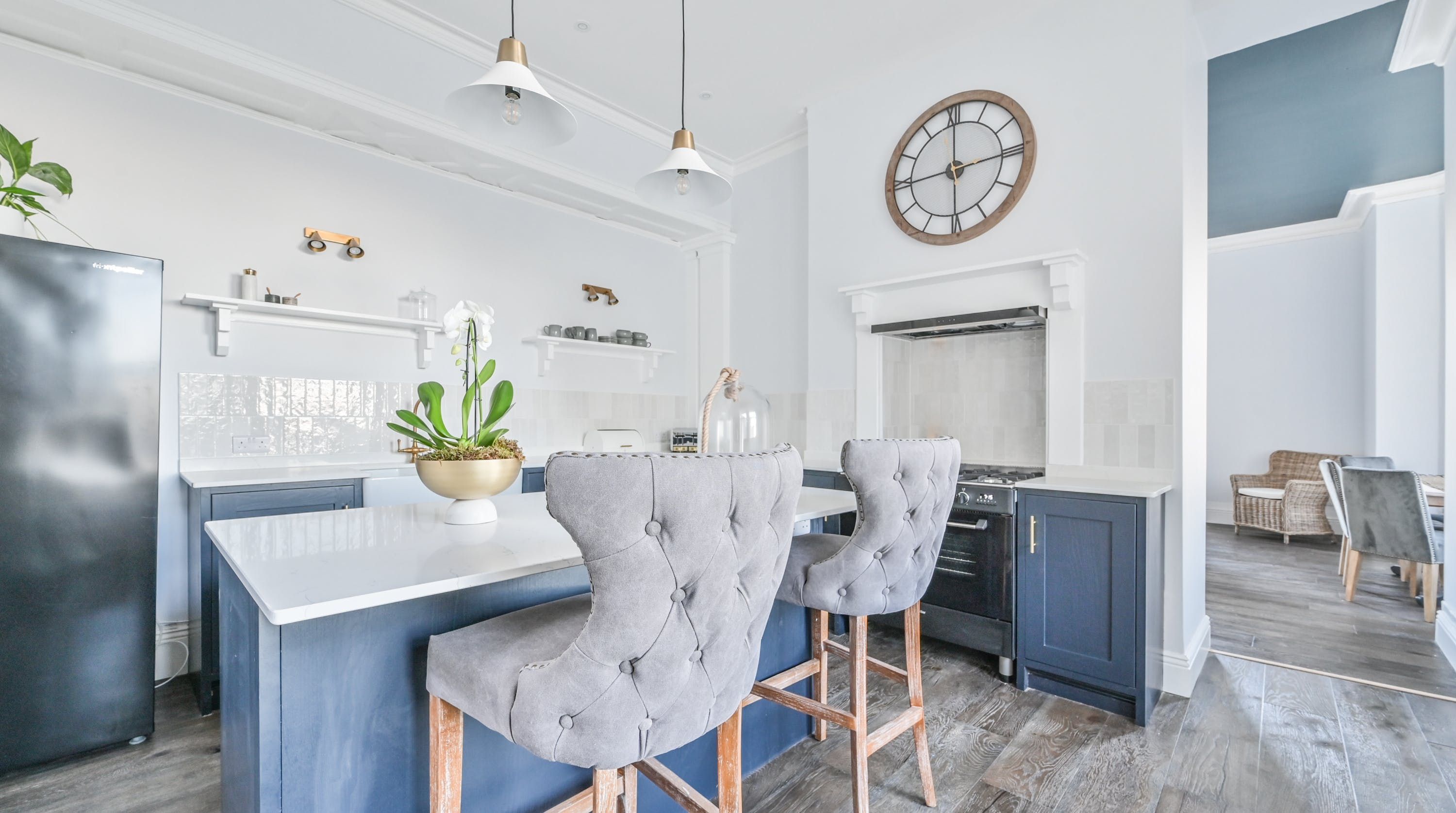 Inside, find plush furnishings in muted greys, greens, and blues that come alive in the natural light of the large windows. There’s an understated elegance that works beautifully alongside the modern and homely elements of this home. You can probably see yourself at the kitchen counter, enjoying a cup of coffee as you wait for the rest of the group to join you at the dining table for breakfast.
