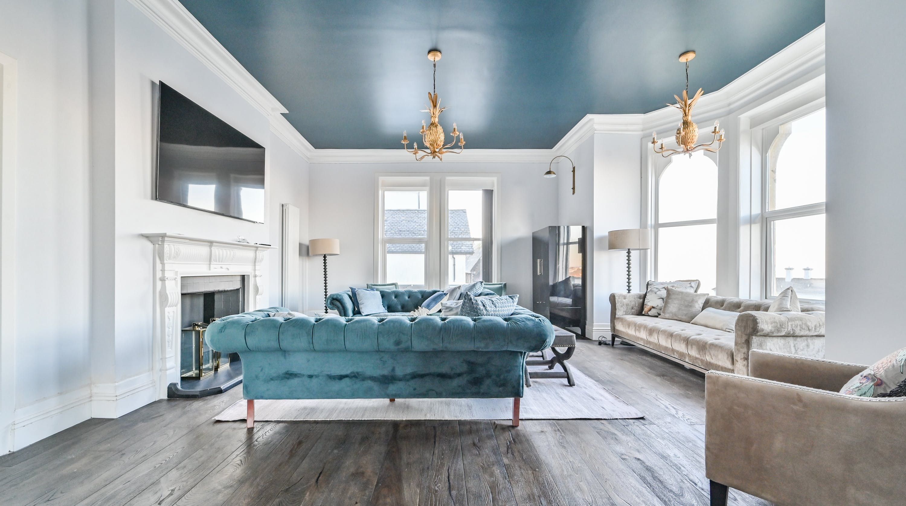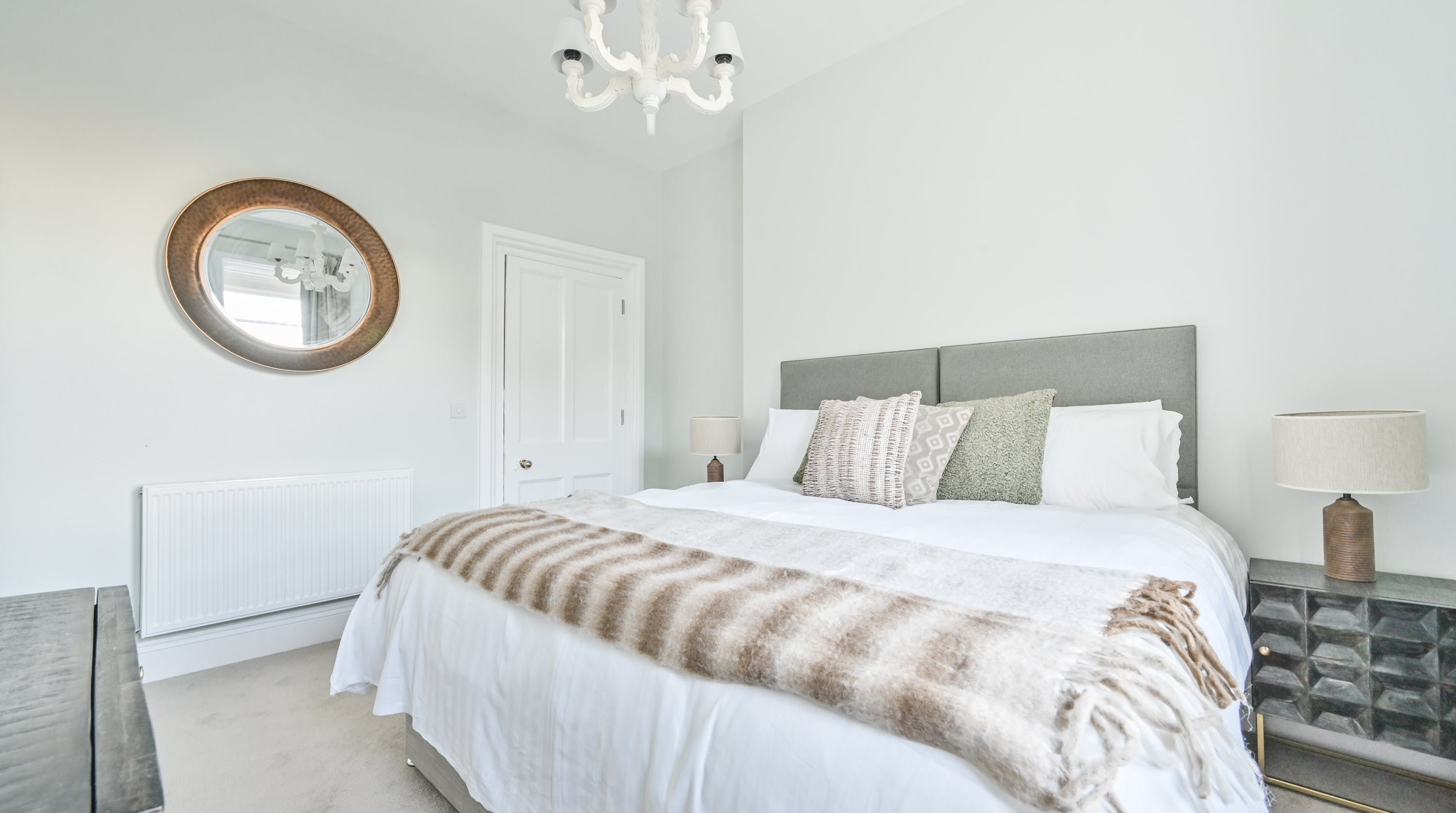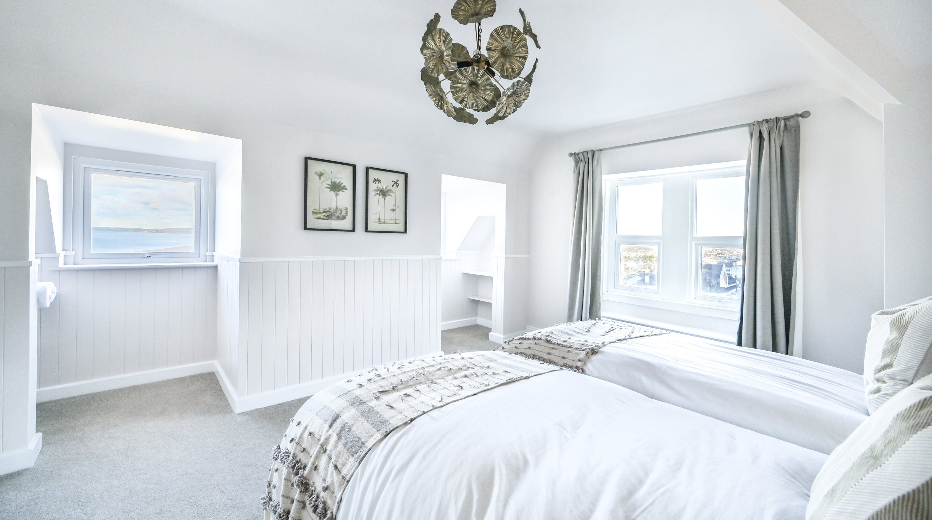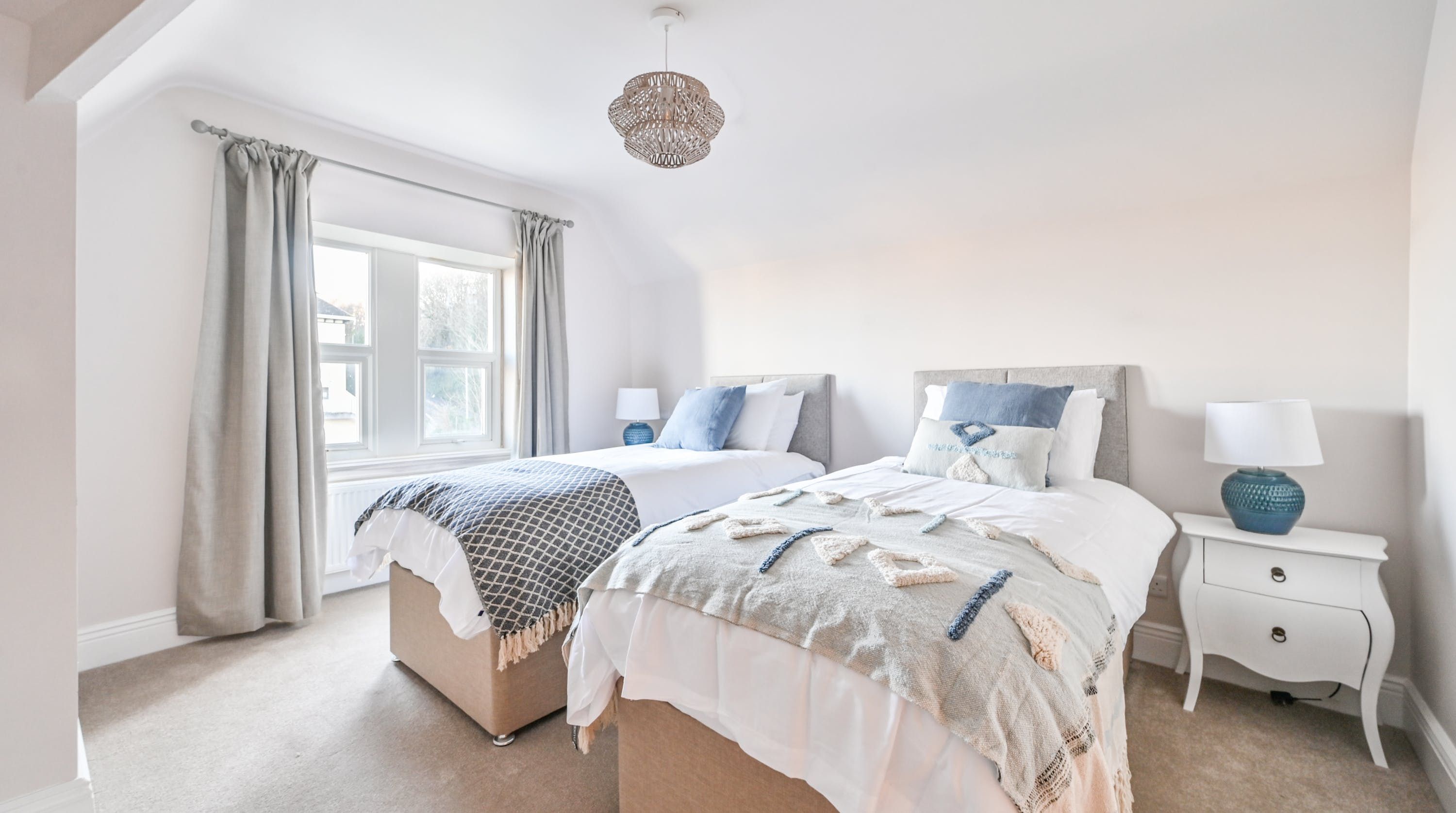 Inside, find plush furnishings in muted greys, greens, and blues that come alive in the natural light of the large windows. There’s an understated elegance that works beautifully alongside the modern and homely elements of this home. You can probably see yourself at the kitchen counter, enjoying a cup of coffee as you wait for the rest of the group to join you at the dining table for breakfast.