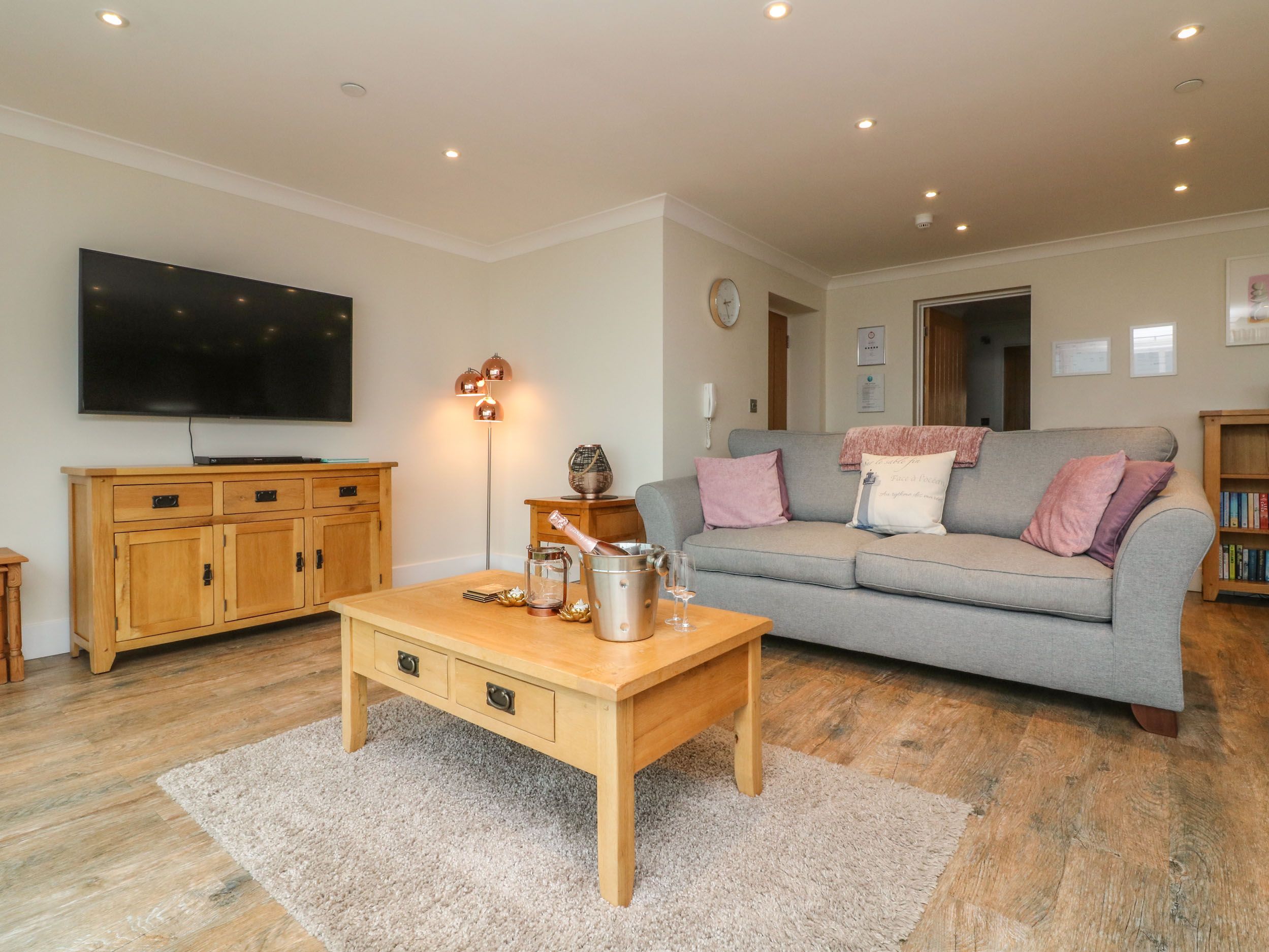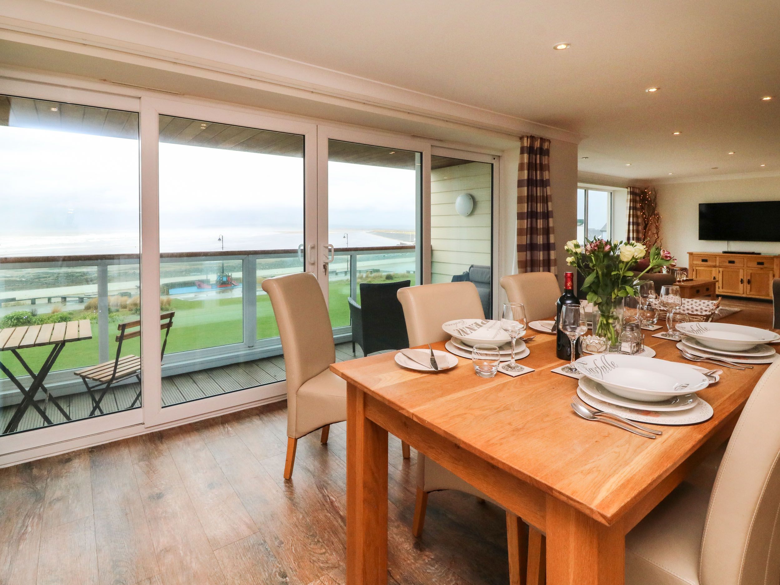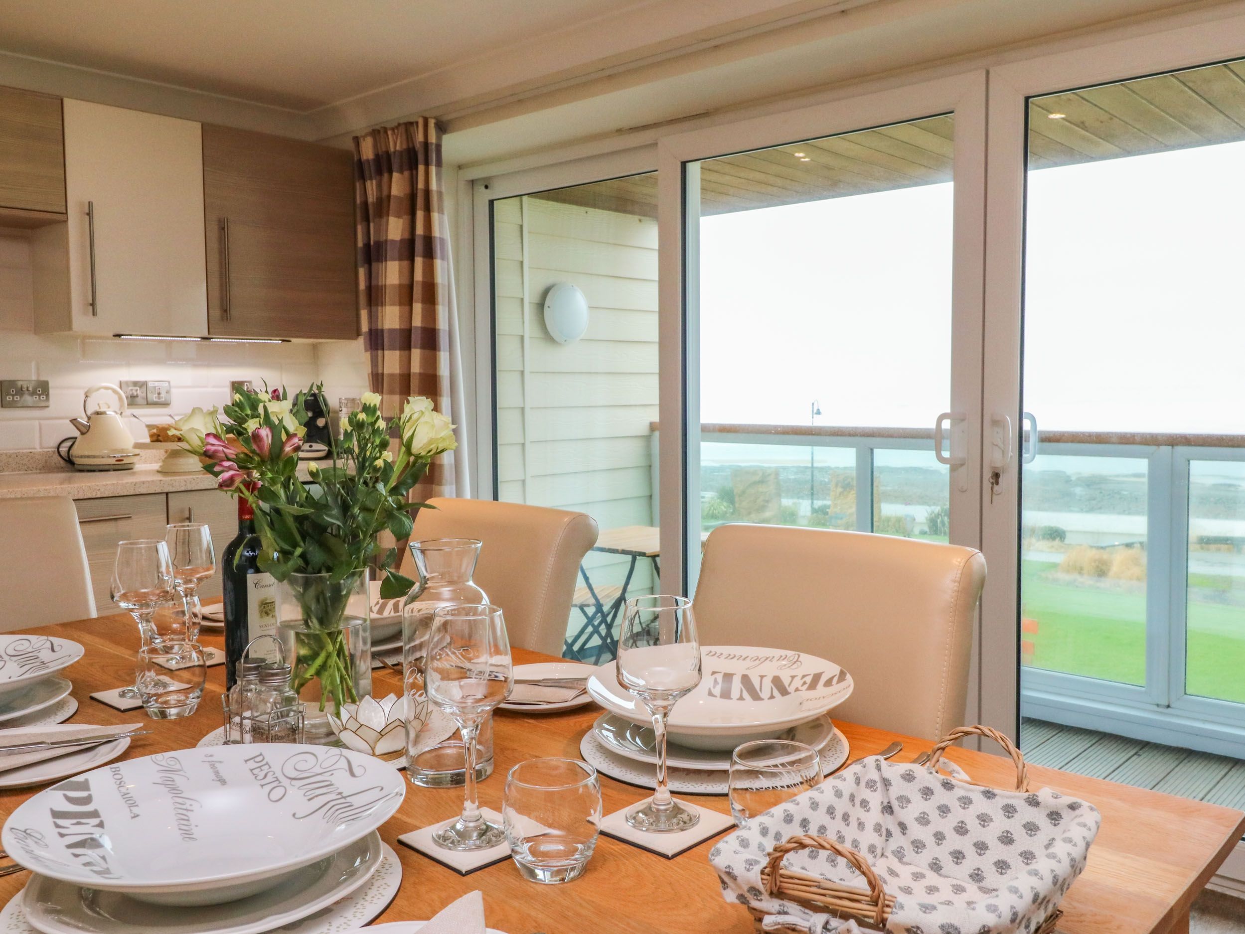 Amenities Underfloor heating. Electric oven, gas hob, microwave, fridge/freezer, wine cooler, washer/dryer, dishwasher, coffee machine. Smart TV, selection of DVDs, games and books, WiFi. Complementary cream tea on arrival. Fuel and power inc. in rent. Bed linen and towels inc. in rent. Travel cot and highchair available. Gated secure off-road parking for 1 car. Private front balcony with furniture. Secure surf store. Sorry, no pets and no smoking. Shop and pub 0.1 miles, beach 1.3 miles. Note: Check-in from 3:30pm, check-out at 10am
