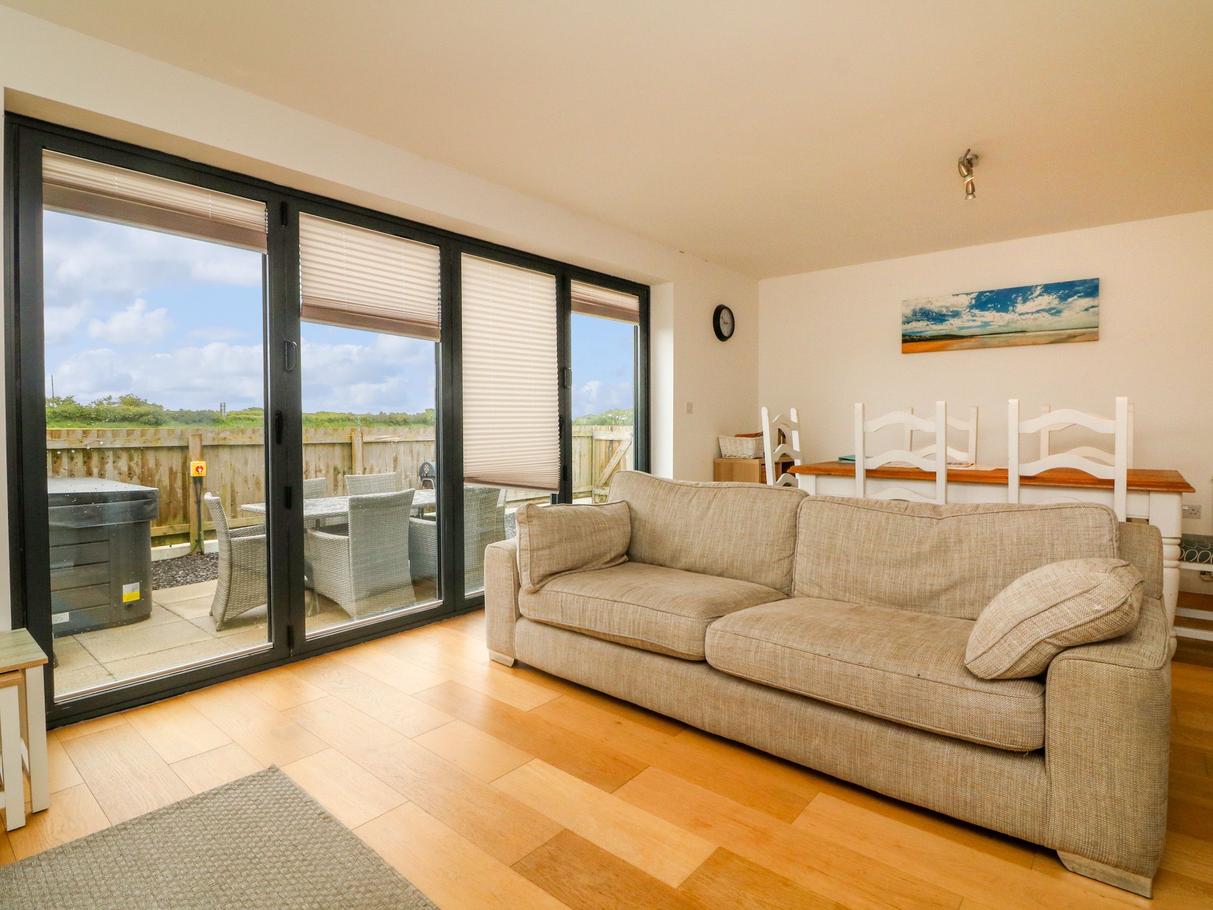Holiday home 9 Coastguard Cottages has two doubles and a twin serviced by a bathroom with bath and shower over, basin, heated towel rail and WC and a ground-floor wet room with walk-in shower, basin, heated towel rail and WC. There’s a utility with washing machine and tumble dryer. There’s an open-plan living space with a kitchen equipped with an electric oven and hob, microwave, fridge, freezer, dishwasher, kettle and toaster, a dining area and sitting area with Smart TV. WiFi, fuel and power, bed linen and towels are included in the rent. A highchair and travel cot are available on request. Outside there’s allocated parking spaces for 2 cars and an enclosed wraparound garden with lawned area and patio with furniture and hot tub. Pet-friendly. Sorry, no smoking. Shop 0.3 miles, pub 0.6 miles, beach 2.8 miles. Bring your loved ones to 9 Coastguard Cottages year after year. Note: Check-in is from 4pm, check-out by 10am. Note: There's a step up to the entrance
