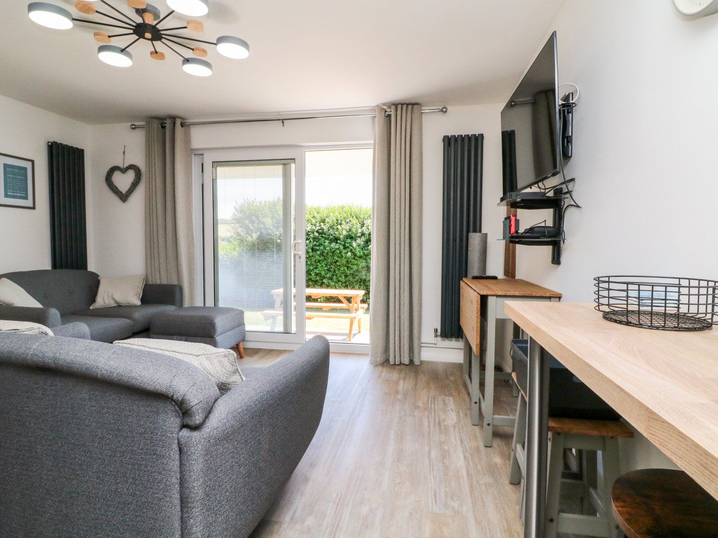 Accomodation Details Single-storey. Two bedrooms: 1 x double, 1 x bunk. Bathroom with bath, shower over, basin, heated towel rail, and WC. Open-plan living space with kitchen, dining area and sitting area