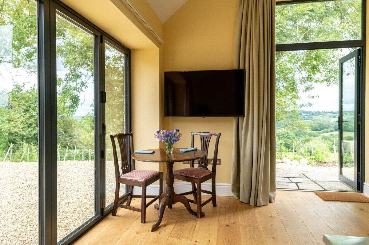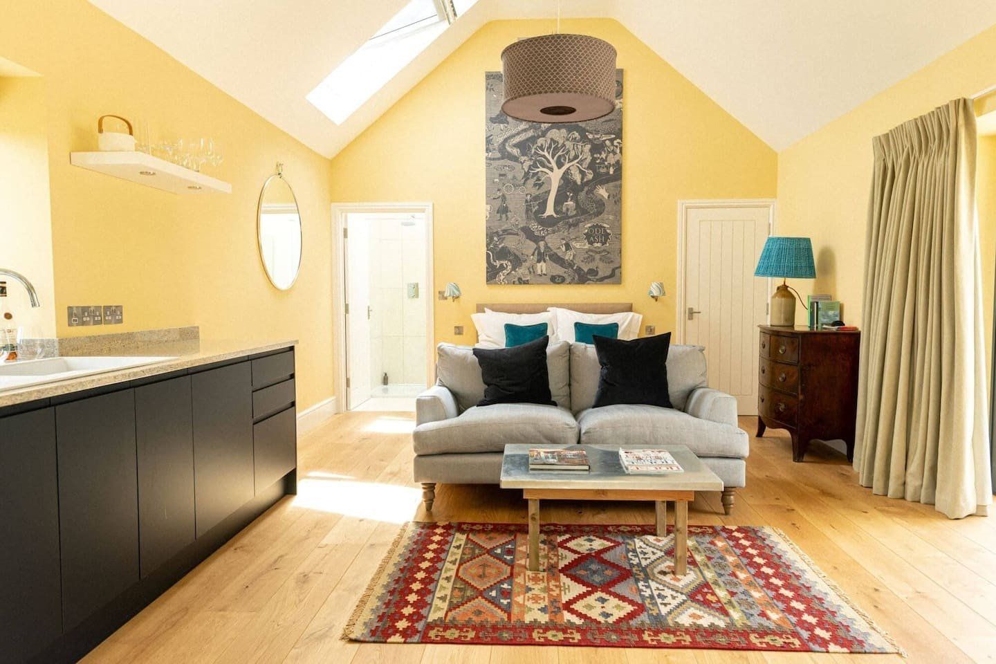 This recently remodelled home on the Devon/Dorset border is perfect for a countryside retreat. Positioned on the edge of a historic, seventeenth-century farm, just a short way from Lambert’s Castle and five miles from Lyme Regis and Charmouth on the Jurassic coast, the area promises exciting day trips and outstanding natural beauty. Whether you’re after rural rambles or swimming in the sea, there's something to pique your interest. Inside, underfloor heating means you'll be toasty warm no matter the weather, while floor-to-ceiling windows ensure guests enjoy a splendid view from every corner of the home. Food is important to your chef host, so despite the compact size of the kitchen it contains everything you could need. We'd definitely recommend sampling charcuterie made from his rare breed pigs and you'll be supplied with farm fresh eggs on arrival. The comfortable bed is perfectly positioned to catch a glimpse of the stars through remote-controlled skylight