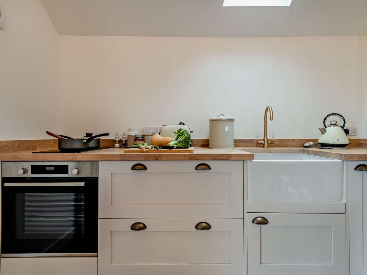 Step inside to discover a light and airy open-plan studio-style space boasting original wooden beams and a vaulted ceiling, where a fully equipped kitchen area awaits, complete with a dining table for intimate meals.