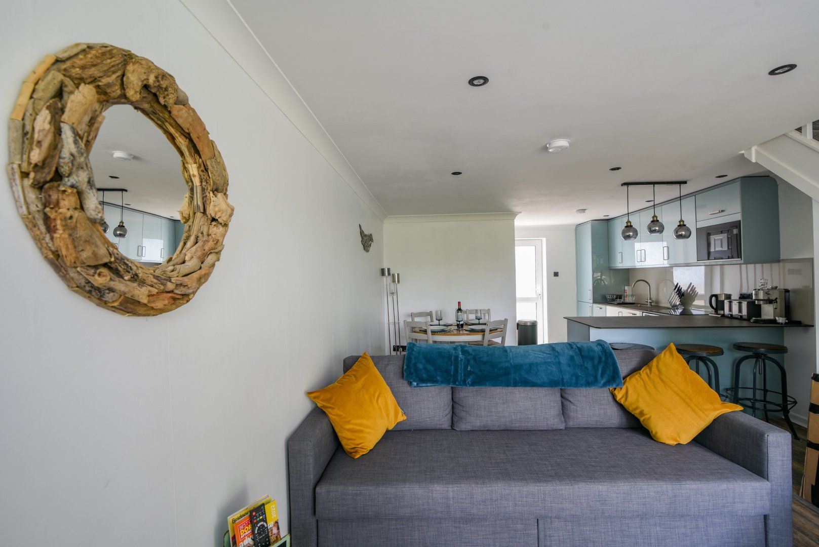 Two bedrooms: 1 x king-size, 1 x twin. Bathroom with bath, shower over, basin and WC. Ground-floor shower room with walk-in shower, basin, and WC. Open-plan living space with kitchen, dining area and sitting area with double sofa bed